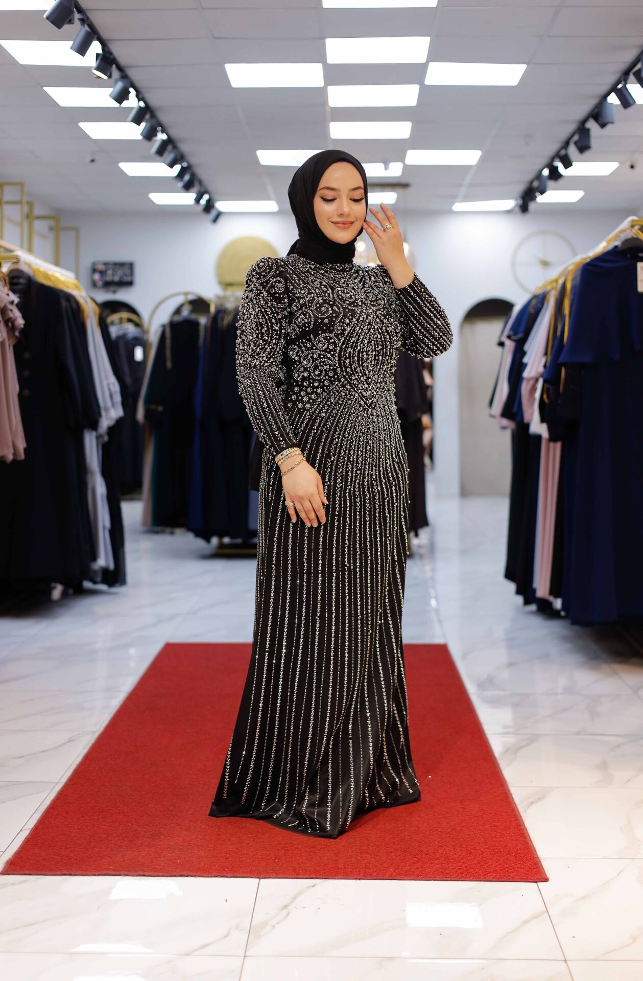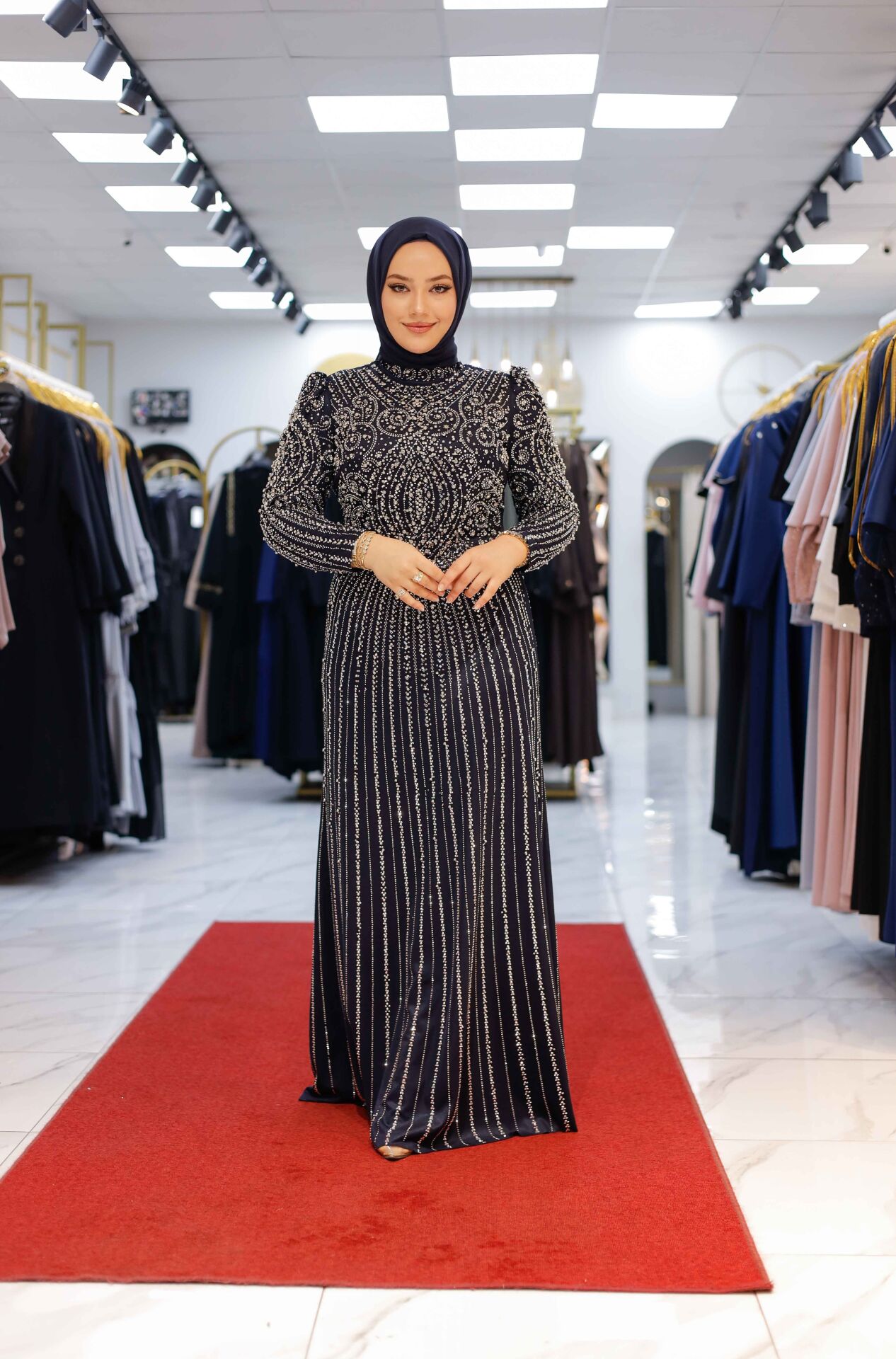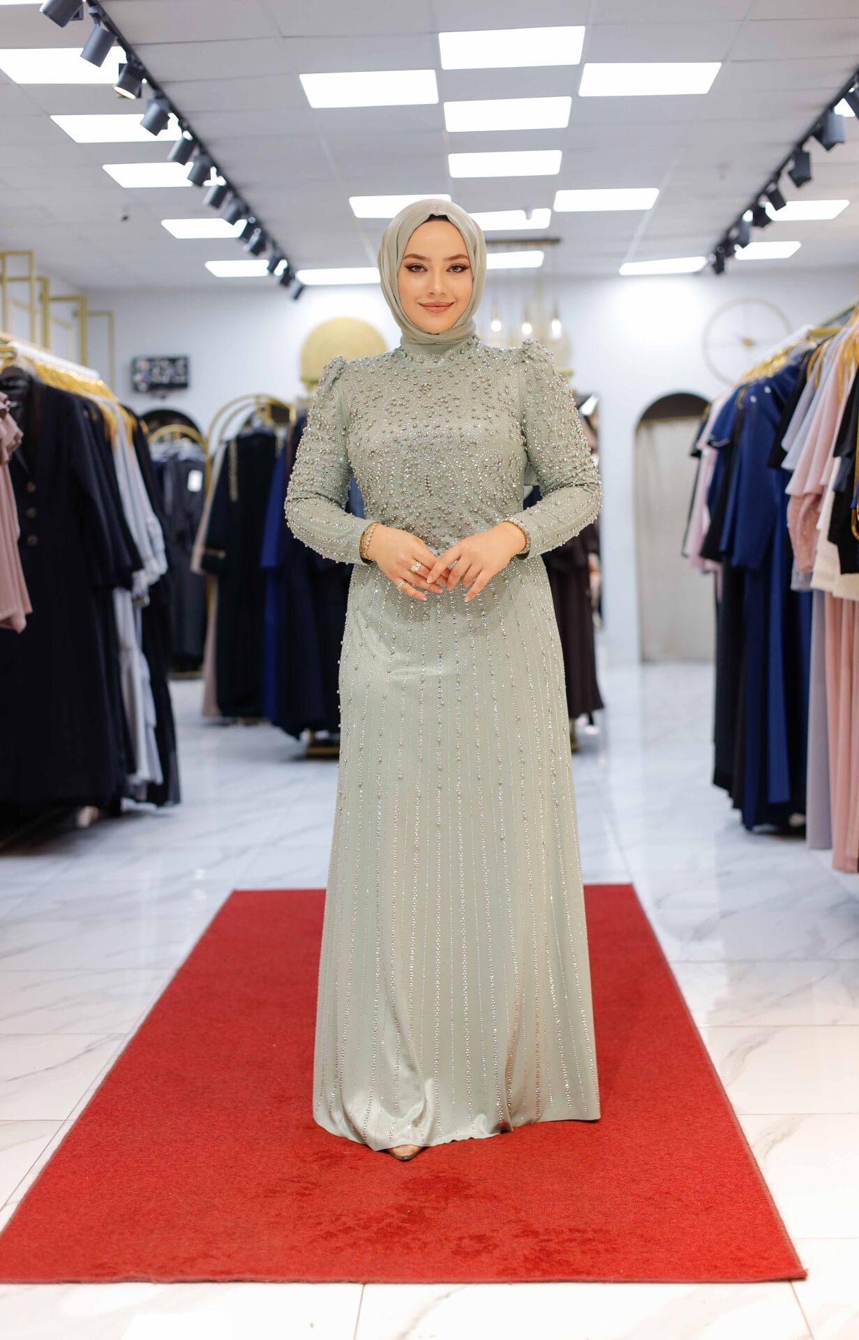 Vücuda zarif şekilde oturan kesimi, feminen formu ön plana çıkarırken; taş detayların dengeli dağılımı tasarıma lüks bir karakter kazandırır. Abiye şıklığını modern bir çizgide yorumlayan bu model; düğün, nişan, davet ve özel organizasyonlar için ideal bir tercihtir.