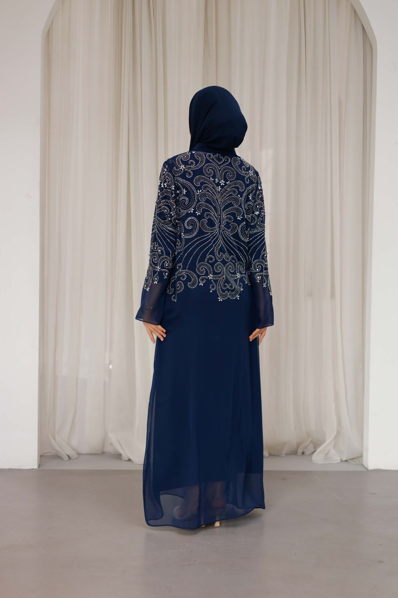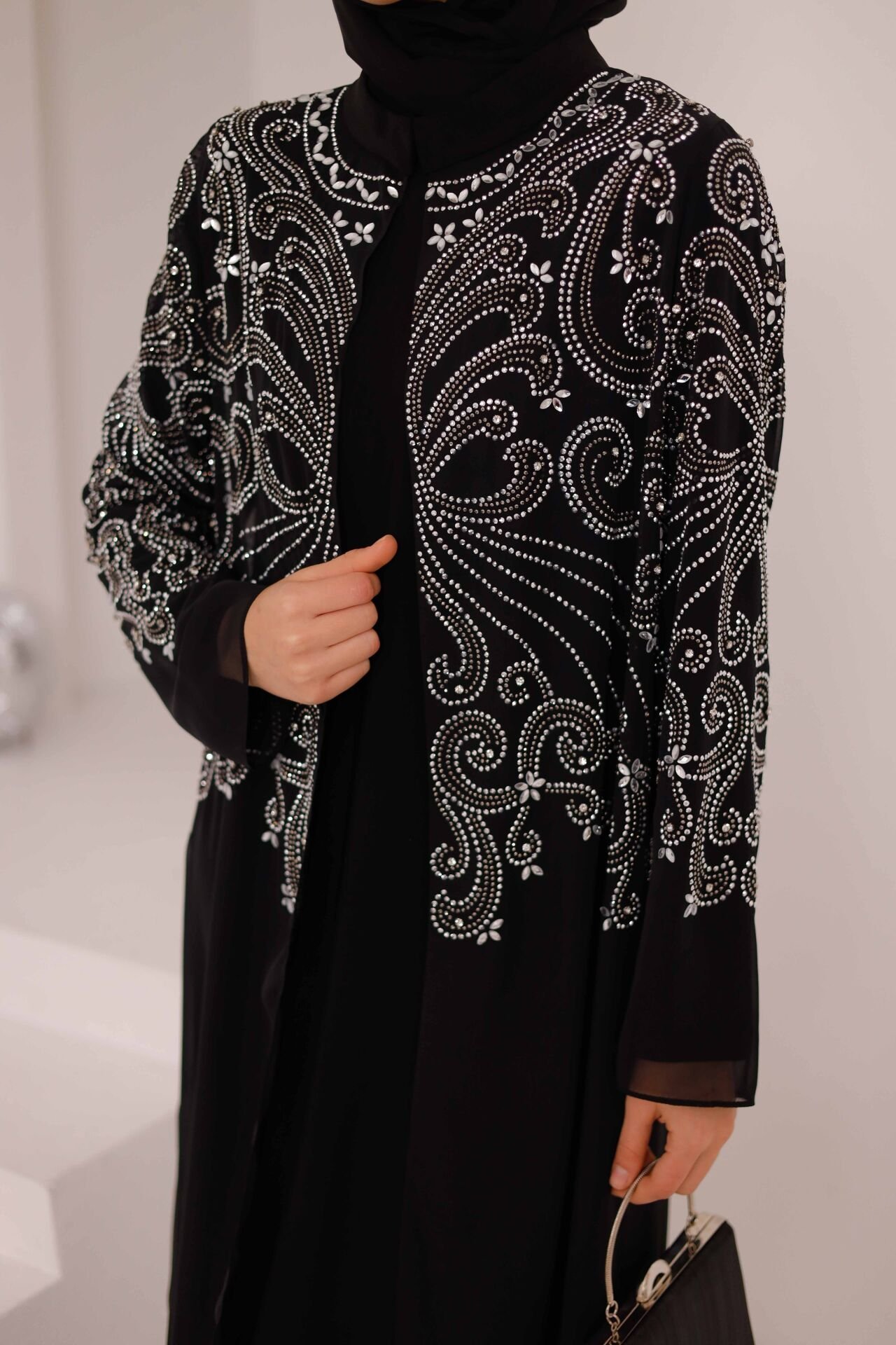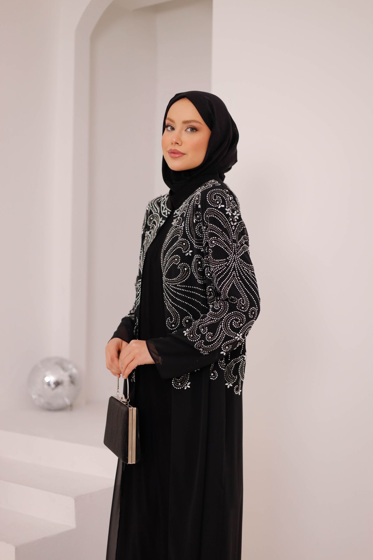 Alin Taş İşlemeli Şifon Abaya, düğün, nişan, davet ve özel organizasyonlar için ideal bir tercihtir. Zamansız tasarımı ve zarif ışıltısıyla tesettür abiye koleksiyonlarının güçlü parçalarından biridir.