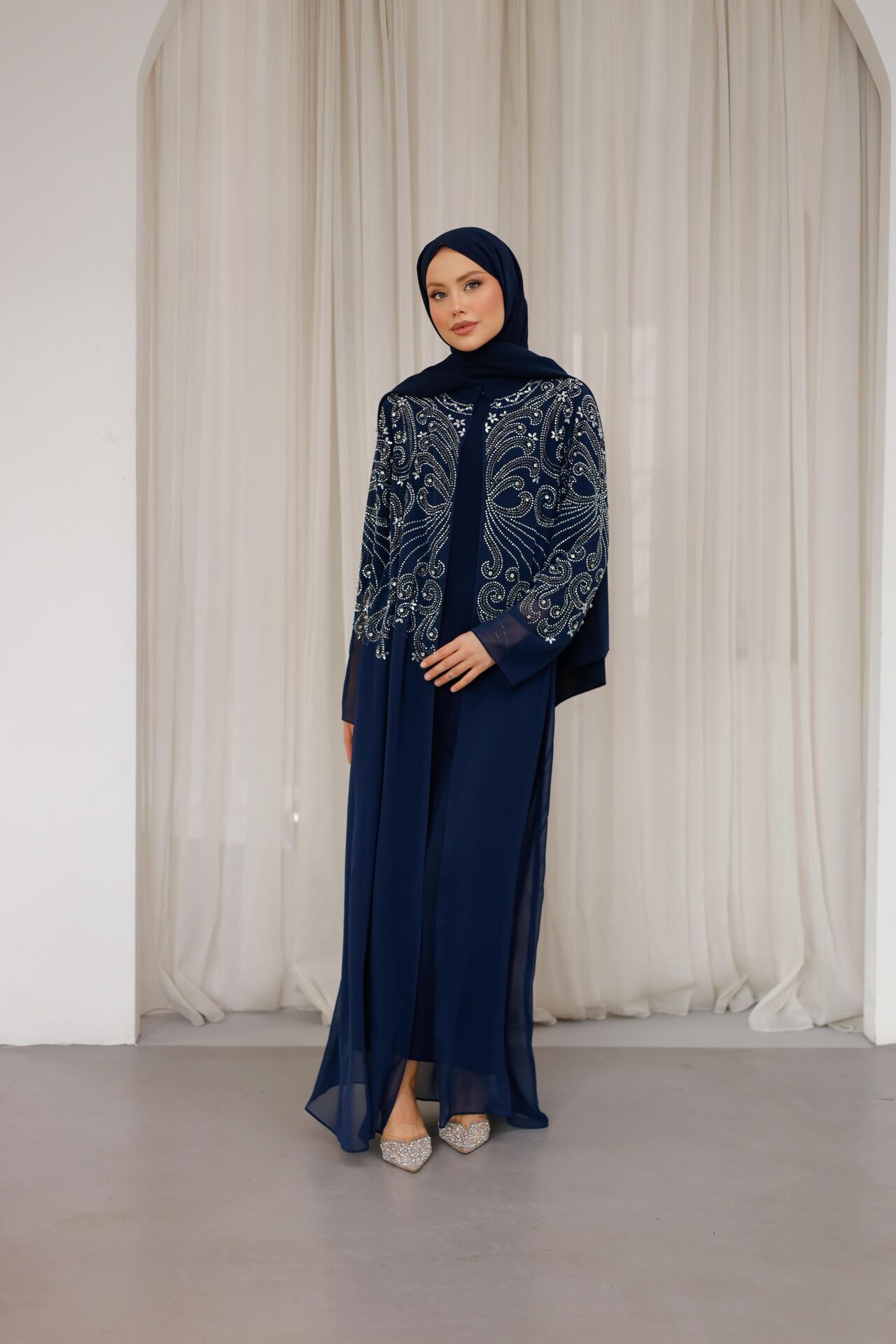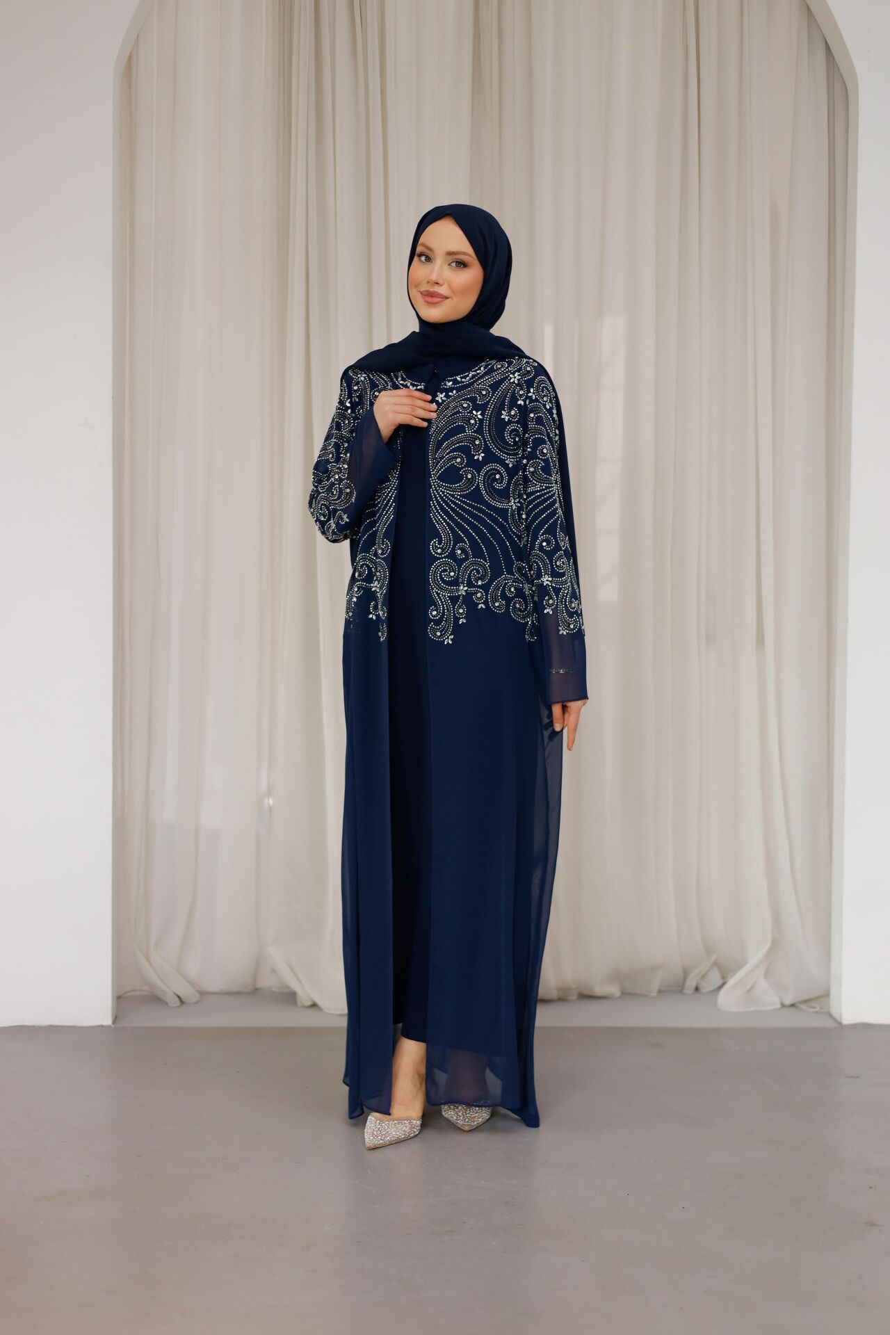 Hafif ve nefes alabilir şifon kumaşı sayesinde gün boyu konfor sunan bu model, iç elbisesiyle birlikte takım olarak tasarlanmıştır. Siyah ve lacivert renk seçenekleriyle hem klasik hem de modern tesettür stiline uyum sağlar.