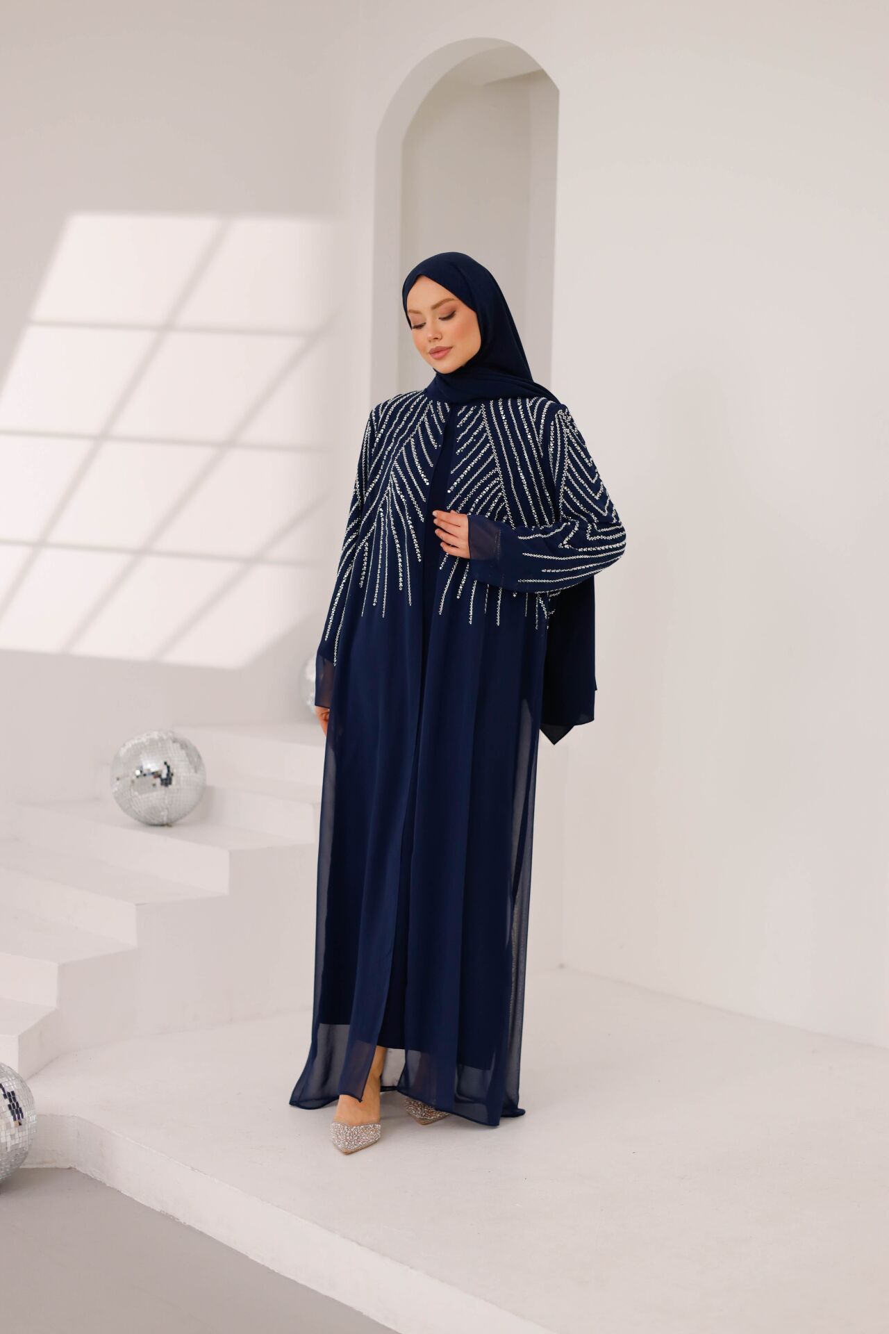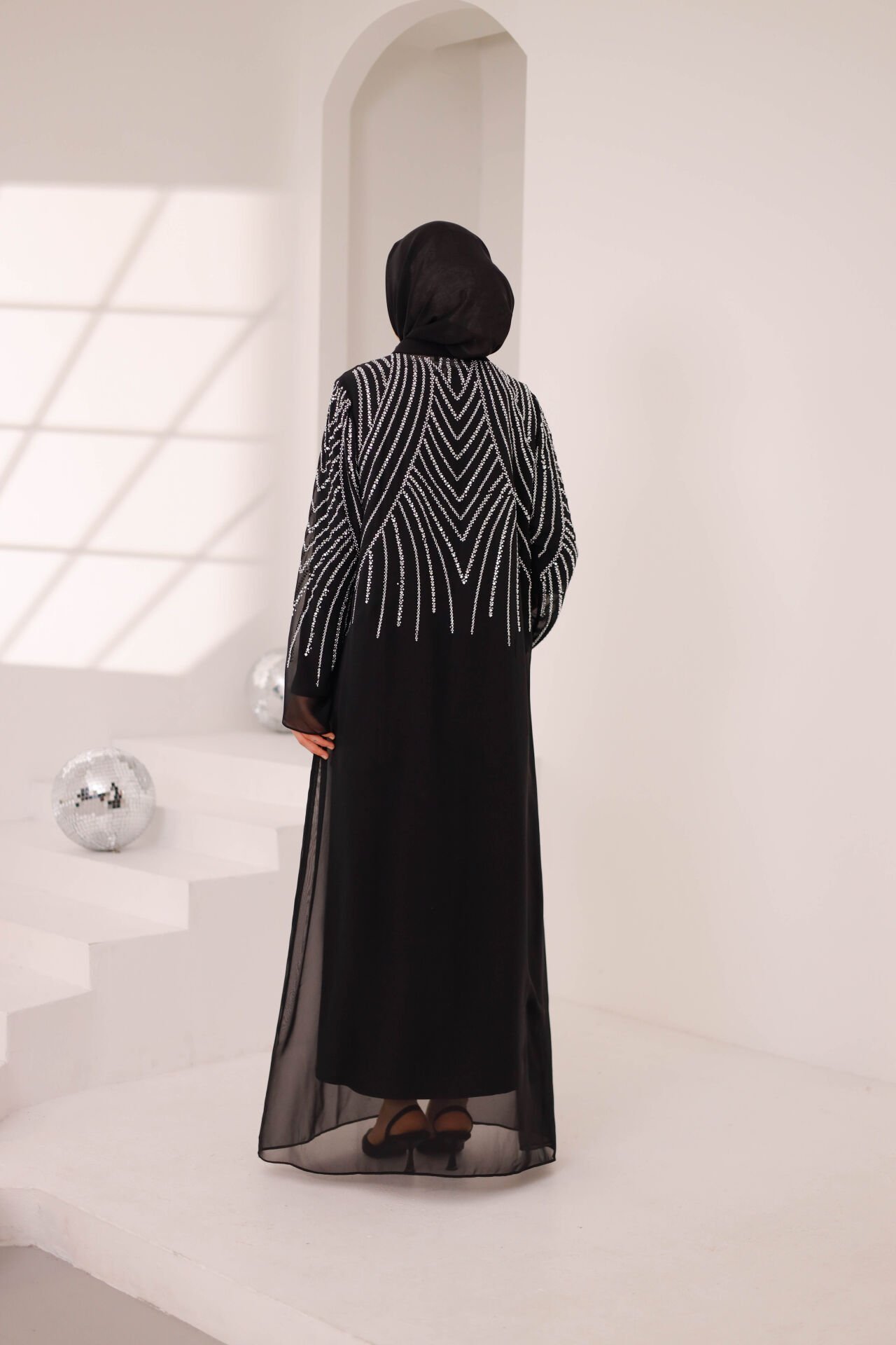 Özenle işlenen taş detaylar, abayanın üst bölümünde yoğunlaşarak zarif bir ışık oyununa dönüşür. Minimal kesimi sayesinde abartıdan uzak, sofistike bir stil sunan Arel Işıltılı Abaya; düğün, nişan, davet ve özel organizasyonlar için ideal bir tercihtir.