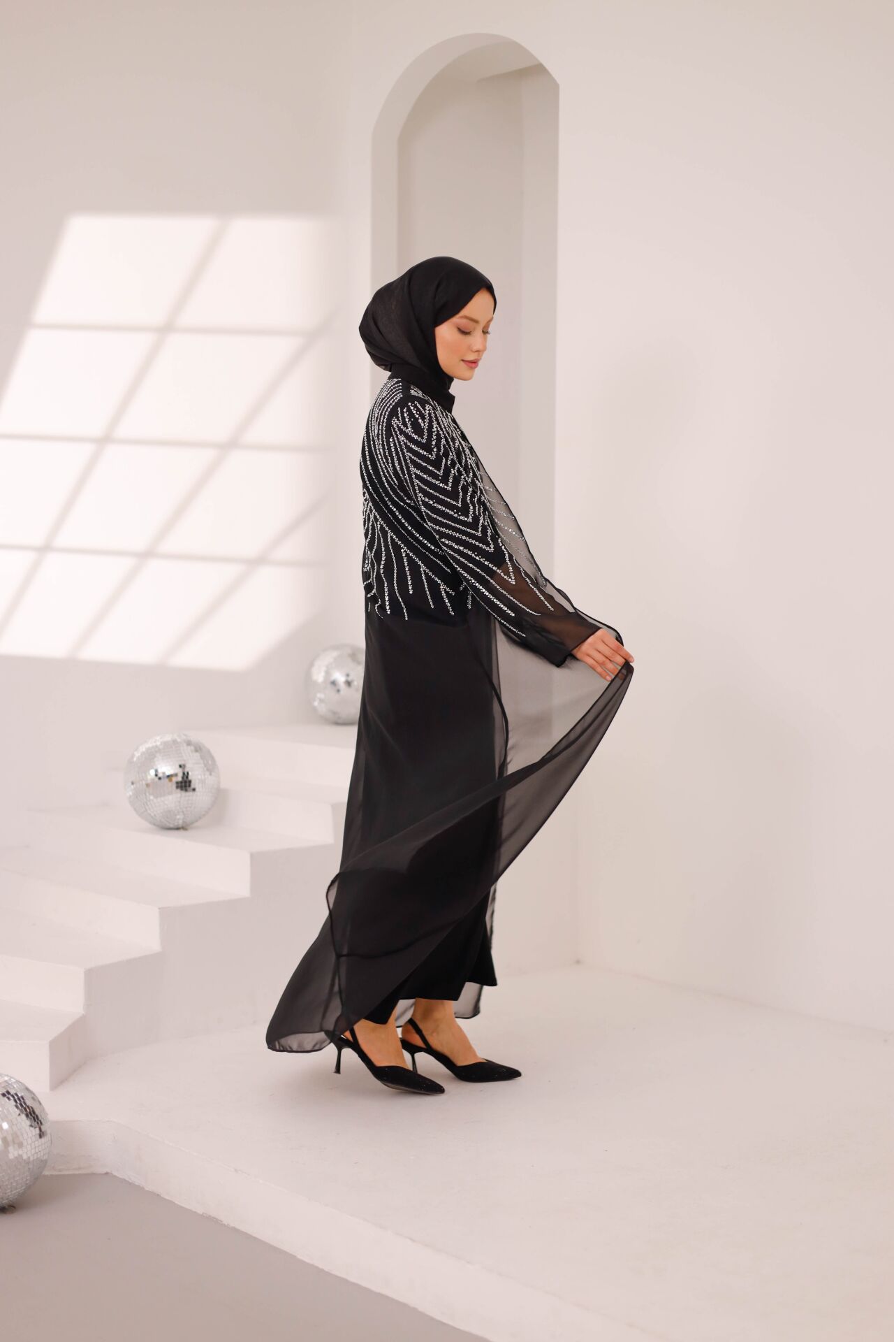 Şifon kumaşın nefes alan yapısı sayesinde gün boyu rahat bir kullanım sunan Arel Işıltılı Abaya, hem özel günlerde hem de şık davetlerde güçlü ve zarif bir duruş arayan kadınlar için tasarlanmıştır.
