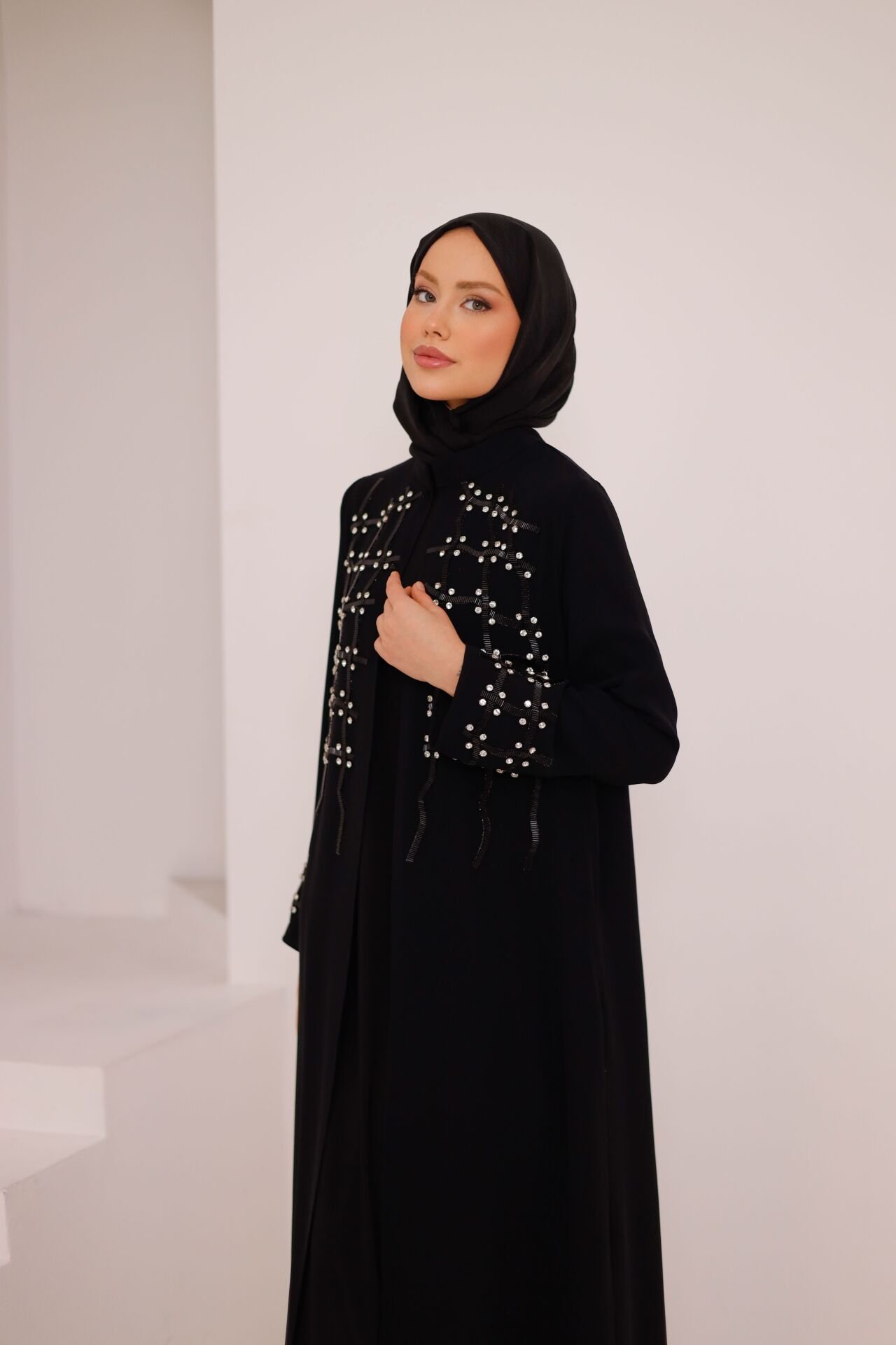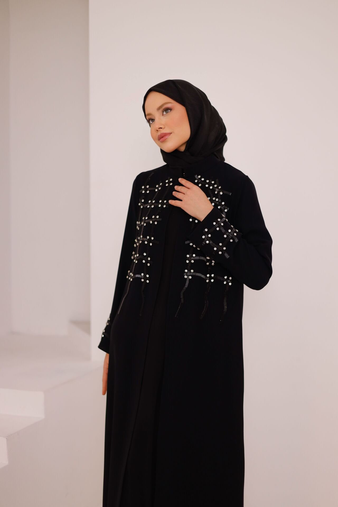 Zarif detayları ve akışkan formuyla öne çıkan Asel Şifon Abaya, özel günler ve şık davetler için tasarlanmış modern bir abaya modelidir. Şifon kumaşın hafif ve dökümlü yapısı, taş işlemeli detaylarla birleşerek asil ve feminen bir siluet oluşturur. İç elbisesiyle birlikte sunulan tasarım, hem konforlu hem de göz alıcı bir kullanım sağlar.