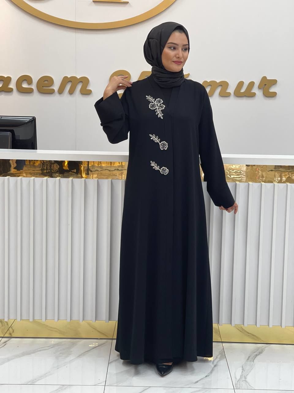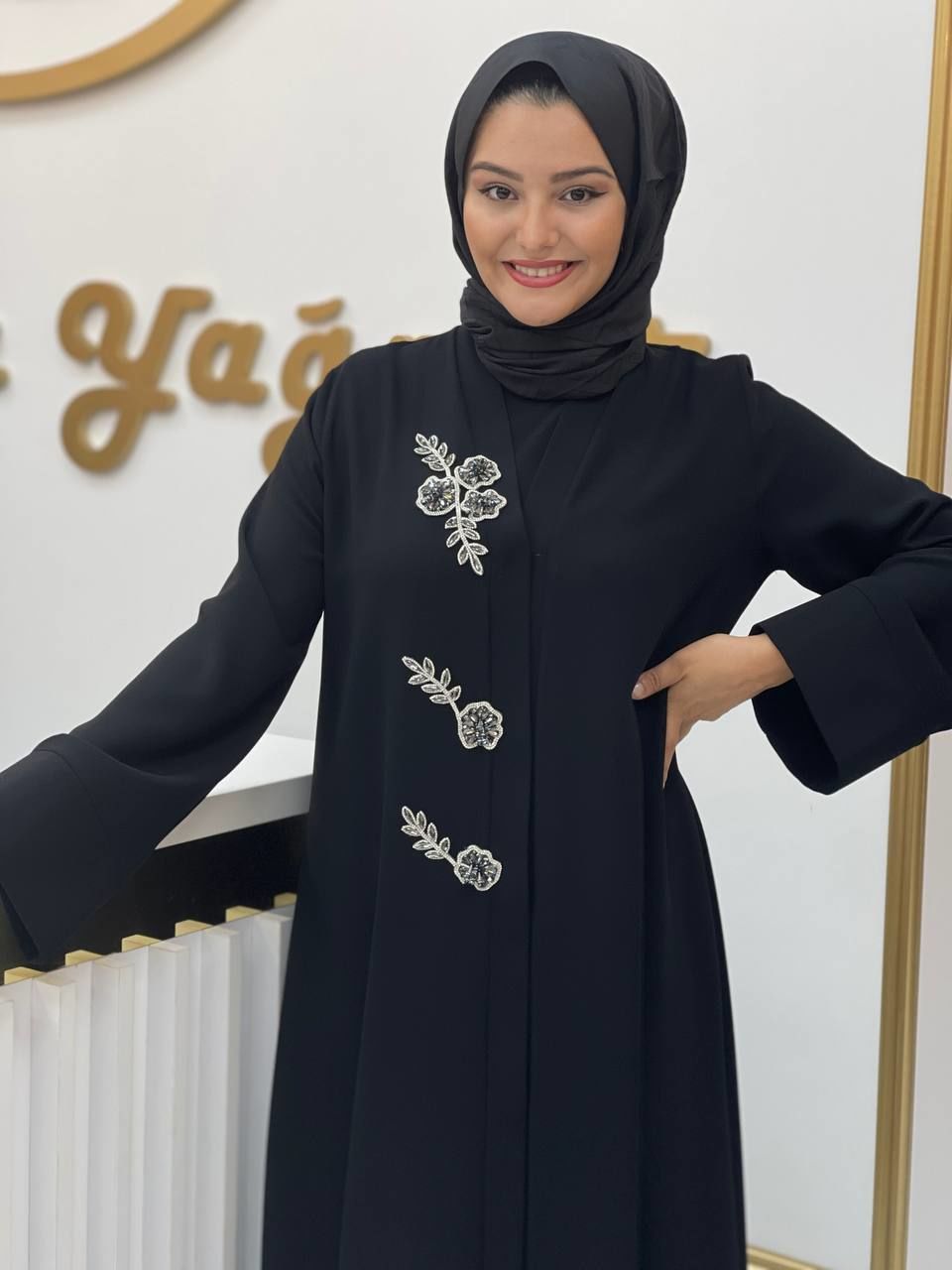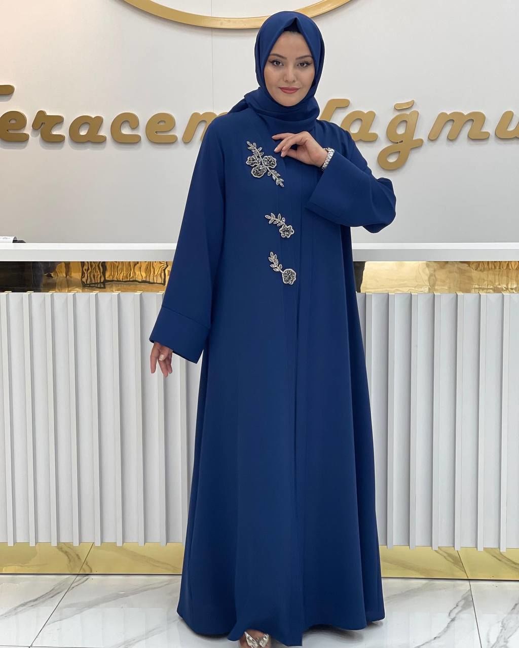 Bu özel ürün, siyah, gri, mavi veya lacivert renk seçenekleriyle sunuluyor. Yaprak ve çiçek desenleri, taşlarla doldurulmuş özel bir içlik ile birleşerek benzersiz bir görünüm sunuyor. Kişiselleştirilmiş tasarımıyla dikkat çeken Hülya abaya, zarif ve şık bir seçenek olarak öne çıkıyor.