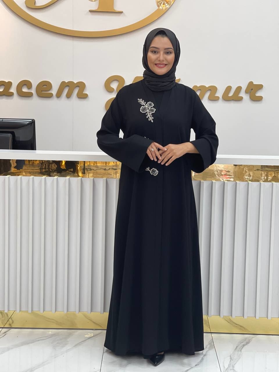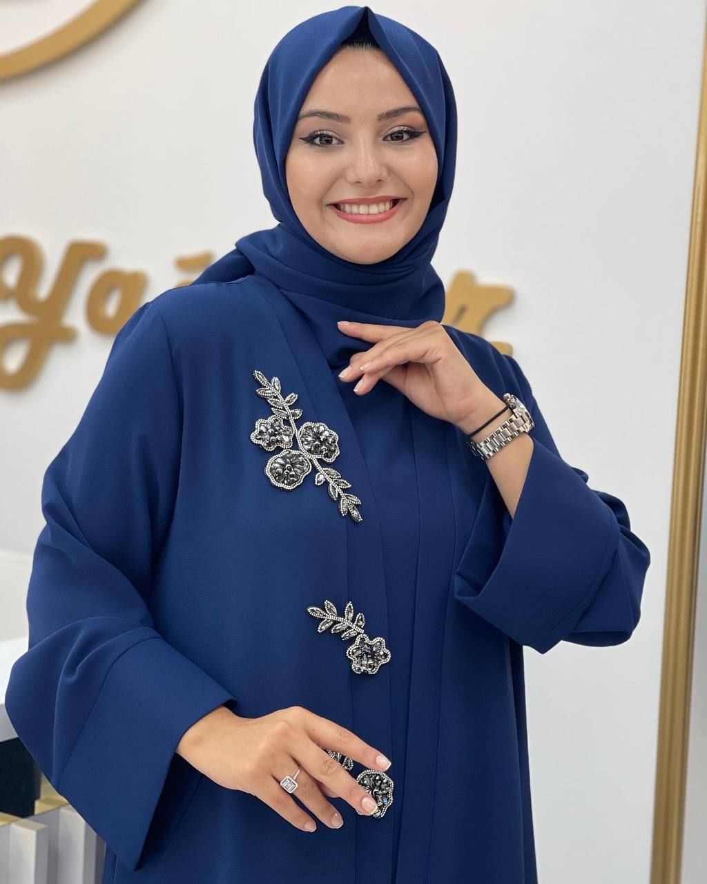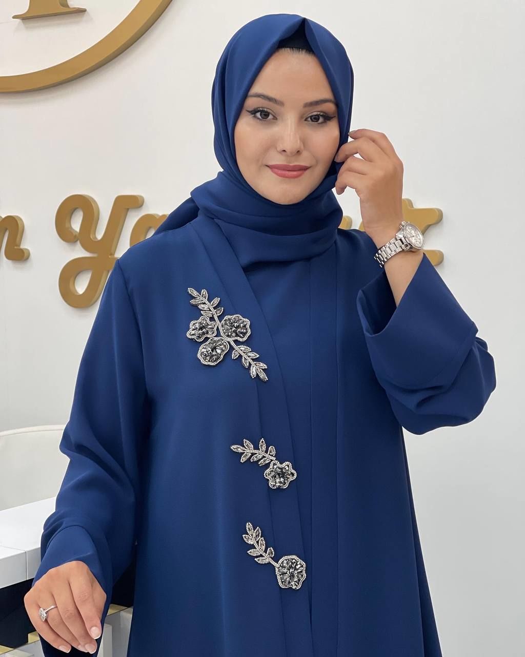 Bu özel ürün, siyah, gri, mavi veya lacivert renk seçenekleriyle sunuluyor. Yaprak ve çiçek desenleri, taşlarla doldurulmuş özel bir içlik ile birleşerek benzersiz bir görünüm sunuyor. Kişiselleştirilmiş tasarımıyla dikkat çeken Hülya abaya, zarif ve şık bir seçenek olarak öne çıkıyor.