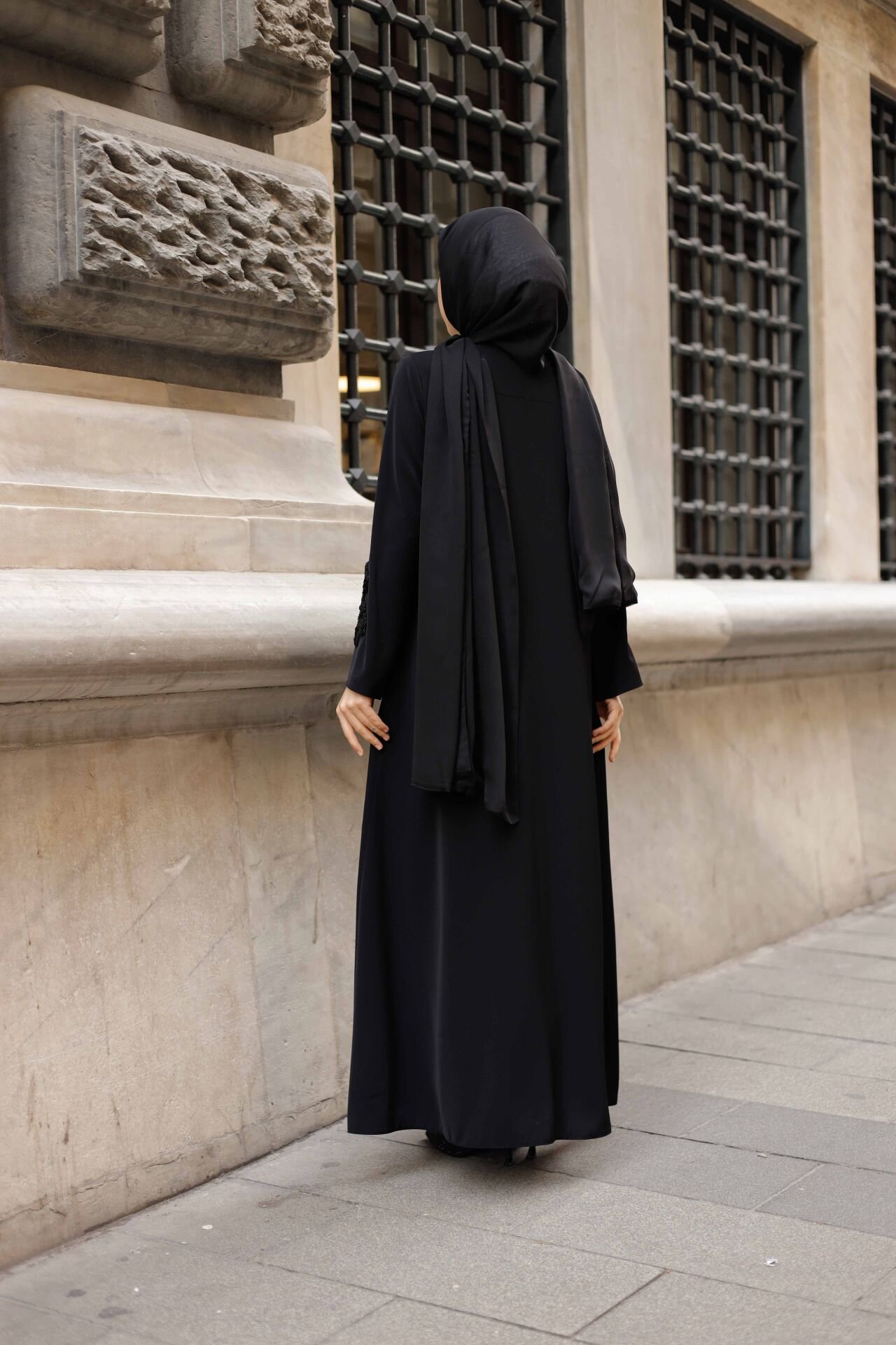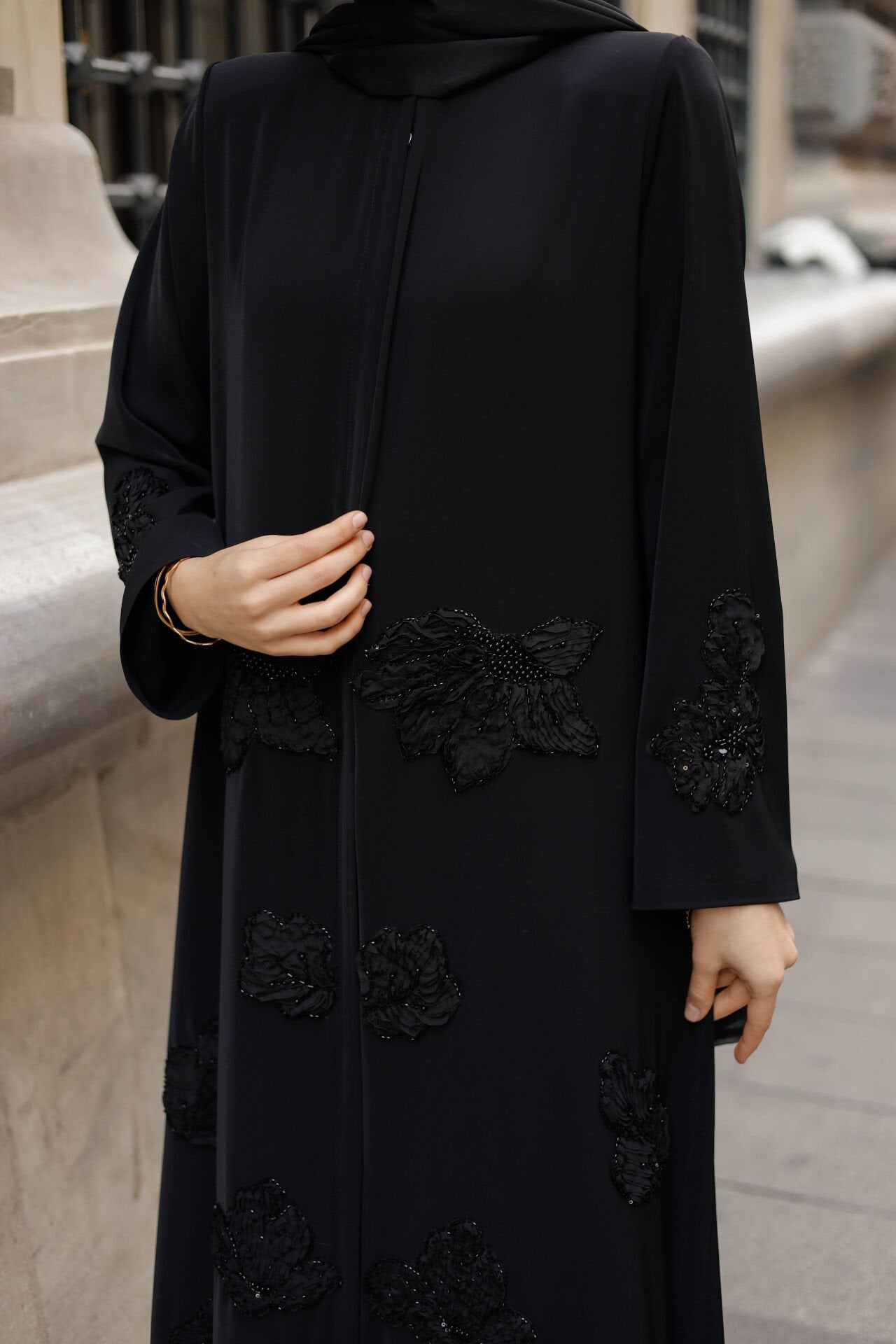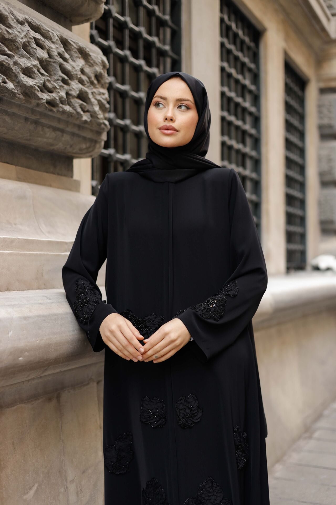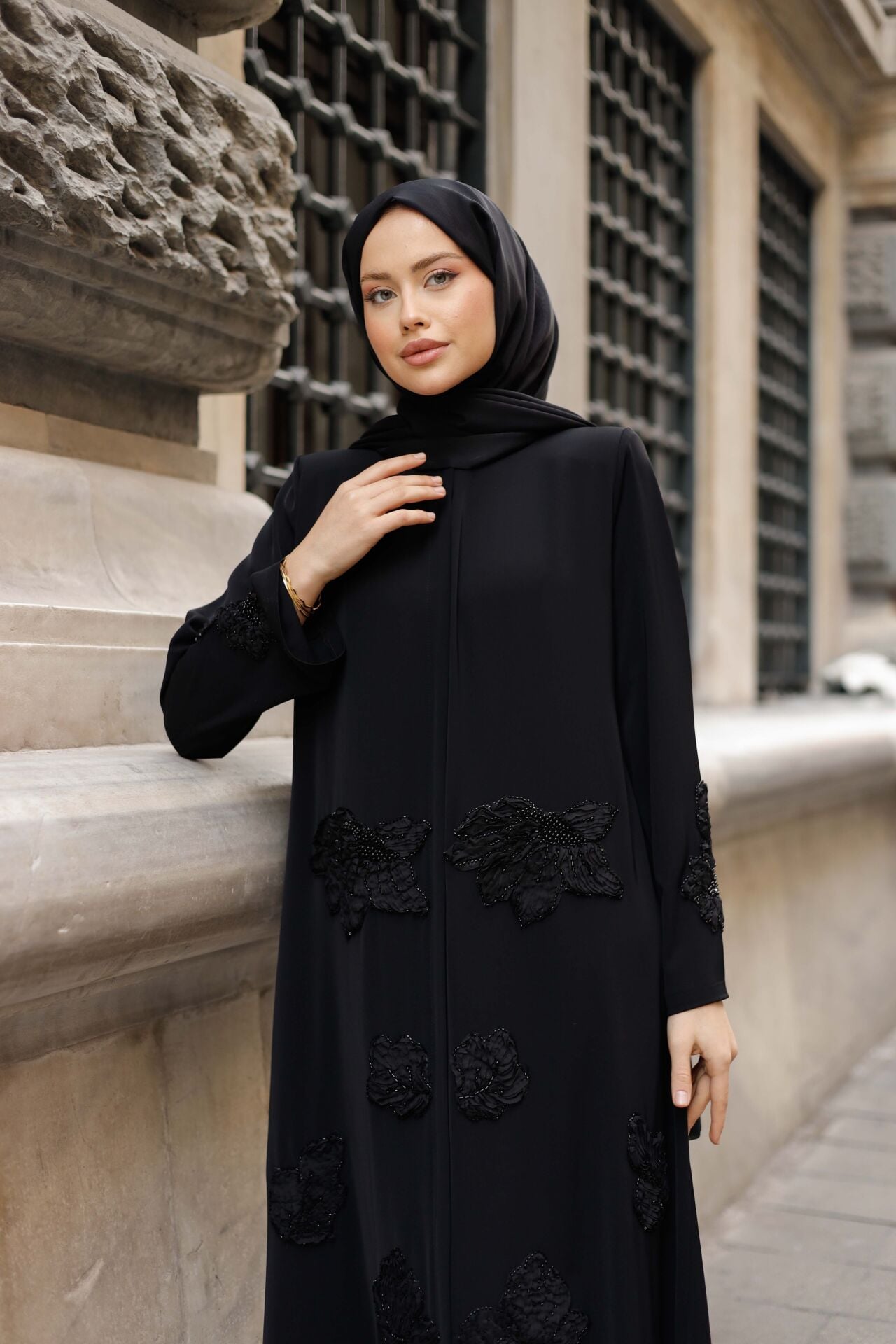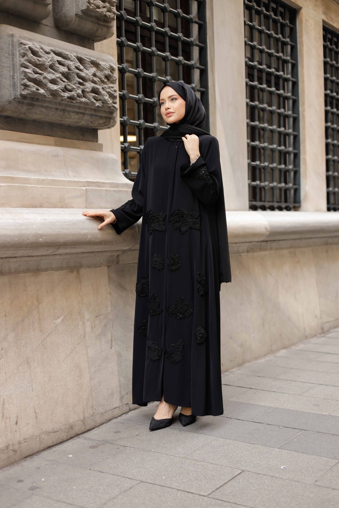 Ton Sür Ton Nakış İşçiliği: Feracenin ön ve kol kısımlarını süsleyen yoğun siyah nakış ve aplike işlemeleri, feraceye derinlikli ve zengin bir doku katar. Siyahın üzerine siyah desenler, sofistike ve iddialı bir zarafet yaratır.