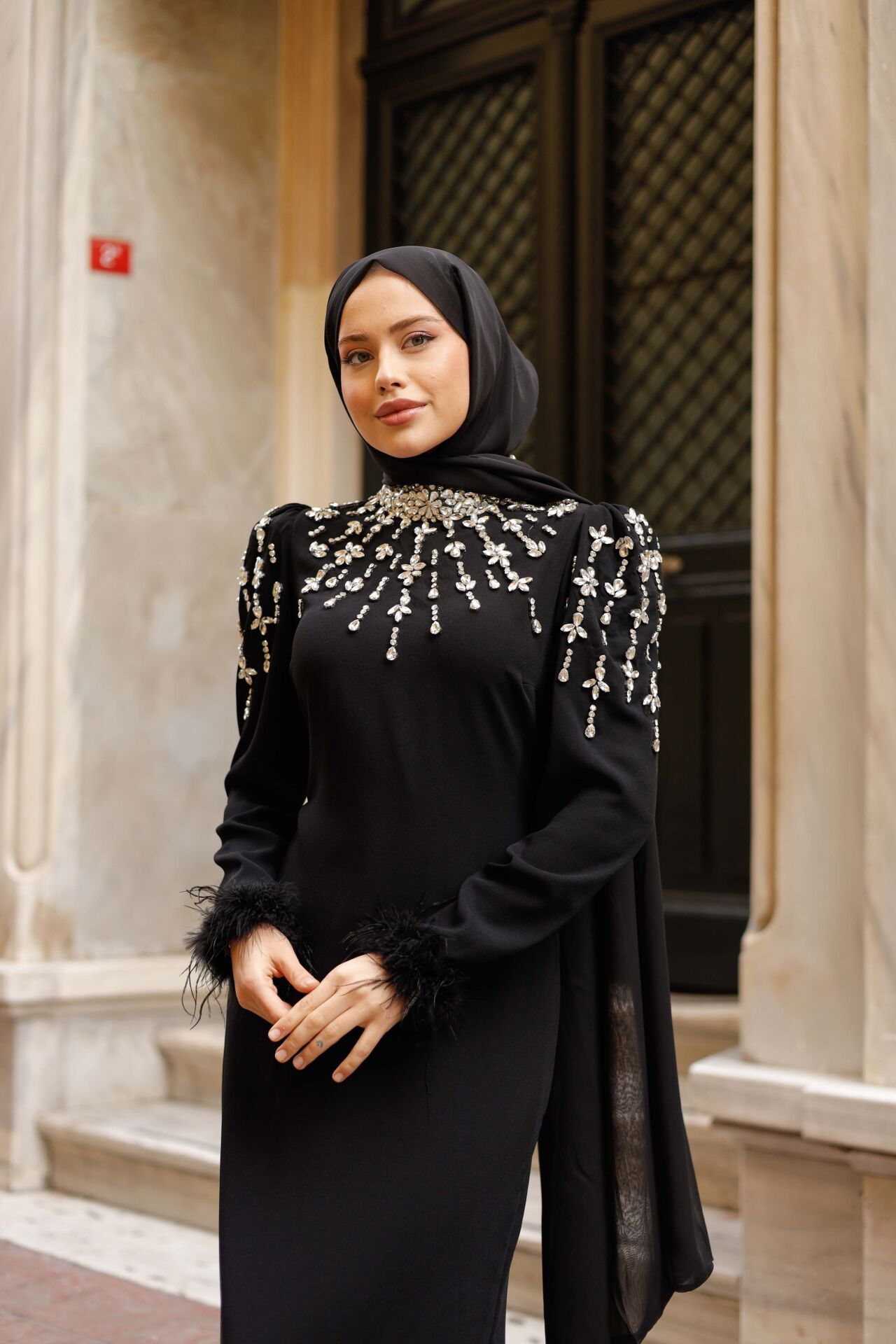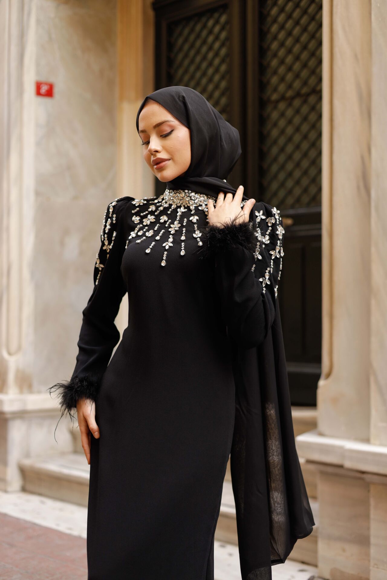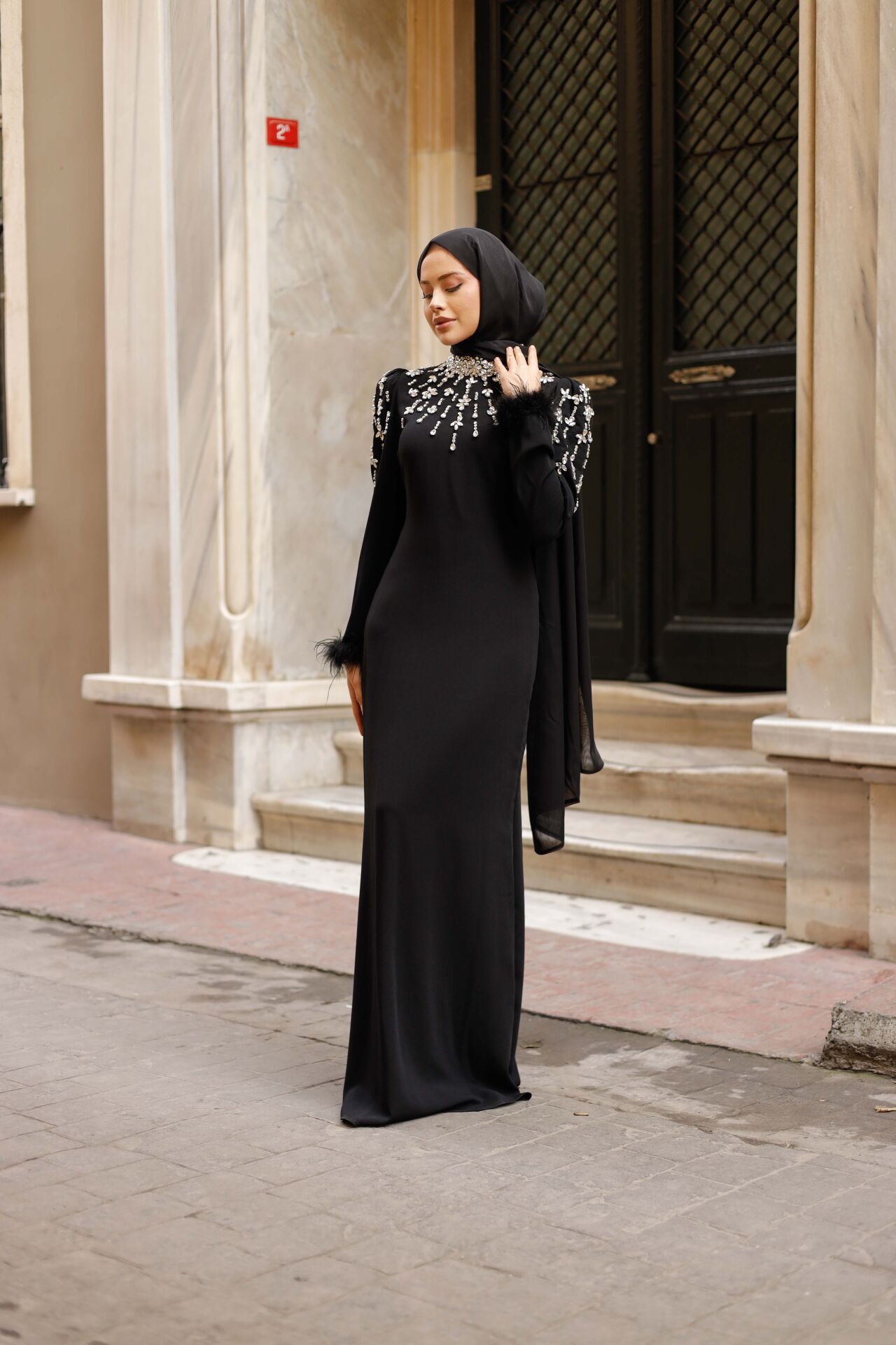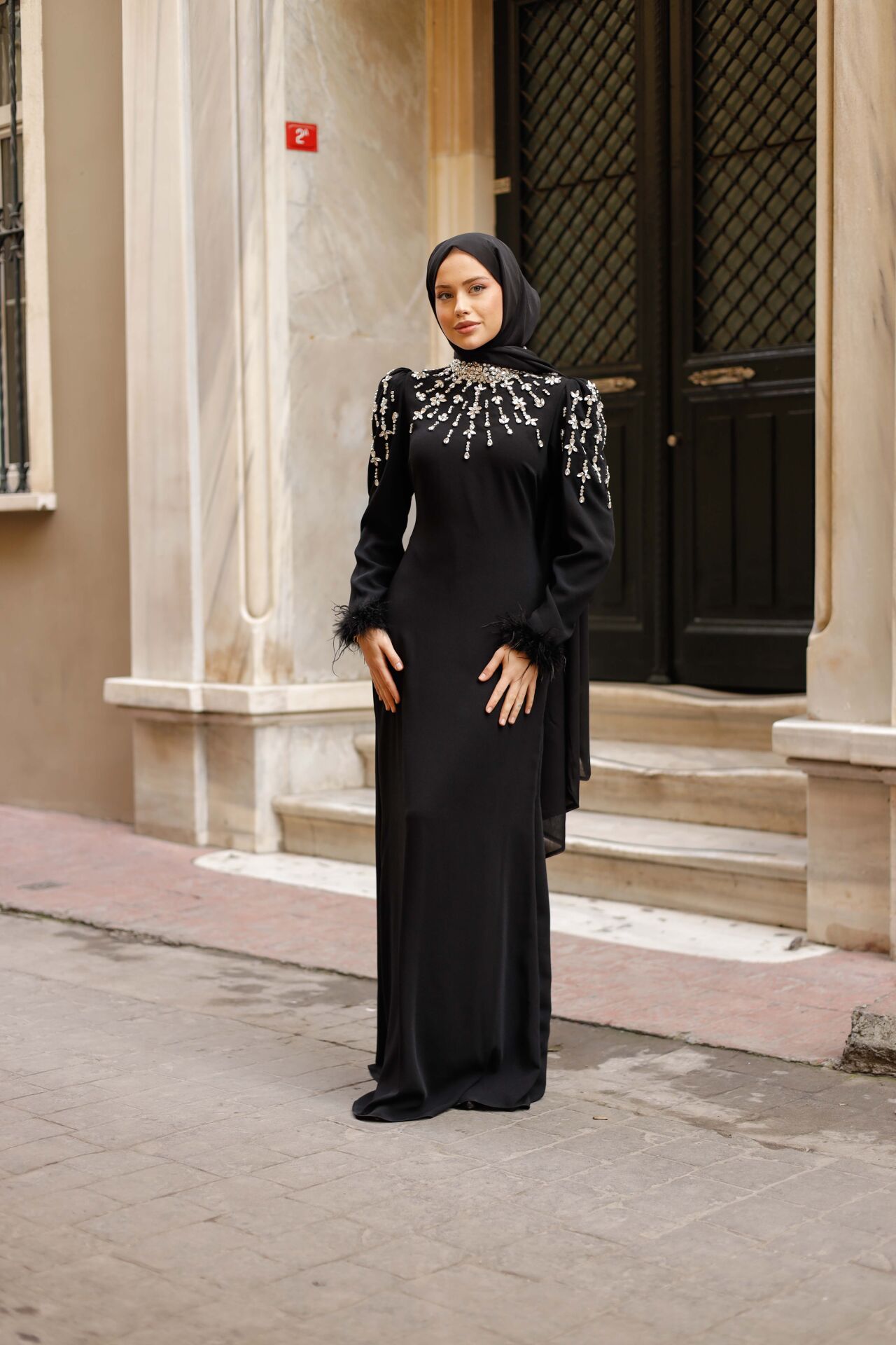 Bu abiye, özel davetlerinizde, nişan, düğün veya önemli etkinliklerde fark yaratmak isteyen tesettürlü kadınlar için tasarlandı. Vücut hatlarını zarifçe gizlerken, lüks taş ve tüy detaylarıyla iddianızı ortaya koyar.
