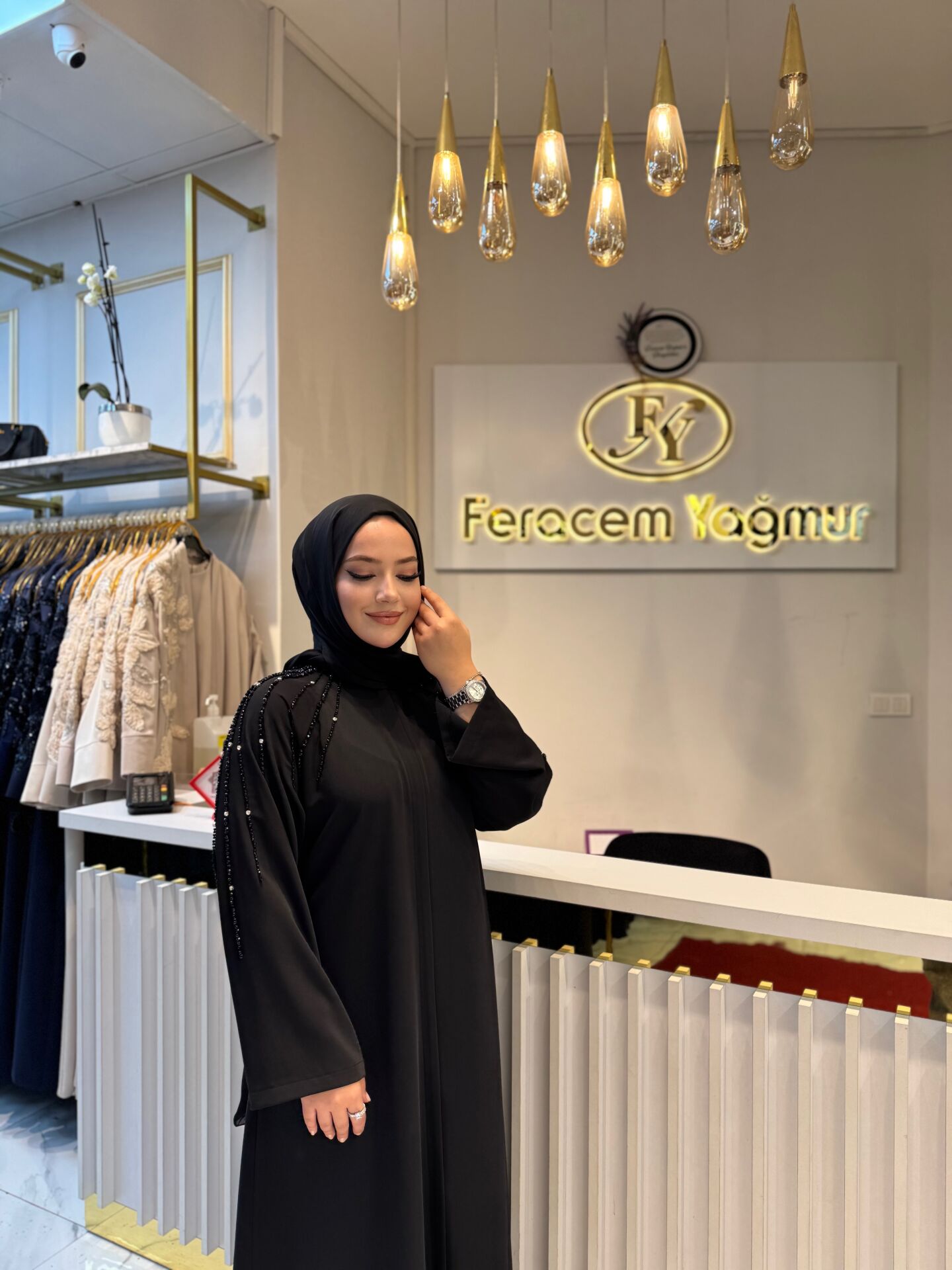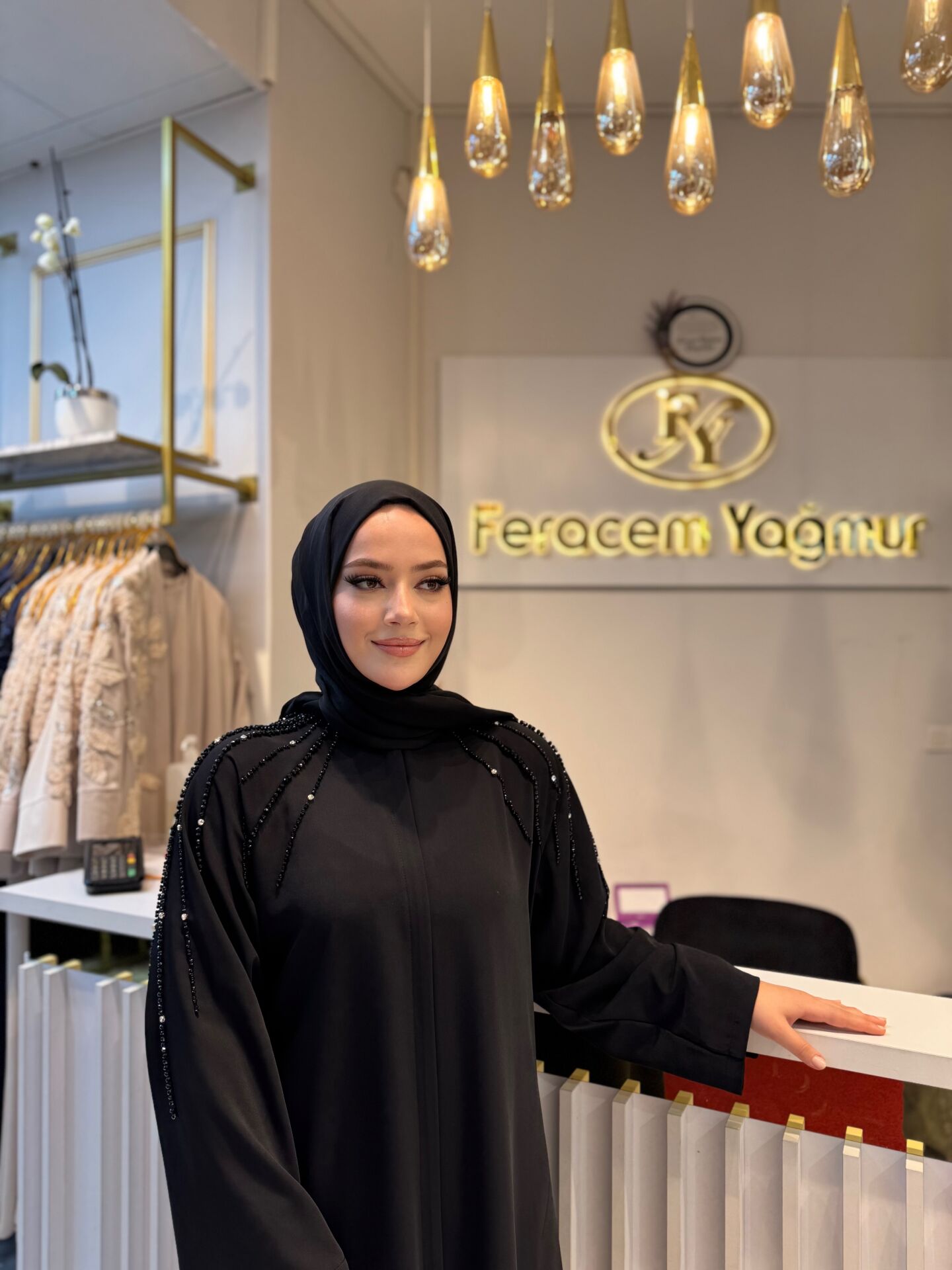 Feracem Yağmur’un yeni sezon koleksiyonunda öne çıkan bu model, Dubai ipeğinin eşsiz dokusunu omuzlardan süzülen kristal boncuk işlemeleriyle buluşturuyor. Her bedende (38-60) aynı zarif silüeti sunan bu ferace, özel günlerinizden günlük şıklığınıza kadar her anınıza eşlik edecek bir başyapıt.