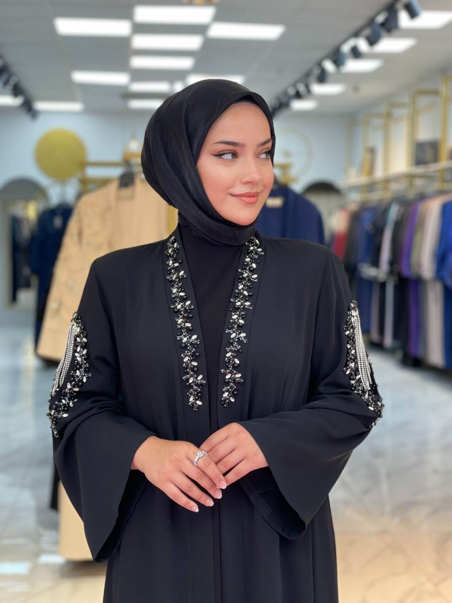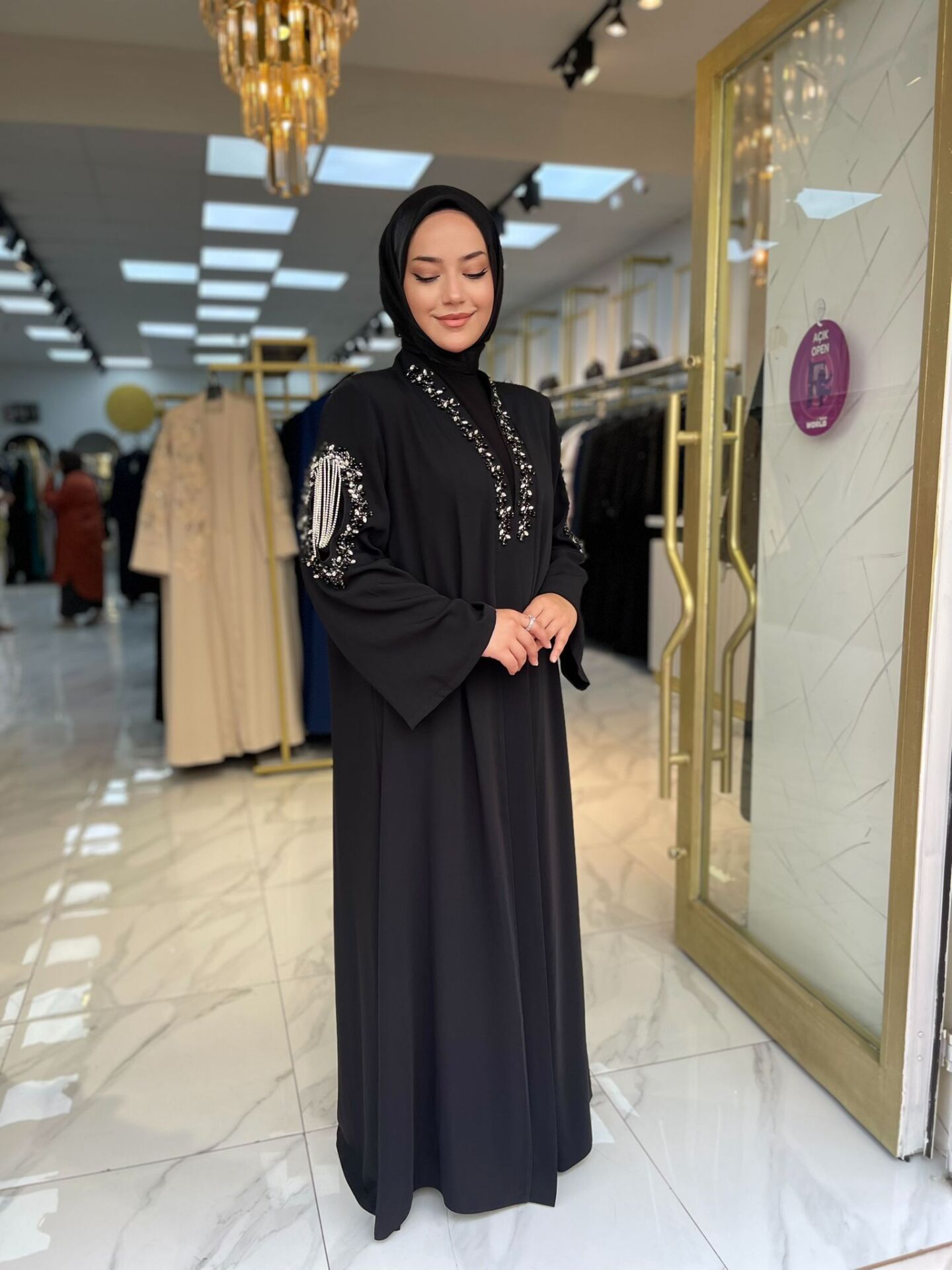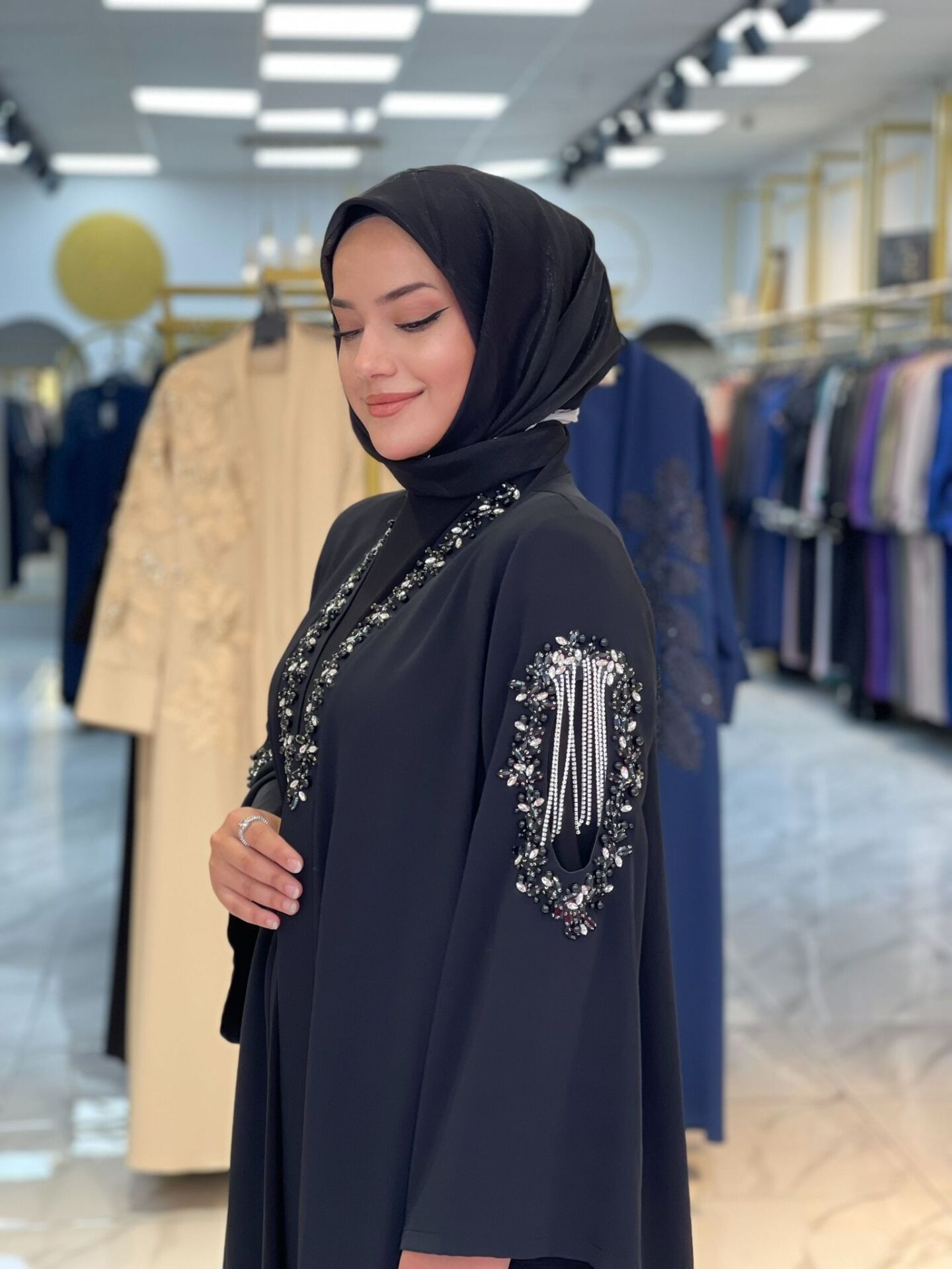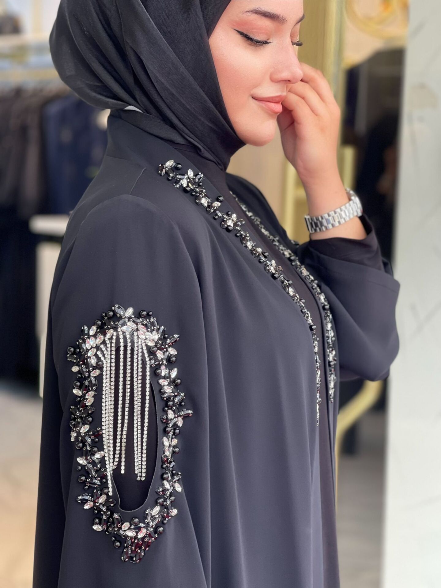Gösterişli ve zamansız bir şıklık sunan Işıl Abaya Takımı, göz alıcı taş işlemeleri ve lüks Dubai ipeği kumaşıyla özel günlerde zarafetinizi yansıtmanız için tasarlandı. Omuz ve yaka detaylarındaki inci ve taş süslemeler, abayanın asil duruşunu tamamlıyor. Candy kumaştan üretilmiş iç elbisesiyle birlikte kombinlenen bu takım, hem şık hem konforlu bir giyim deneyimi sunar.