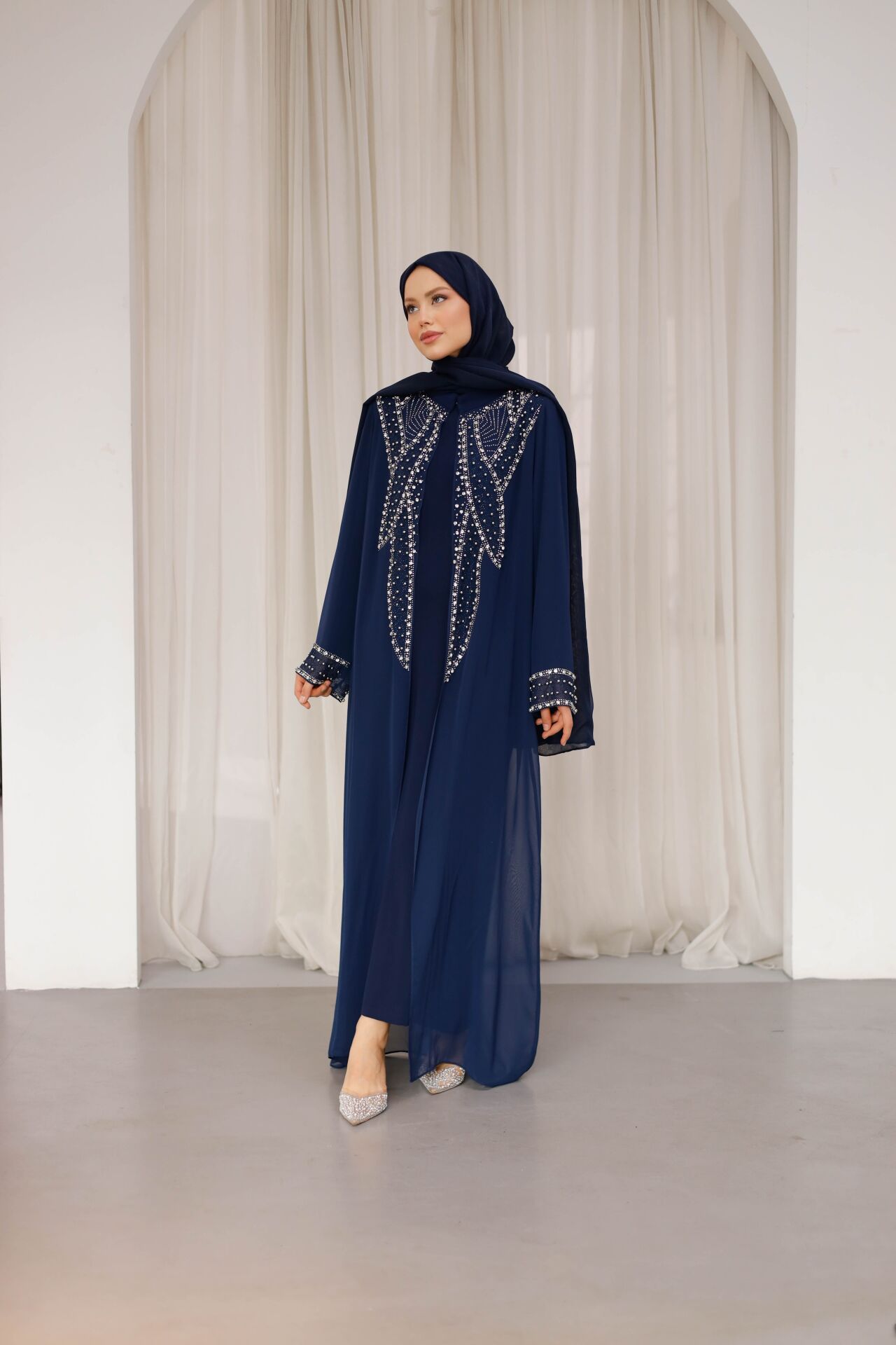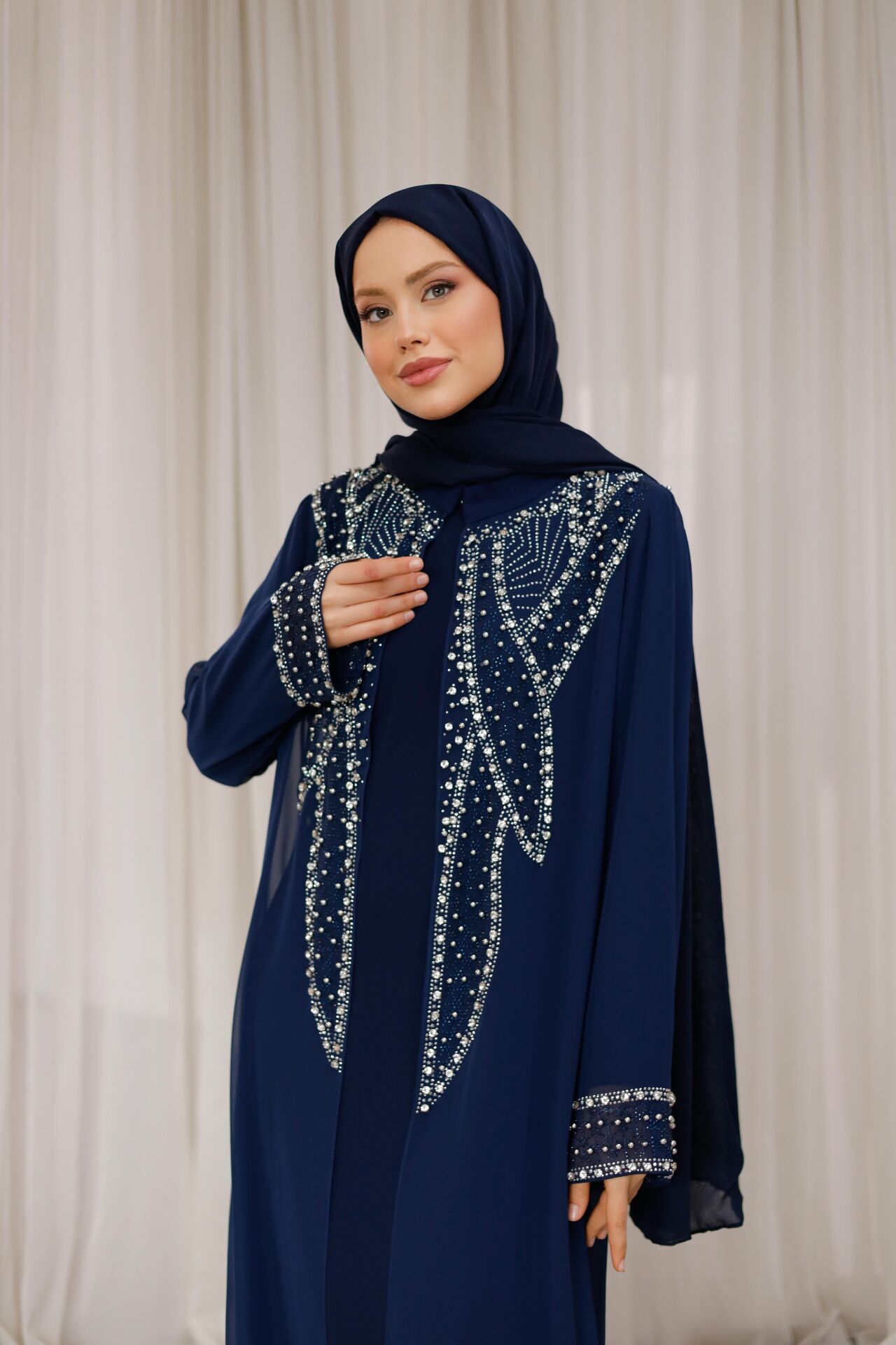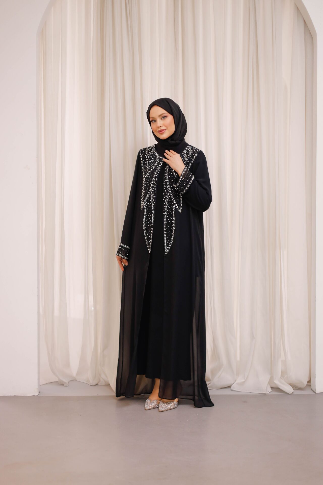 Özenle yerleştirilen ışıltılı taş detaylar, abayanın ön ve kol kısımlarında zarif bir hareket kazandırırken; sade kesimi sayesinde dengeli ve asil bir görünüm sunar. İç elbisesiyle birlikte sunulan bu model, hem konforlu hem de bütüncül bir kombin avantajı sağlar.
