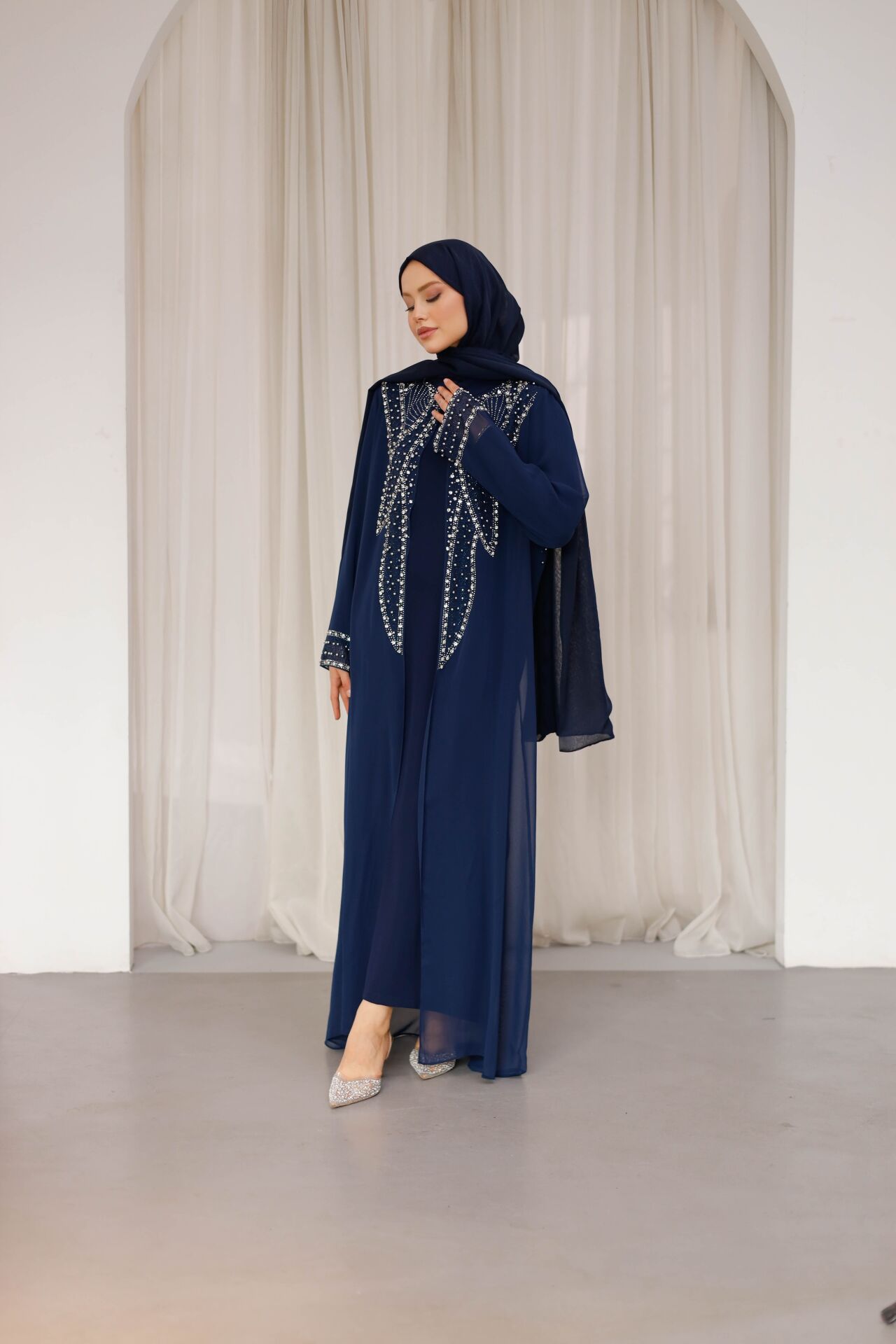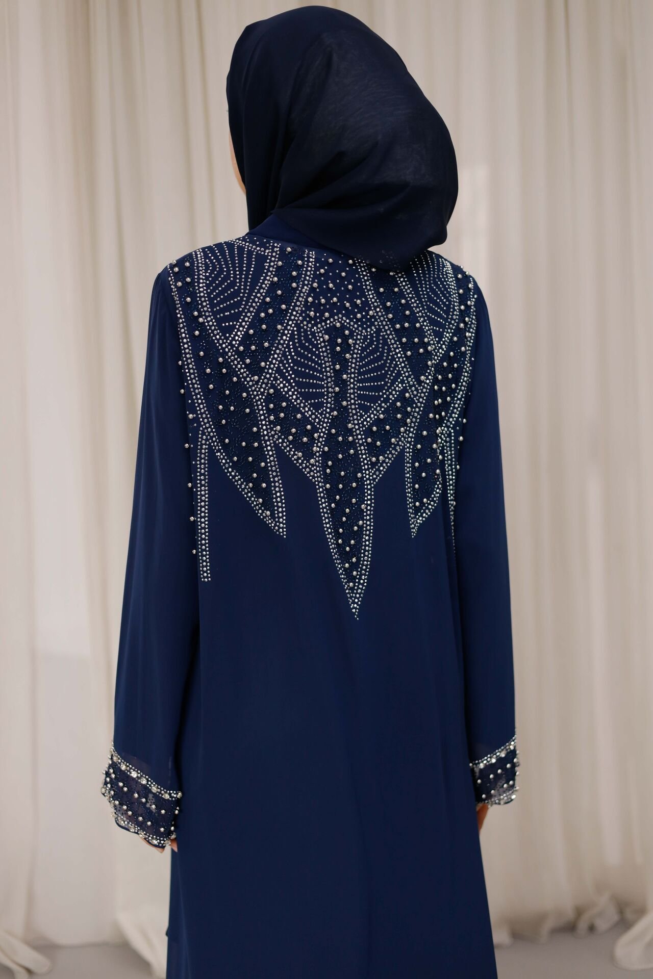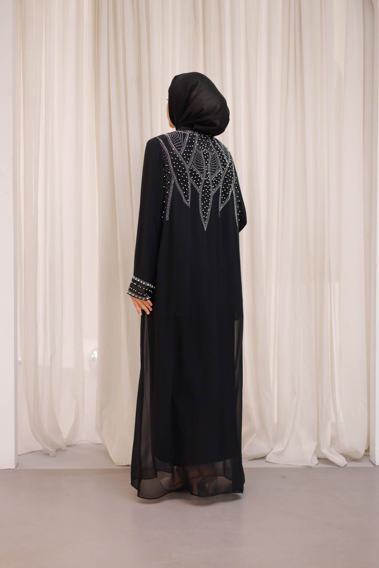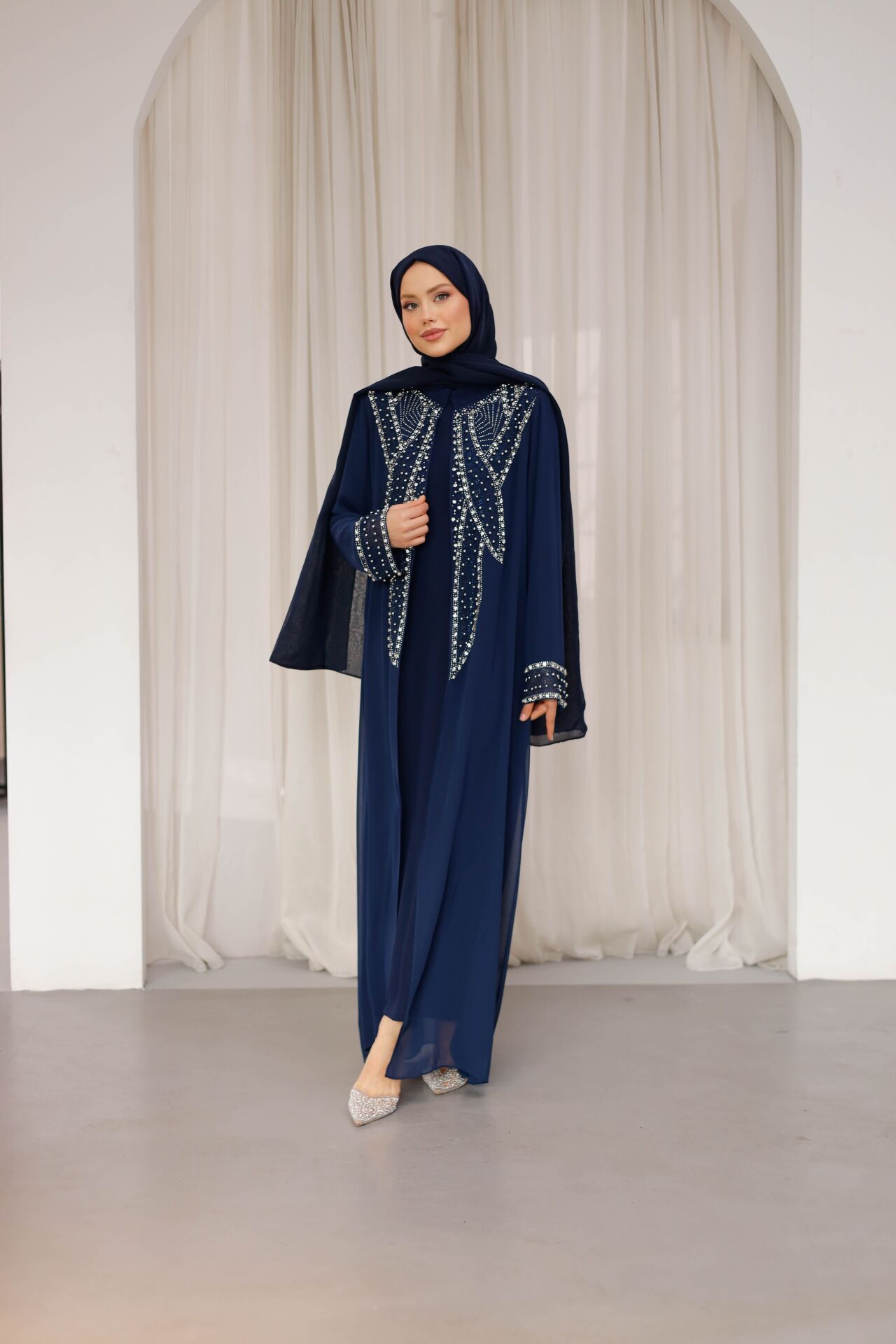 Özenle yerleştirilen ışıltılı taş detaylar, abayanın ön ve kol kısımlarında zarif bir hareket kazandırırken; sade kesimi sayesinde dengeli ve asil bir görünüm sunar. İç elbisesiyle birlikte sunulan bu model, hem konforlu hem de bütüncül bir kombin avantajı sağlar.