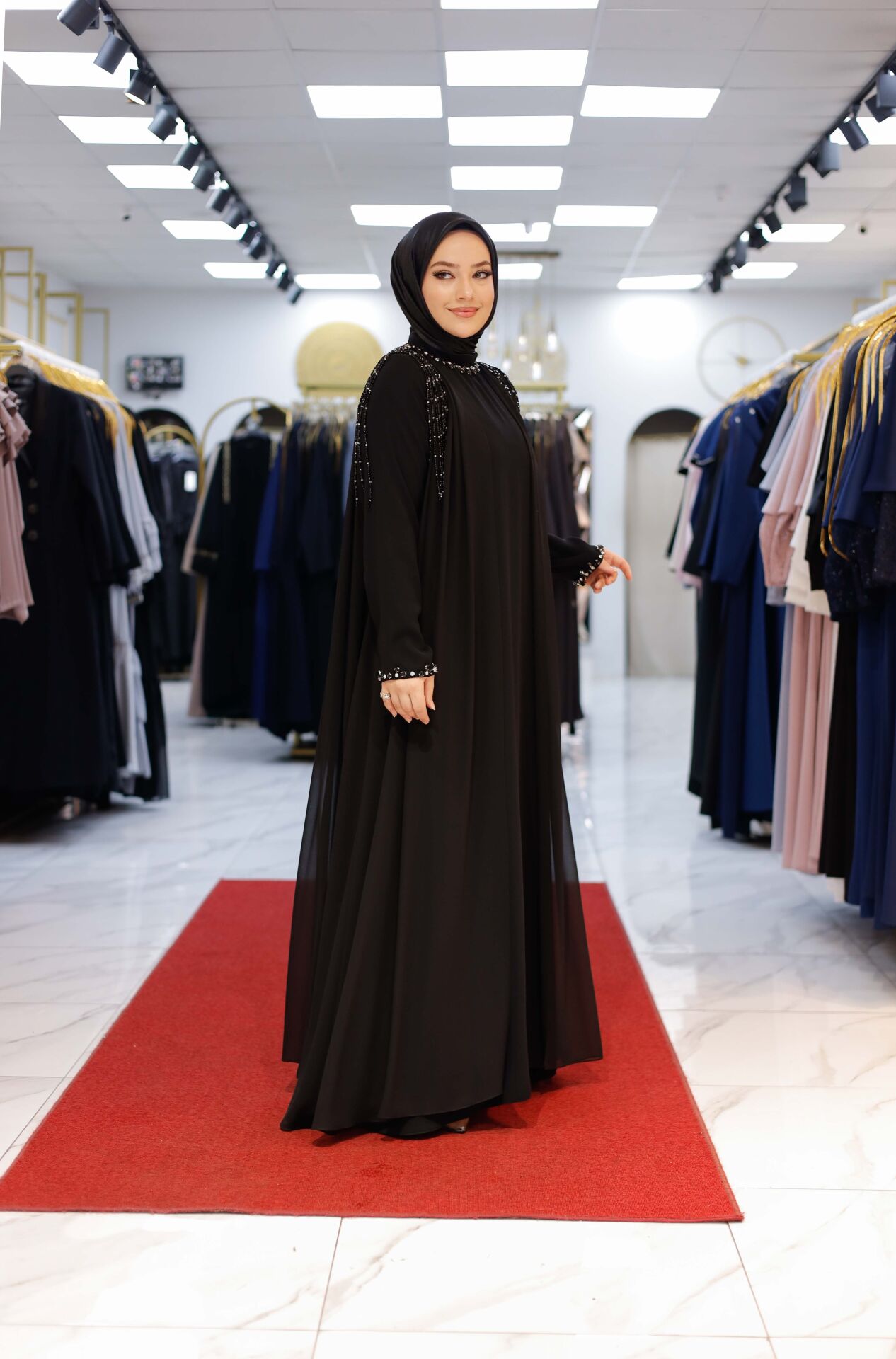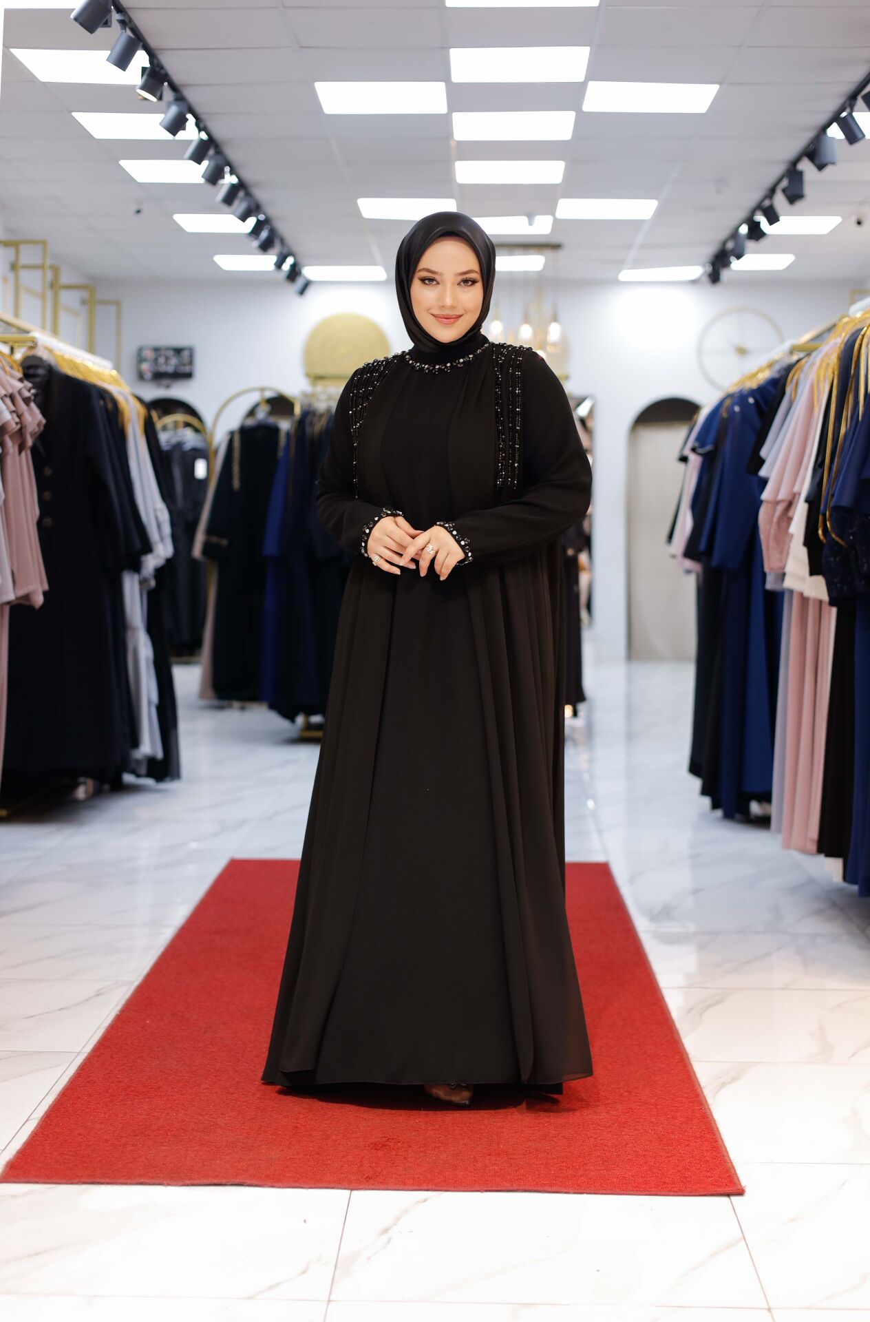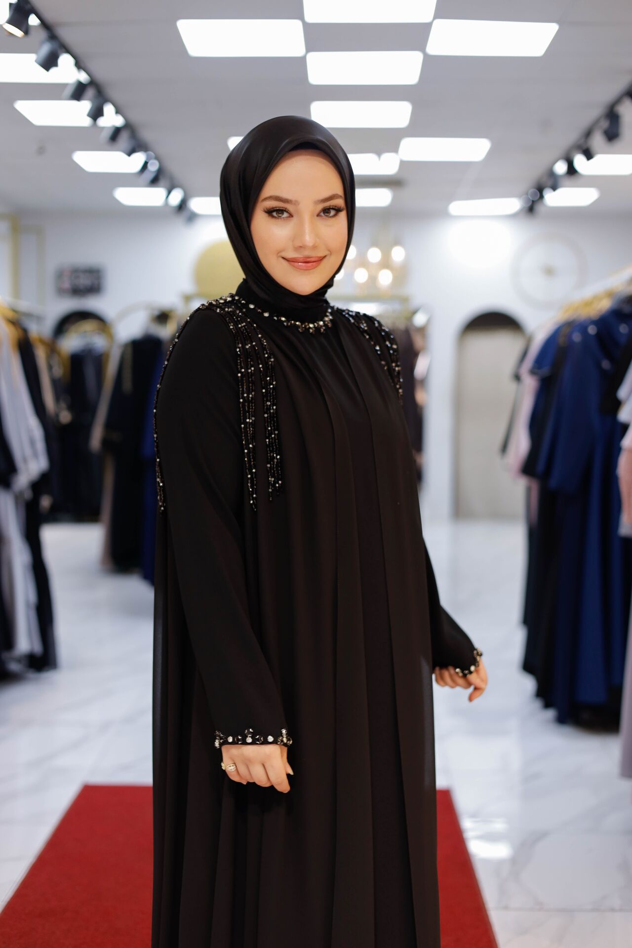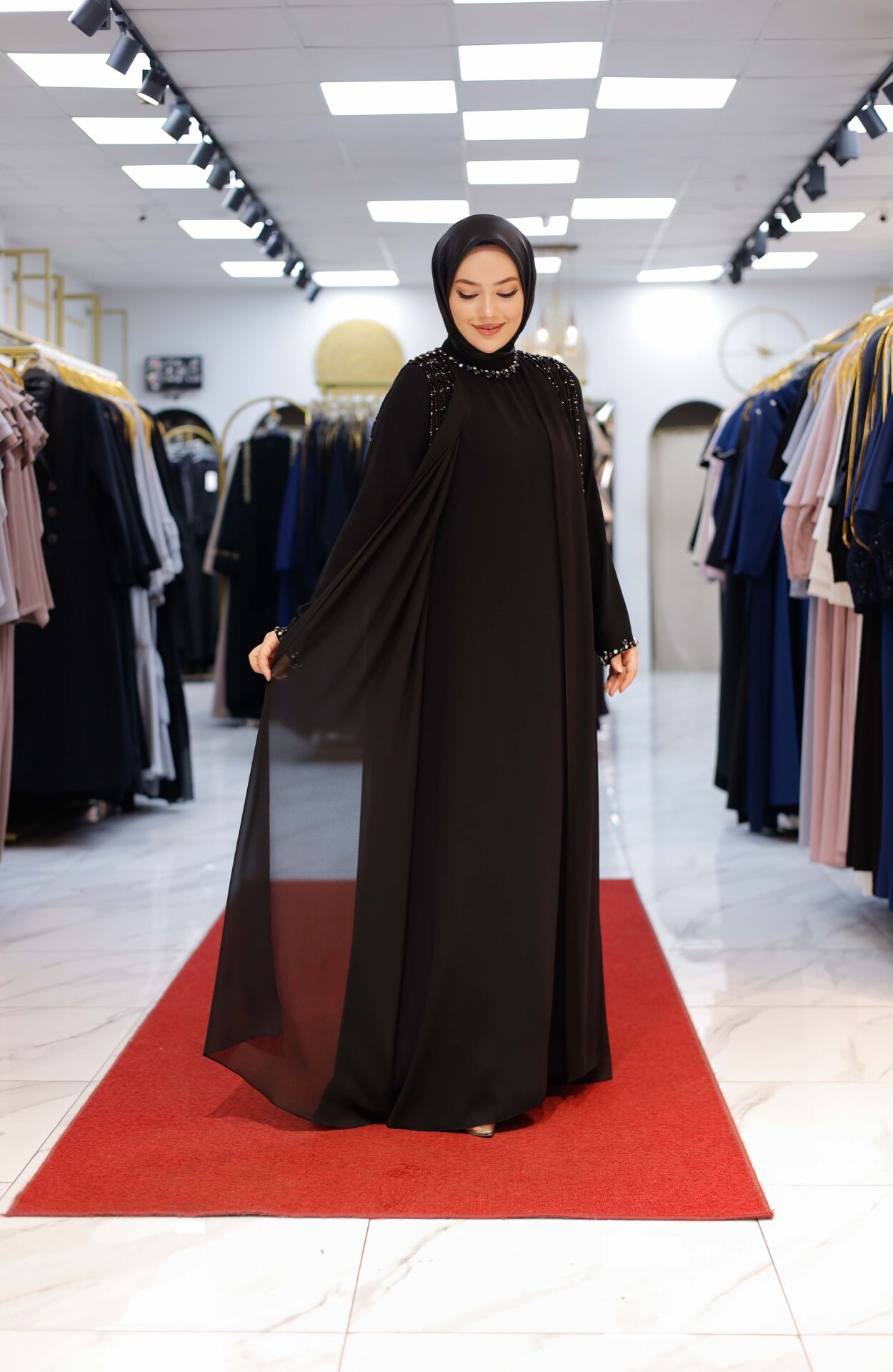 Lerzan Şifon Detaylı Taş İşlemeli Elbise, sade siyah zemin üzerine yerleştirilen özel taş işçiliği ve omuzlardan dökülen şifon detaylarıyla güçlü ve zarif bir siluet sunar. Özel gün şıklığını konforlu bir kullanım ile birleştiren bu model, modern tesettür giyim stilinin dikkat çeken parçalarından biridir.