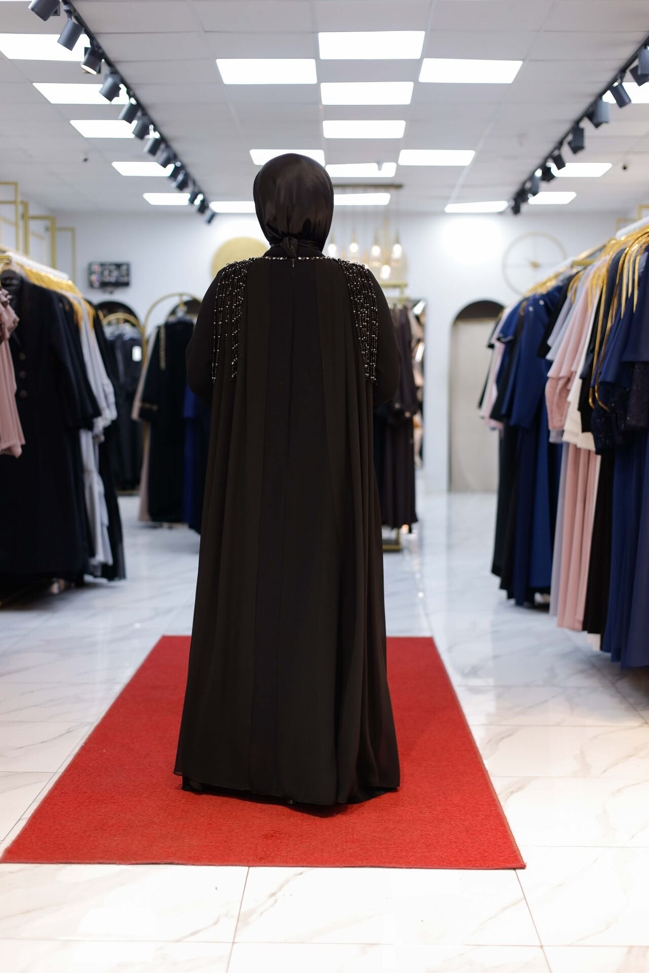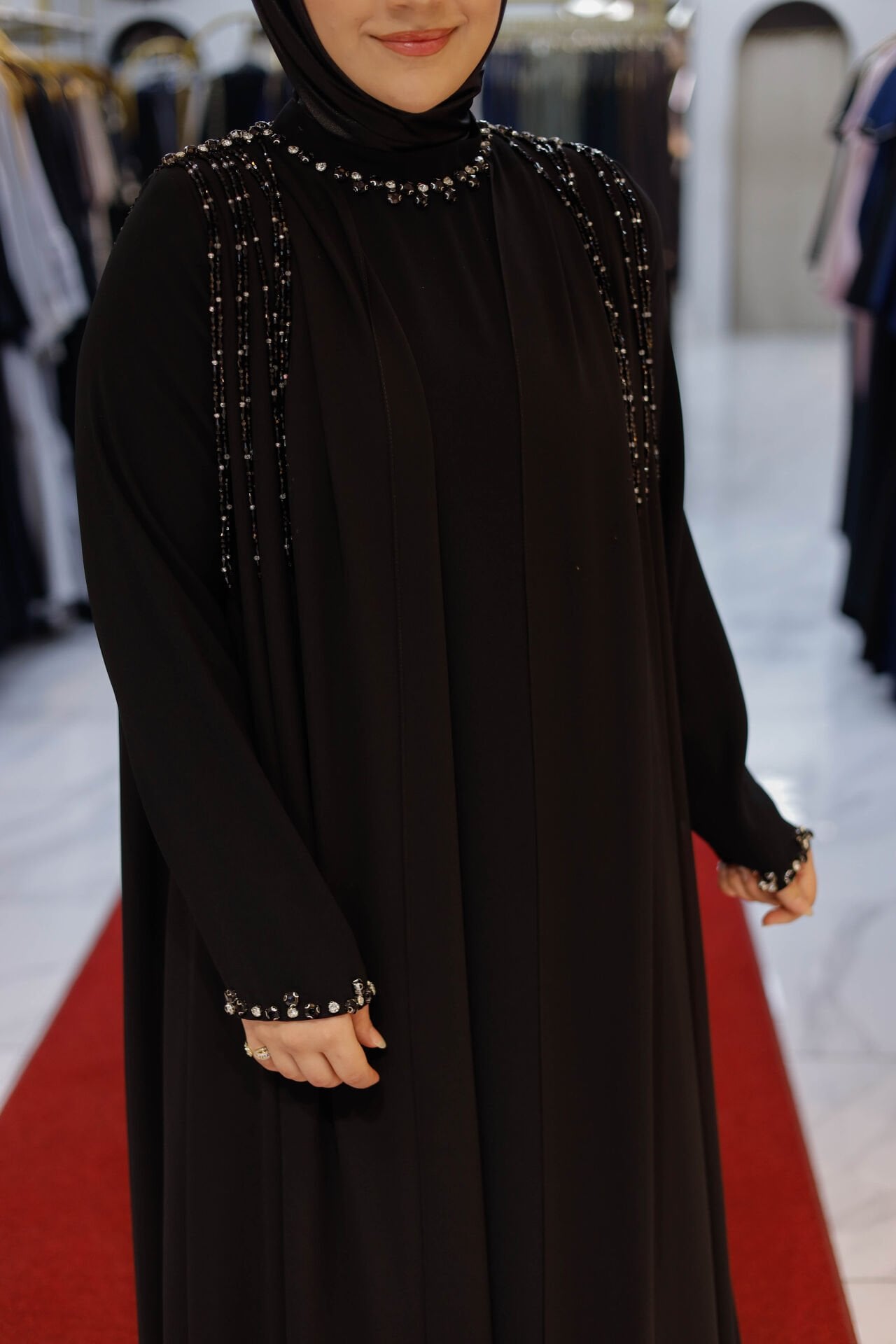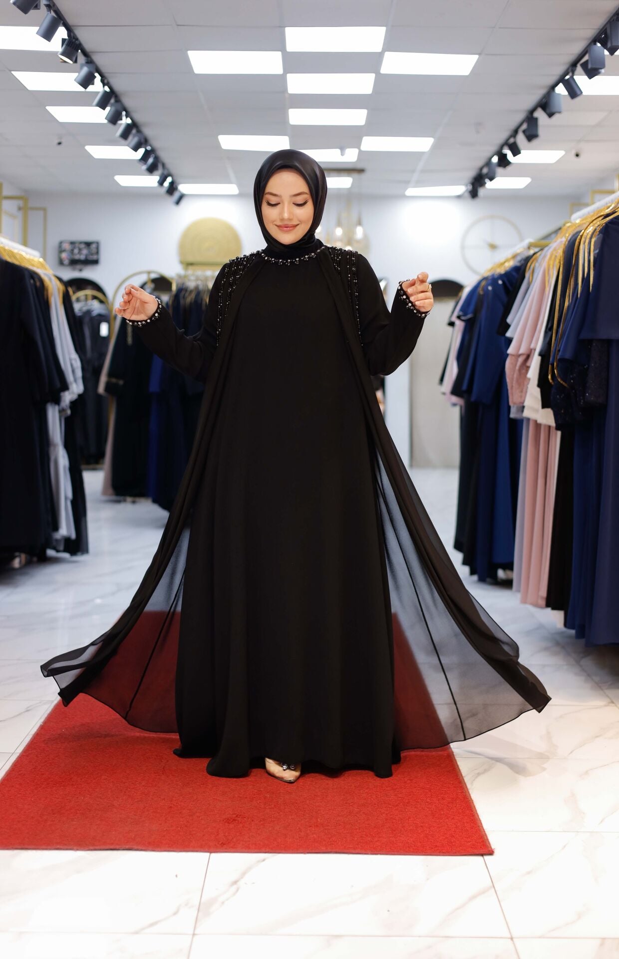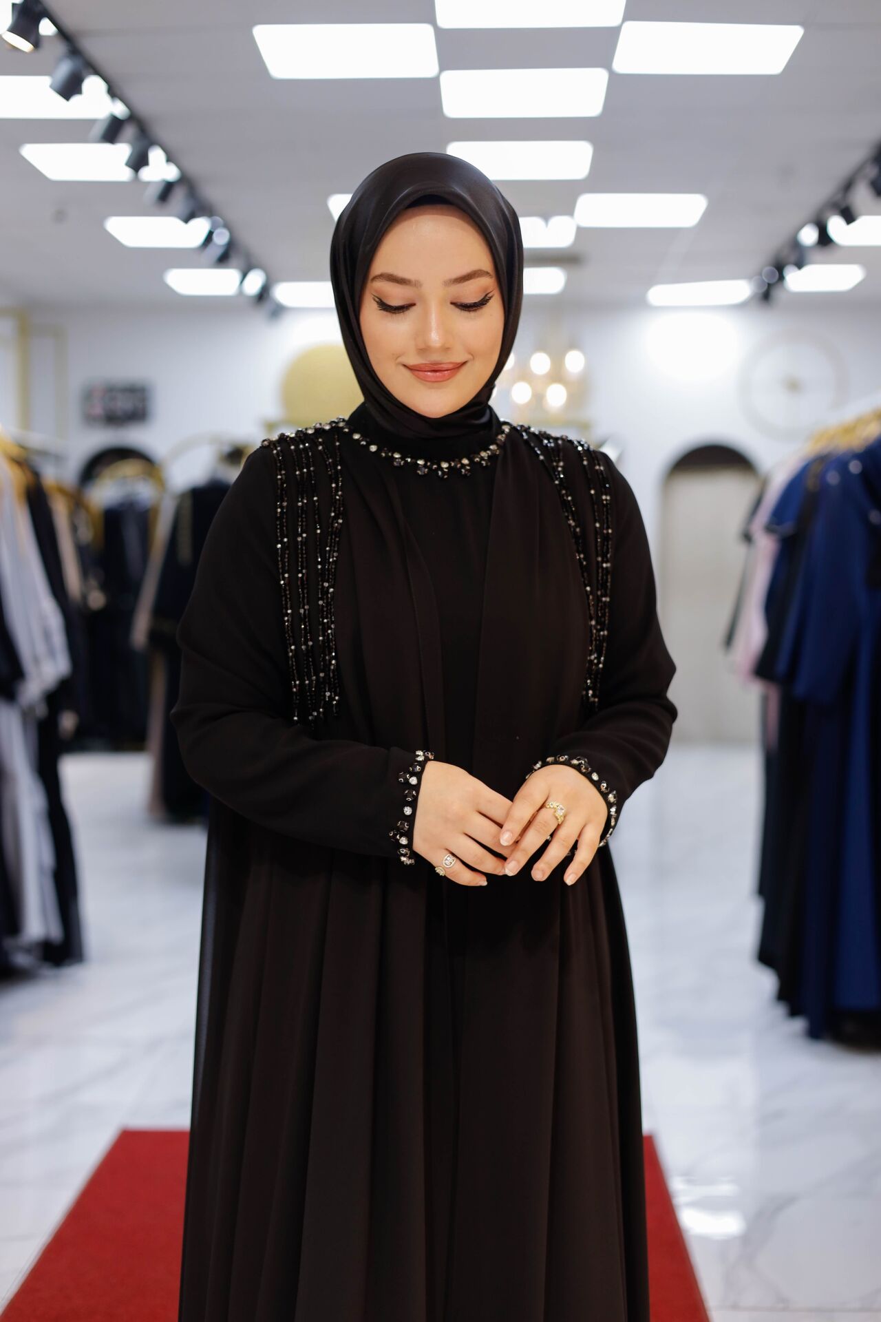 Lerzan Şifon Detaylı Taş İşlemeli Elbise, sade siyah zemin üzerine yerleştirilen özel taş işçiliği ve omuzlardan dökülen şifon detaylarıyla güçlü ve zarif bir siluet sunar. Özel gün şıklığını konforlu bir kullanım ile birleştiren bu model, modern tesettür giyim stilinin dikkat çeken parçalarından biridir.