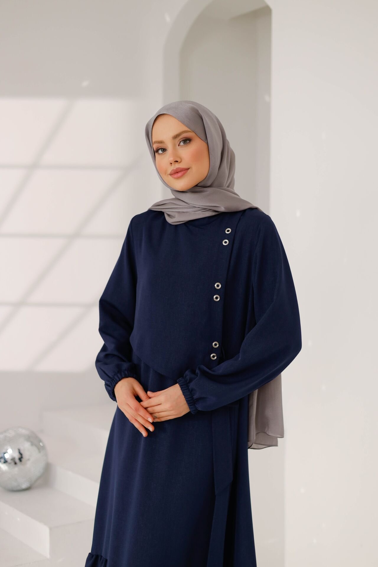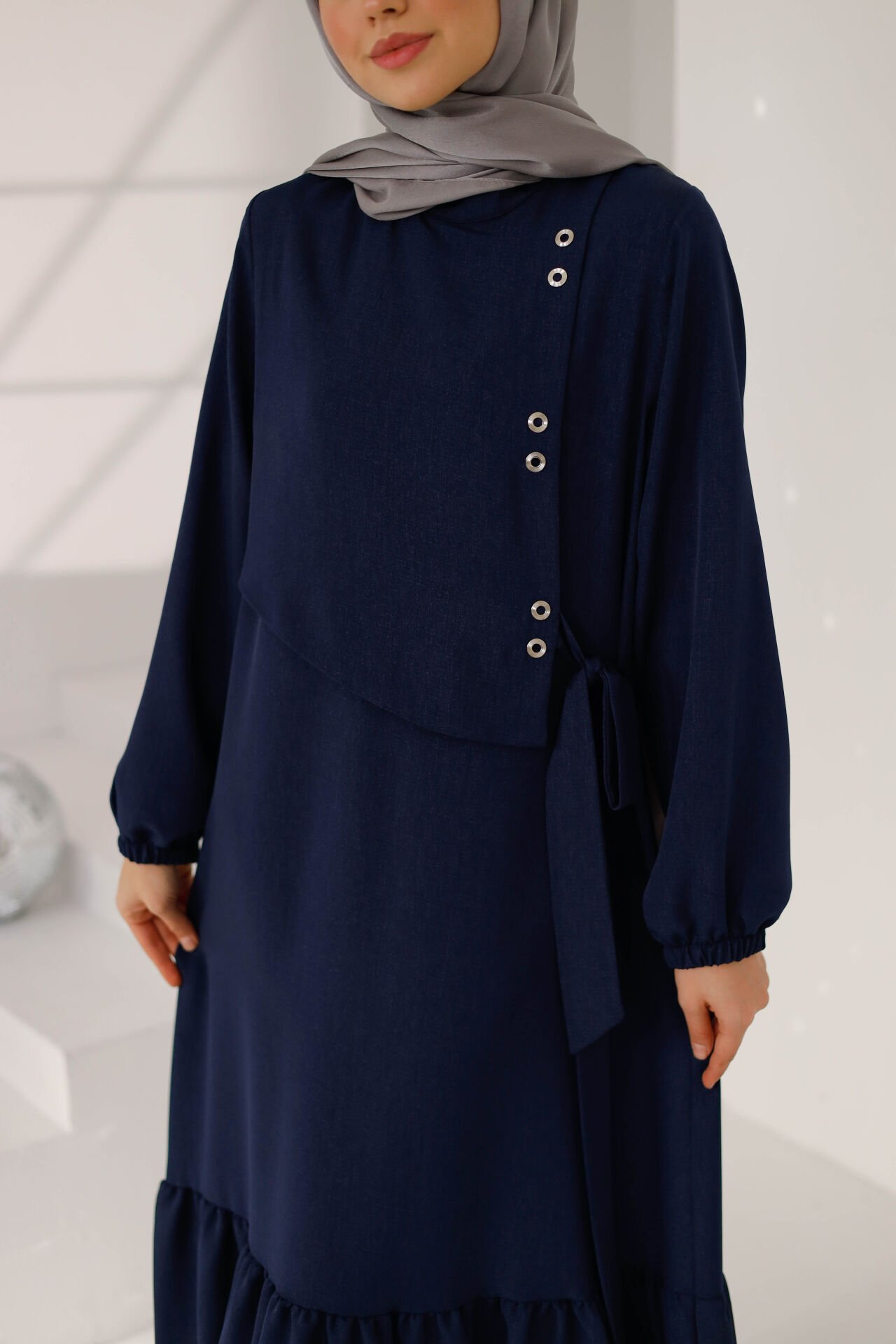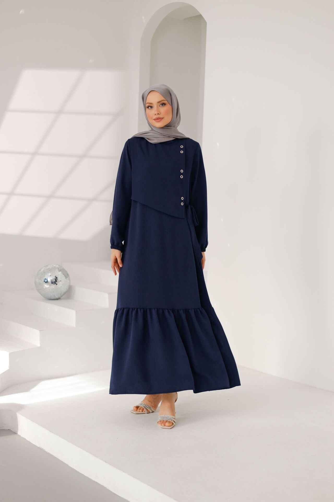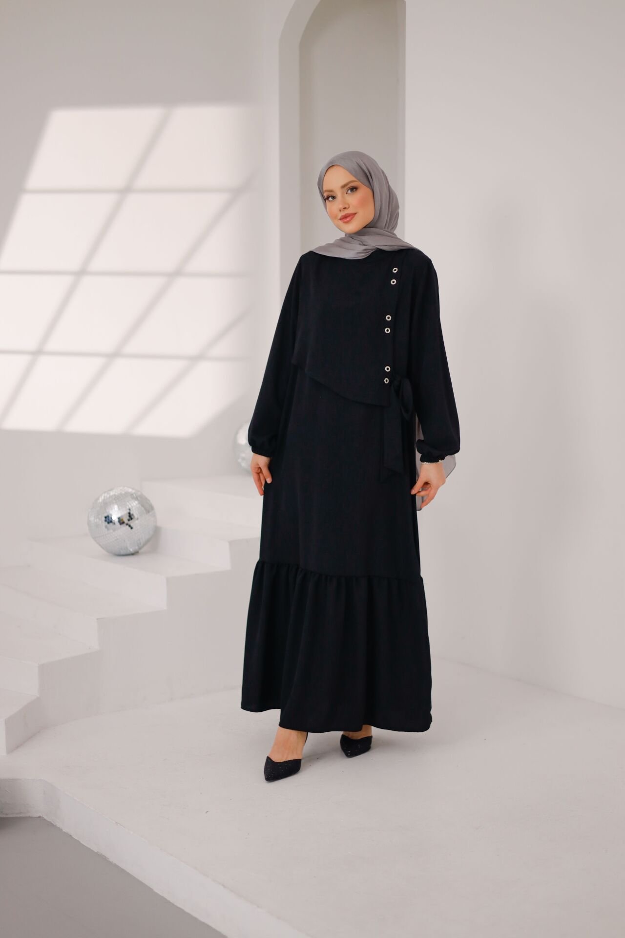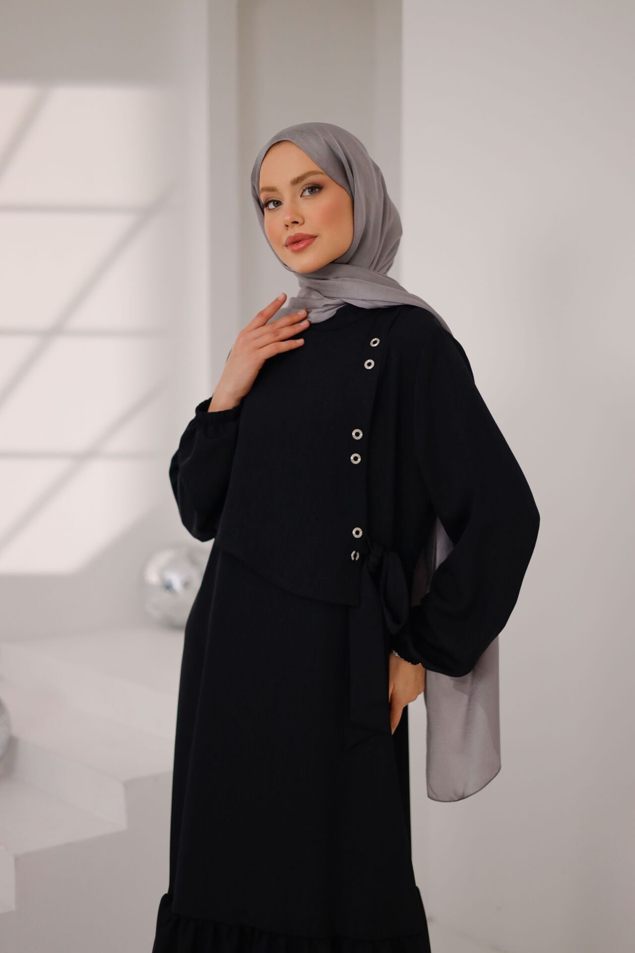 Yan bölümde yer alan metal taş detayları, tasarıma modern bir karakter katarken; sade ve dökümlü kesimi sayesinde zamansız bir şıklık sunar. Rahat kalıbı ve akıcı formu ile gün boyu konfor sağlayan Lina Elbise, tesettür giyimde hem minimal hem de sofistike bir stil arayanlar için ideal bir tercihtir.