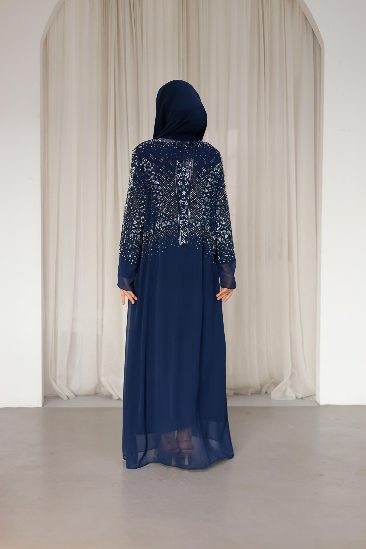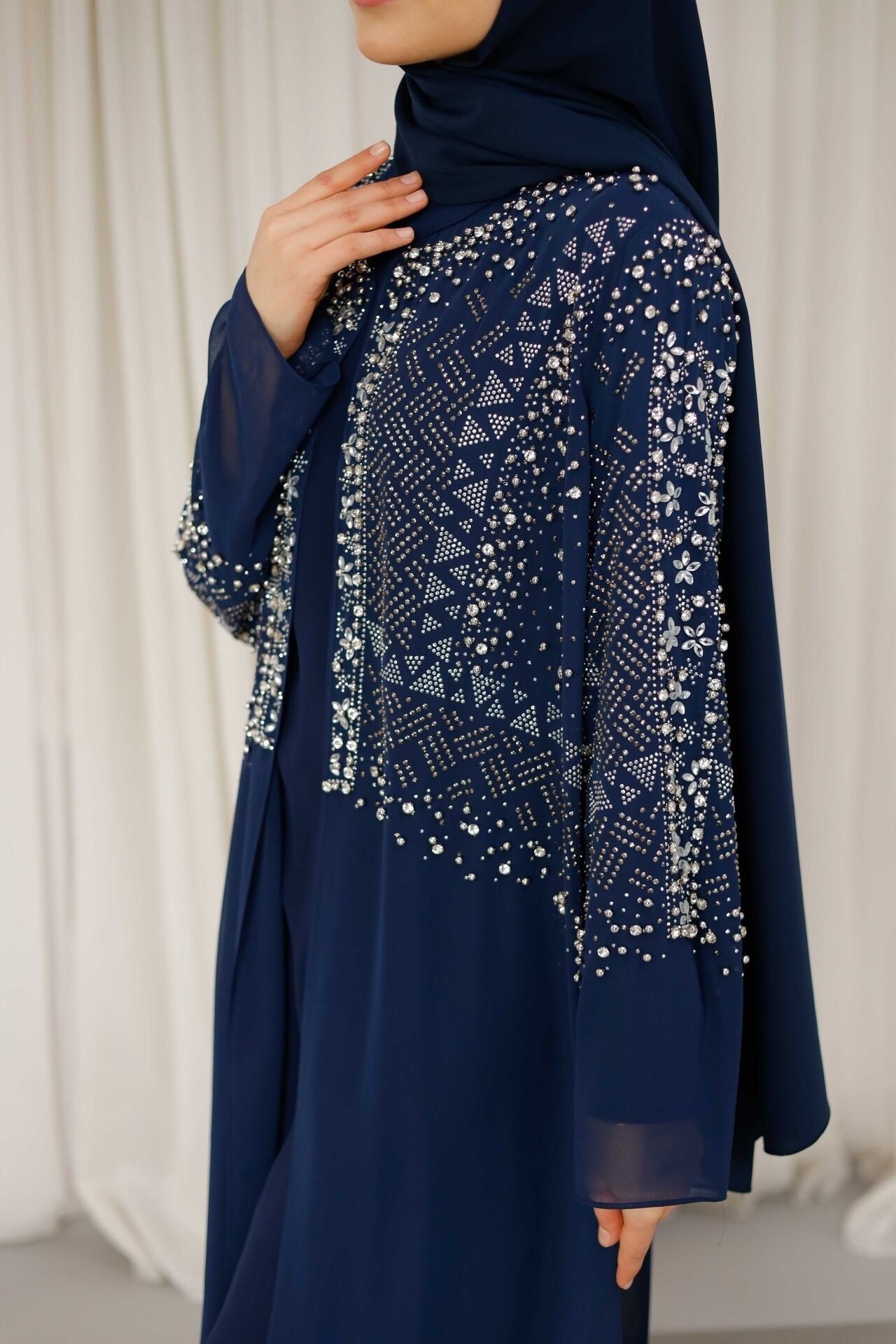 Şifon kumaşın hafif ve dökümlü yapısı, hareket ettikçe akıcı bir siluet oluştururken iç elbisesiyle birlikte sunulan tasarım hem konforlu hem de estetik bir görünüm sağlar. Siyah ve lacivert renk seçenekleriyle zamansız bir stil sunan Liona Abaya, tesettür abiye kombinleri için ideal bir tercihtir.