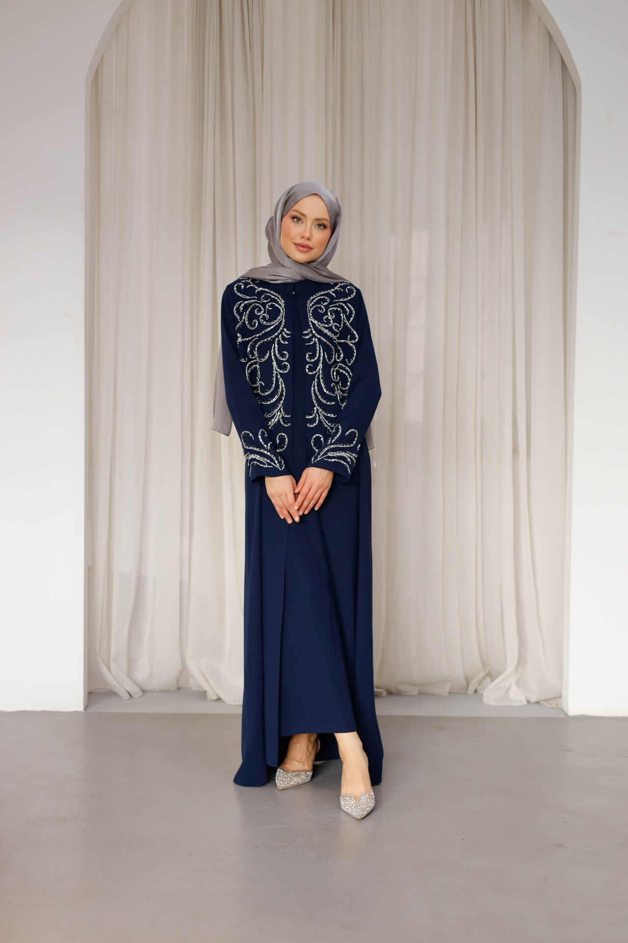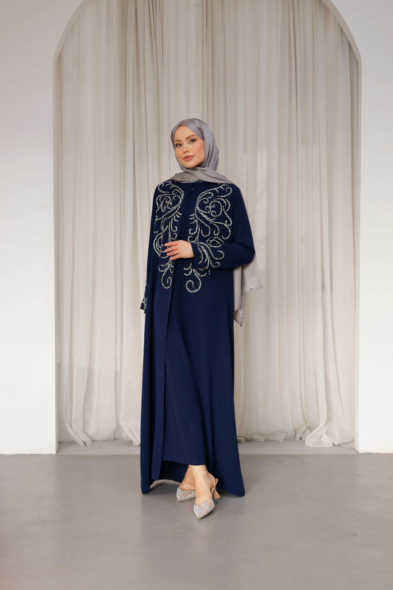 İç elbisesiyle birlikte sunulan Mirhan Abaya, hem konforlu hem de estetik bir kullanım sağlar. Siyah ve lacivert renk seçenekleriyle zamansız bir şıklık sunan bu model; düğün, nişan, davet ve özel organizasyonlar için ideal bir tercihtir.