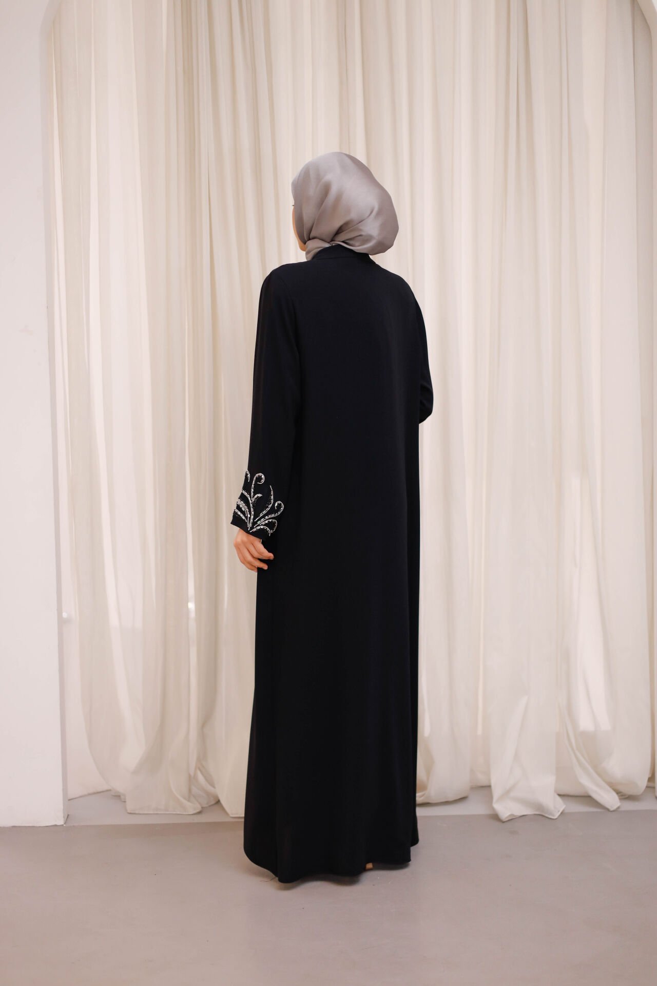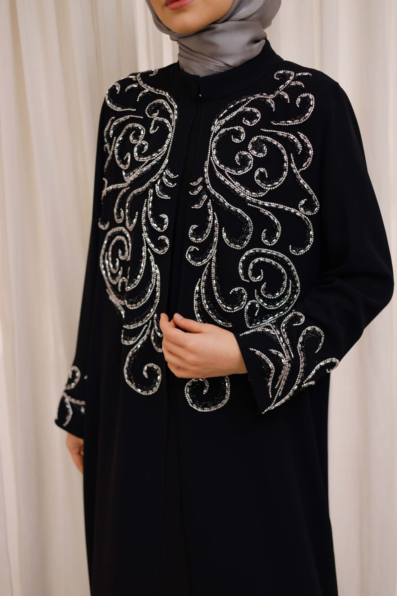 Zarif taş işlemeleri ve akışkan formuyla öne çıkan Mirhan Taş İşlemeli Şifon Abaya, klasik şıklığı modern detaylarla birleştiren özel bir tasarımdır. Ön ve kol bölümlerinde yer alan kıvrımlı taş işlemeleri, modele sofistike bir ışıltı kazandırırken şifon kumaşın hafif ve dökümlü yapısı zarif bir siluet oluşturur.