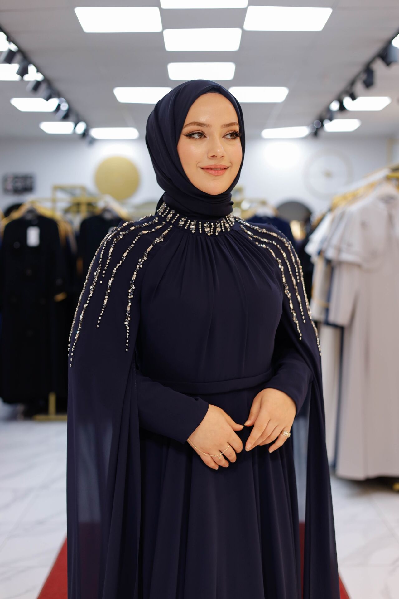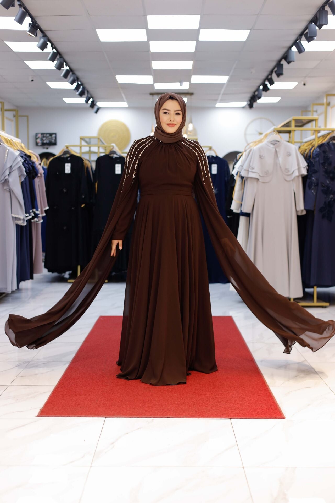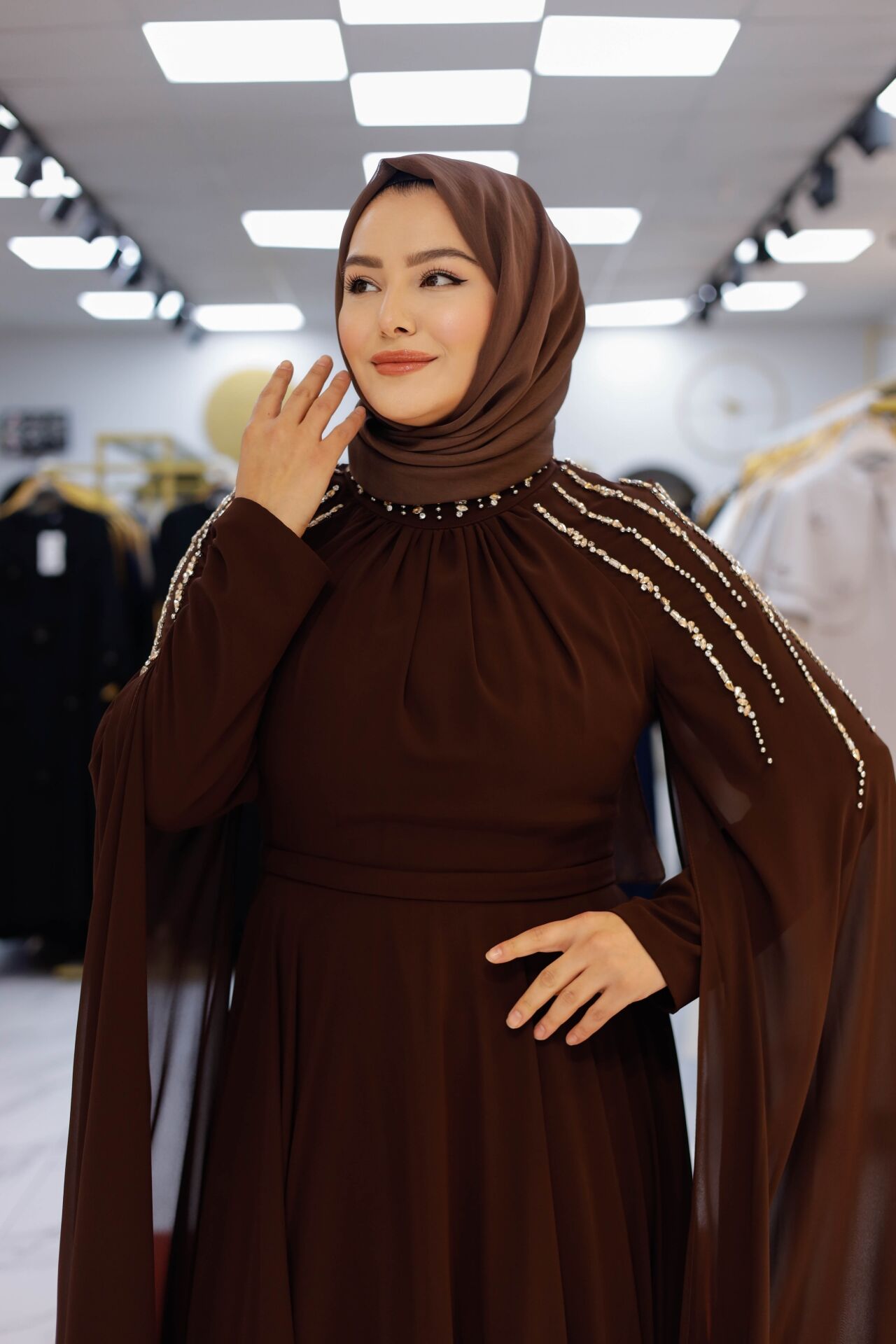 Özel davetlerde, düğün ve nişan törenlerinde asaletinden ödün vermeyen kadınlar için tasarlanan Nur Sultan Elbise, şıklığı konforla buluşturuyor. Omuz kısmındaki el işçiliği inci detayları, hareket ettikçe parlayan zarif bir dokunuş sunarken; uçuş uçuş şifon kaplaması pelerin formuyla modern bir silüet oluşturur.