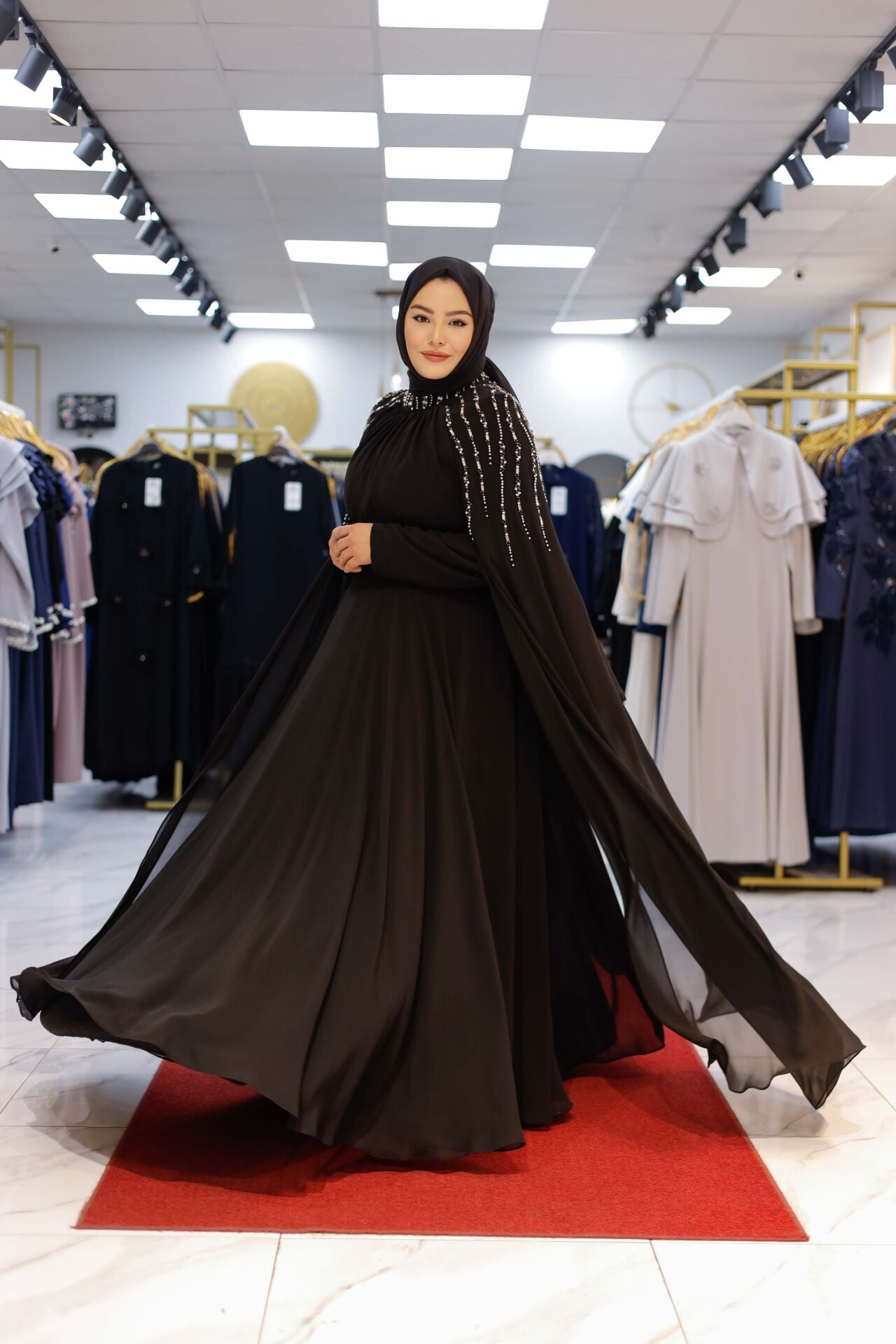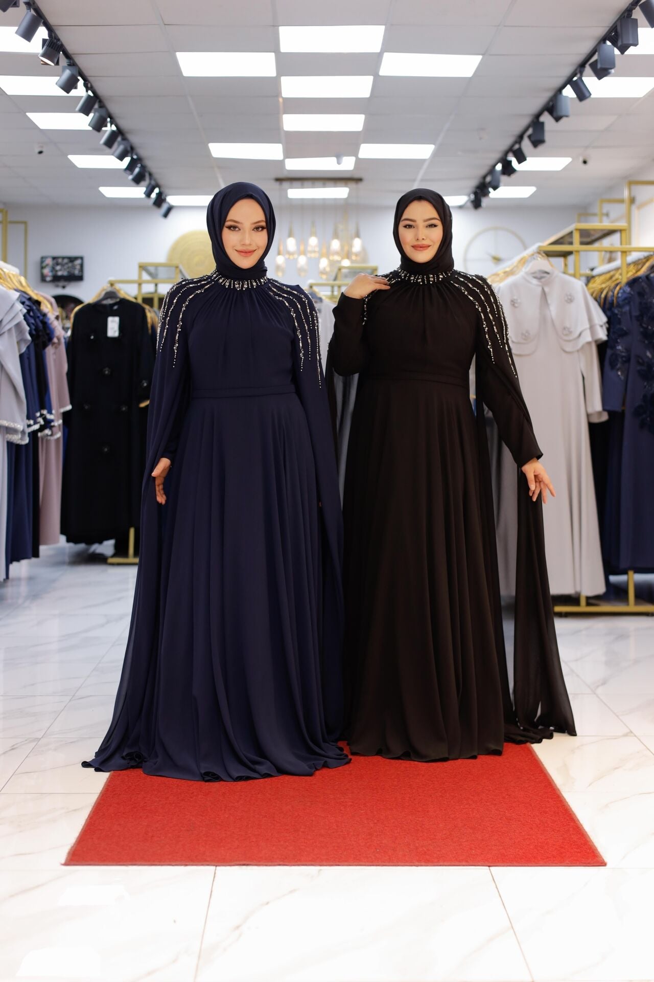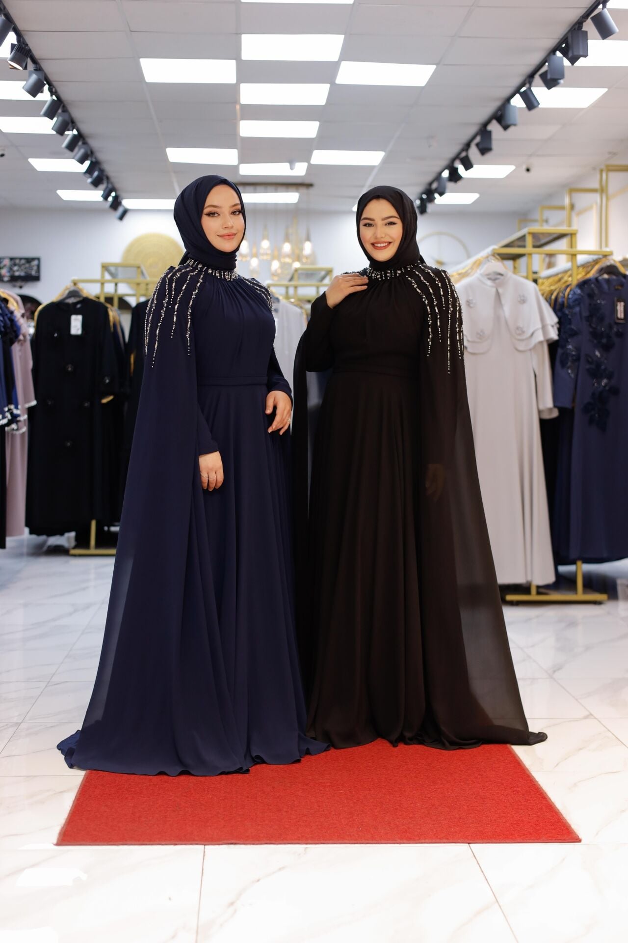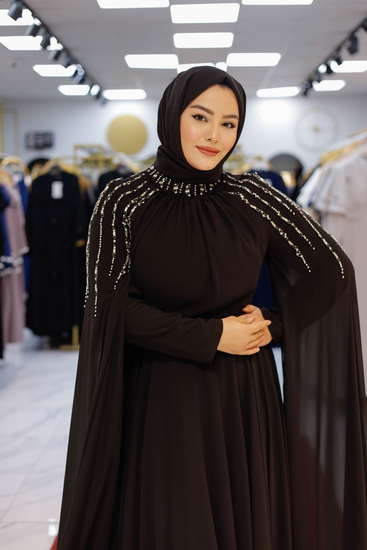 Özel davetlerde, düğün ve nişan törenlerinde asaletinden ödün vermeyen kadınlar için tasarlanan Nur Sultan Elbise, şıklığı konforla buluşturuyor. Omuz kısmındaki el işçiliği inci detayları, hareket ettikçe parlayan zarif bir dokunuş sunarken; uçuş uçuş şifon kaplaması pelerin formuyla modern bir silüet oluşturur.