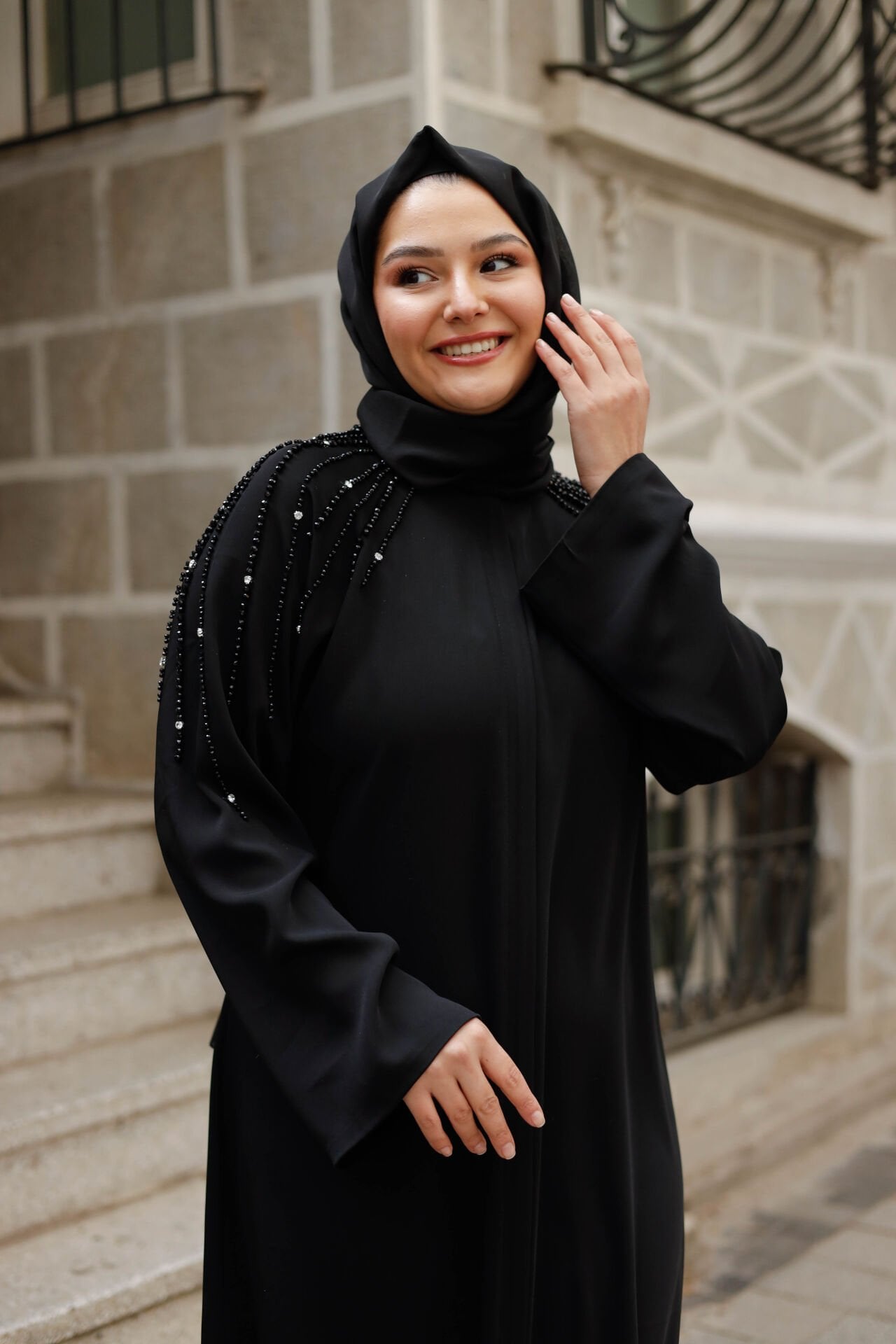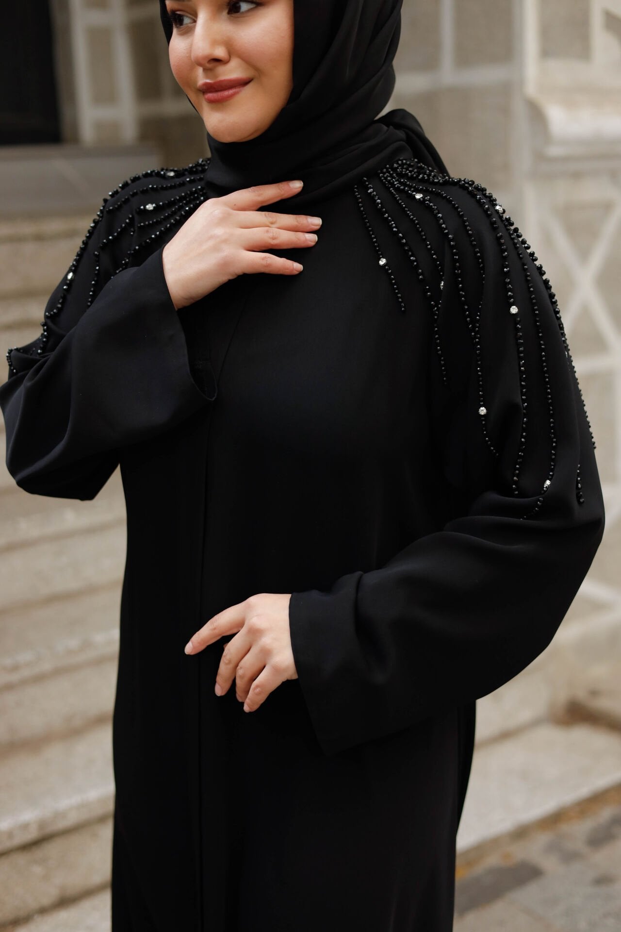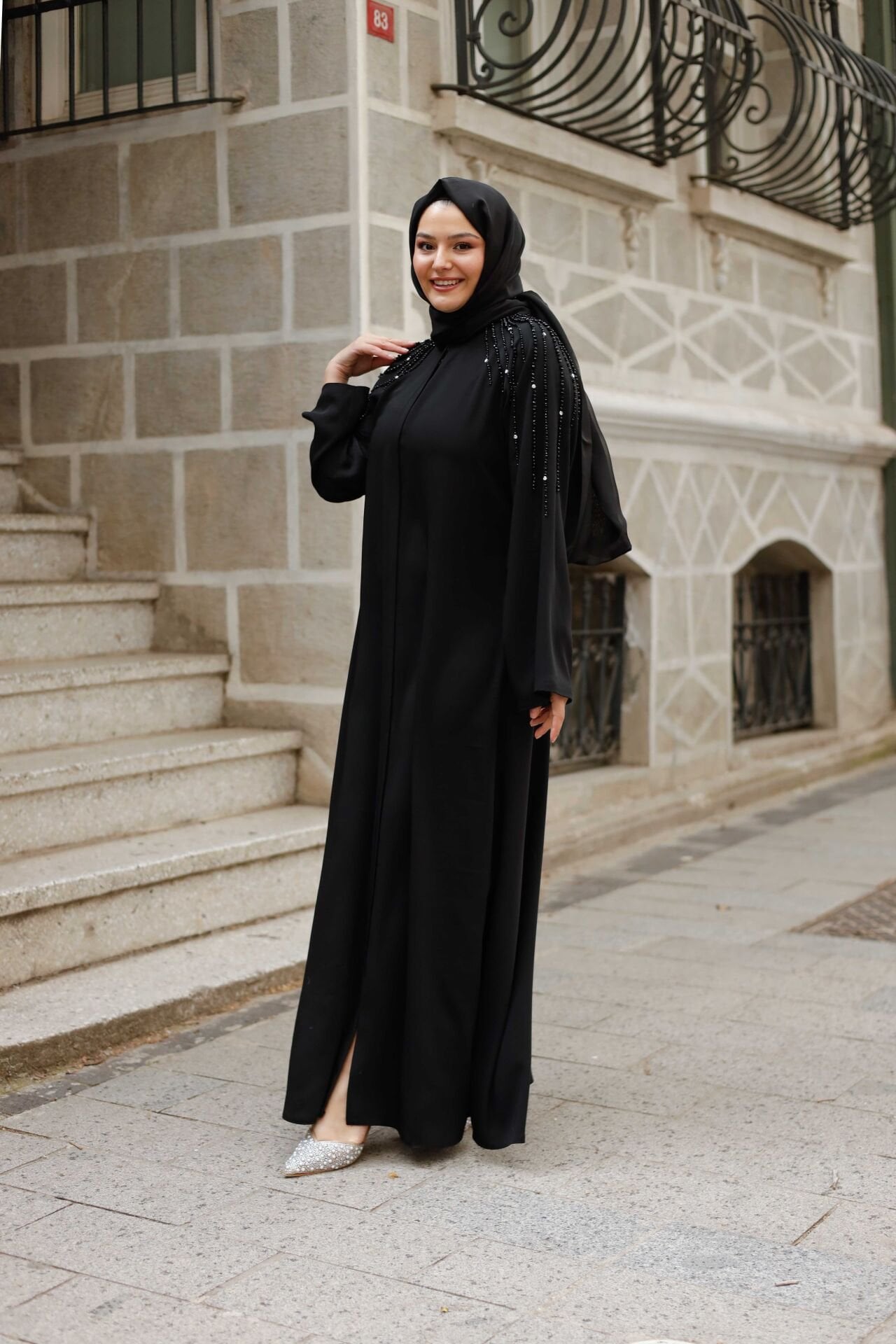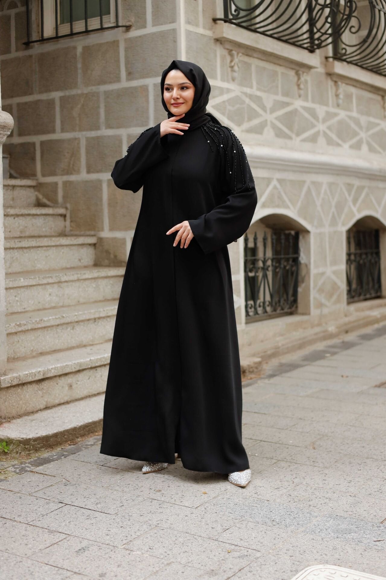 Omuz İşlemeli Dubai İpeği Siyah Ferace