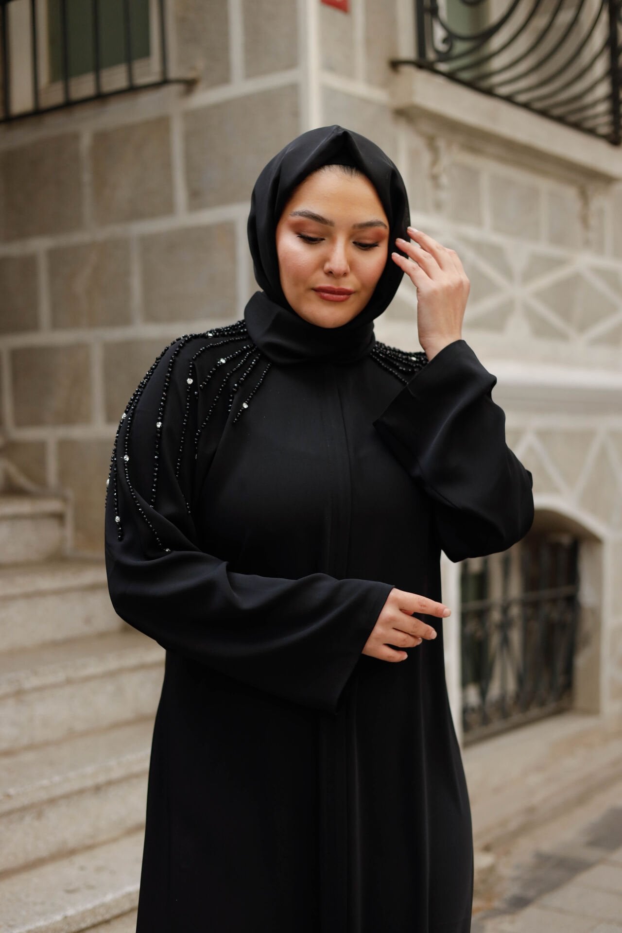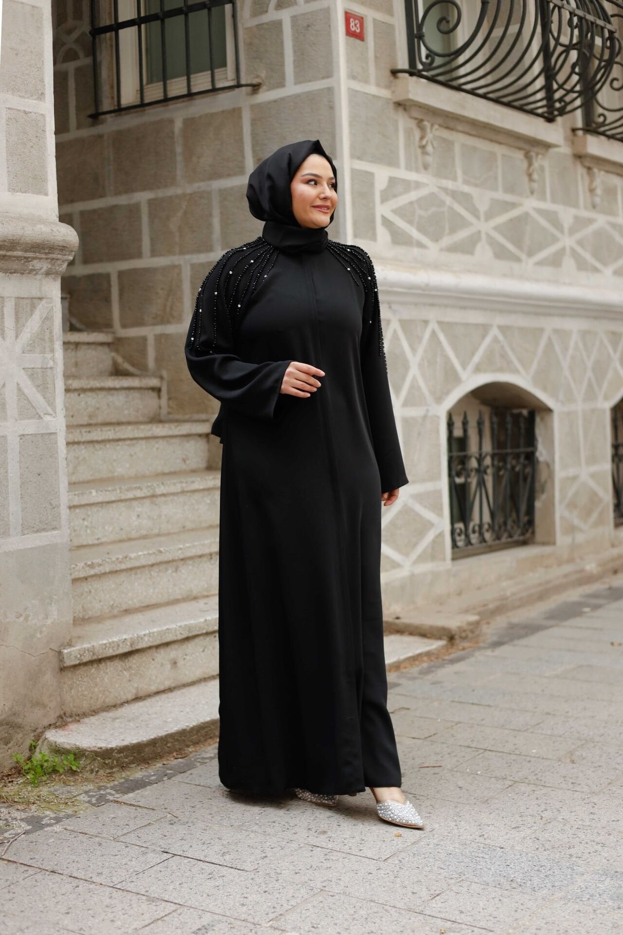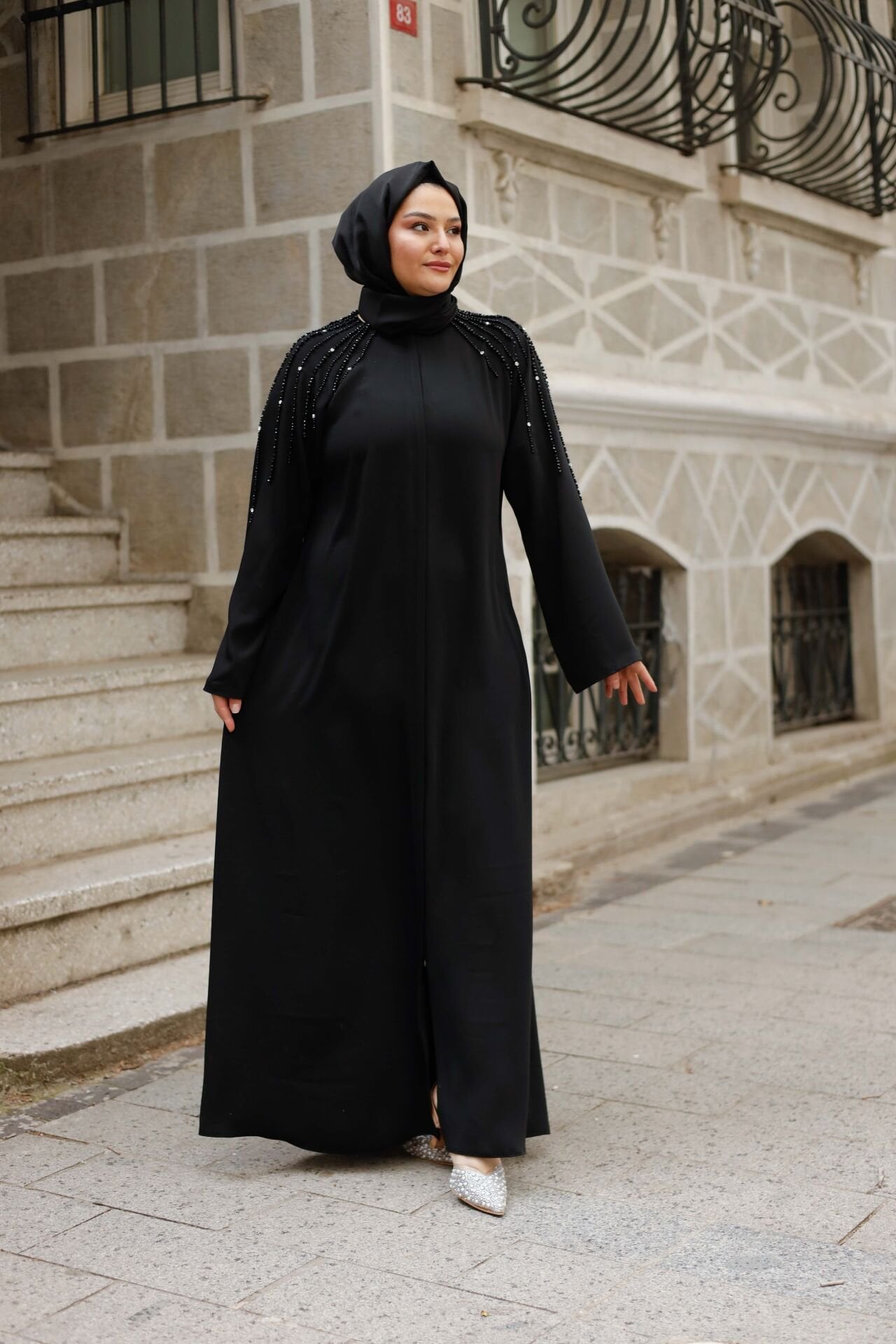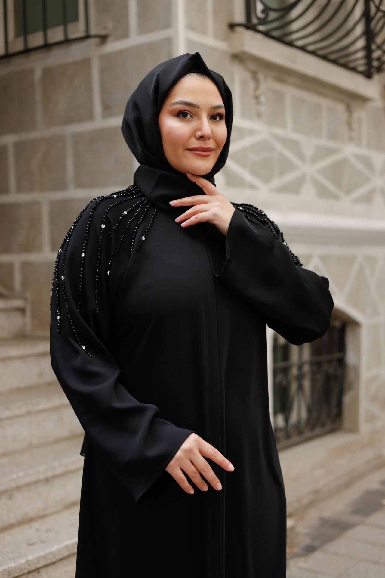Omuz İşlemeli Dubai İpeği Siyah Ferace