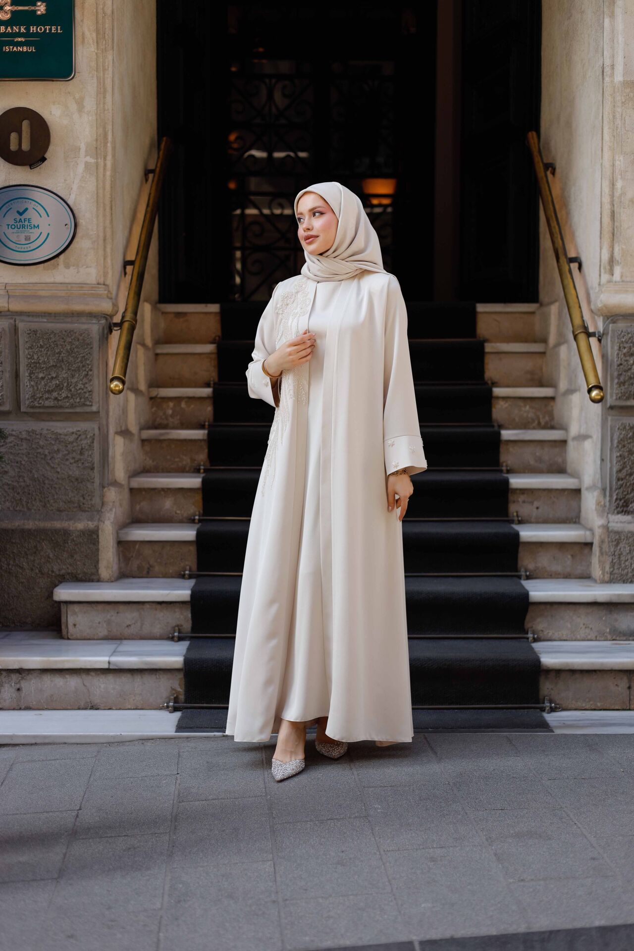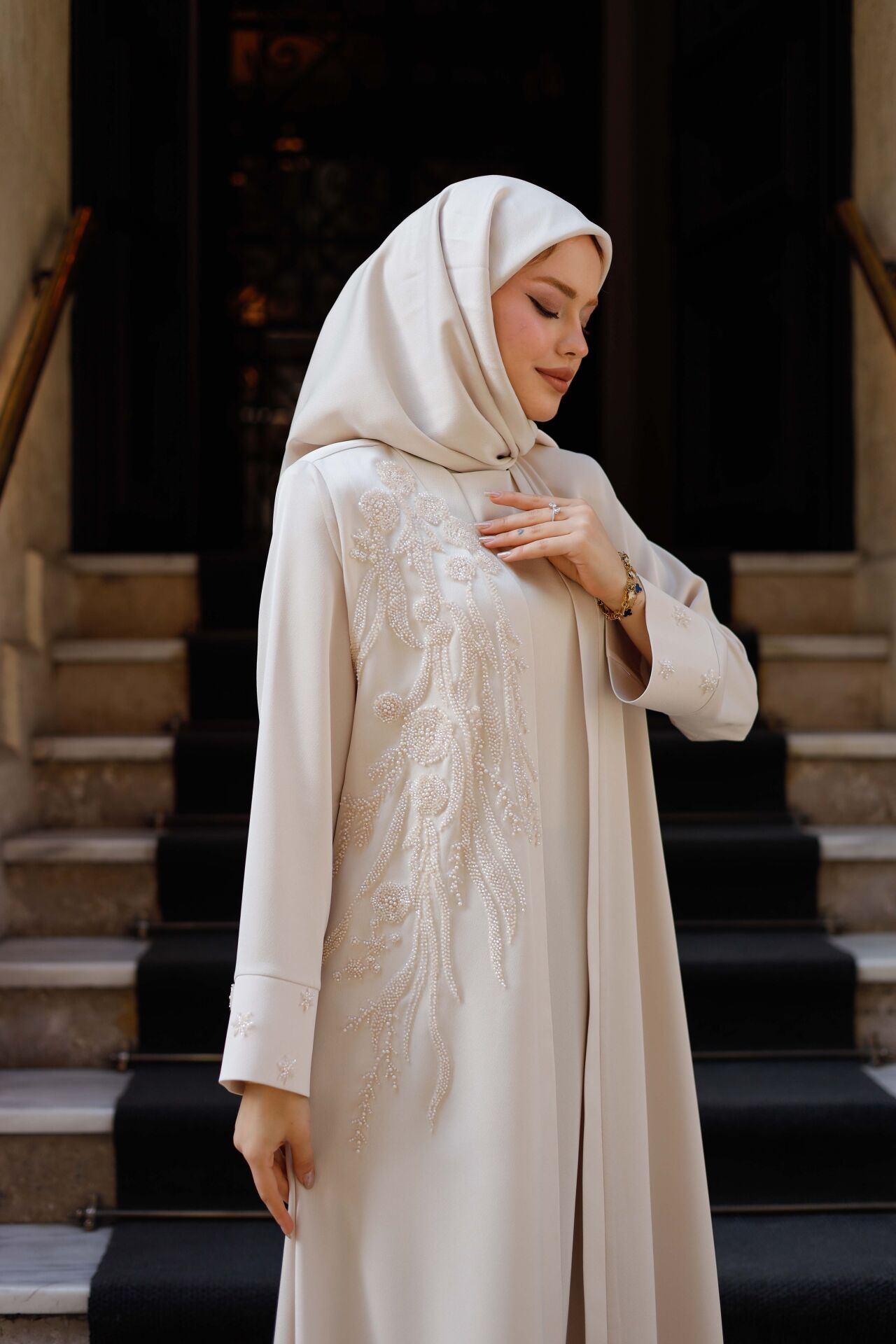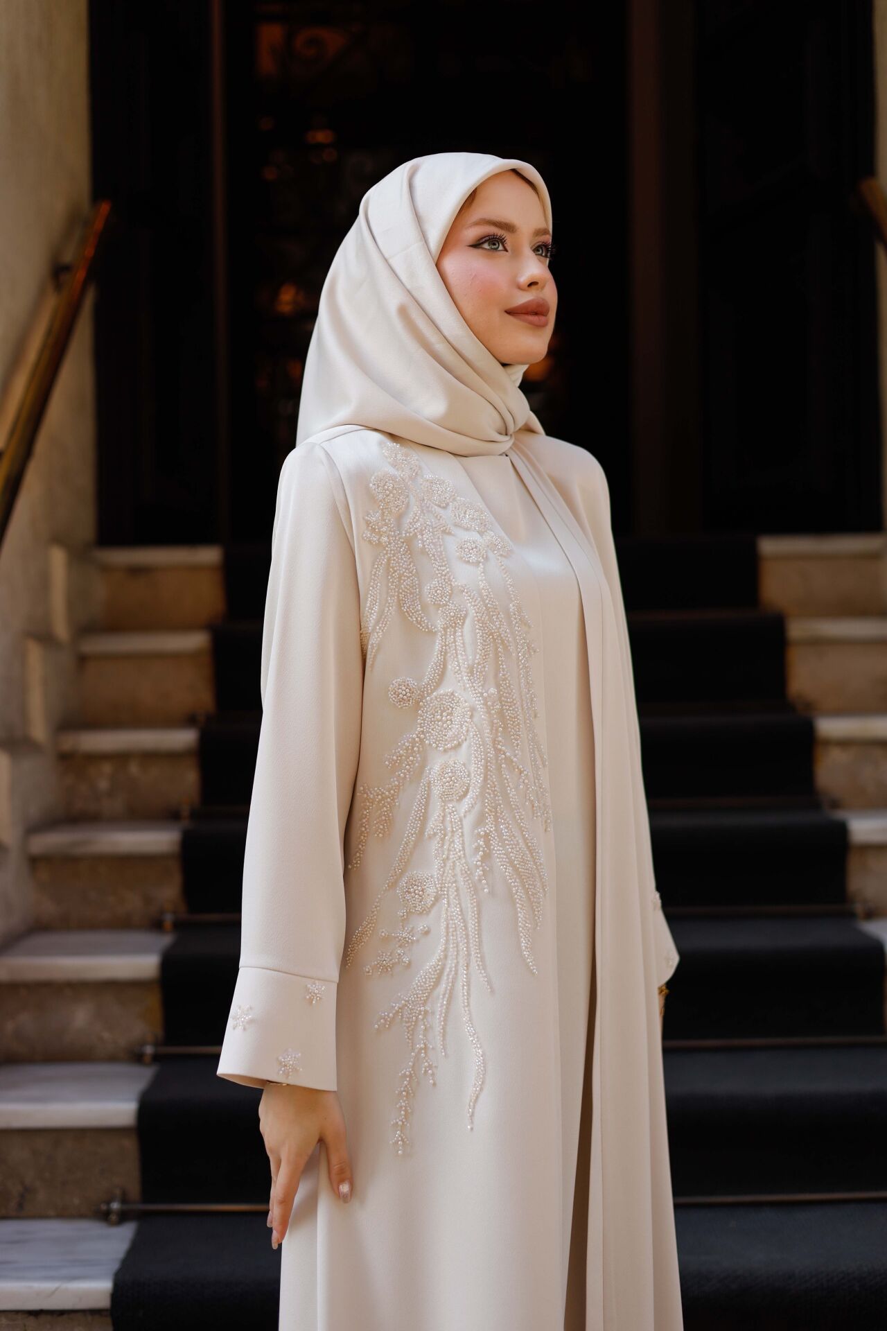 Sadeliğin zarafetle buluştuğu Öykü Abaya, özel kesimi ve dökümlü Abraham macro kumaşıyla stilinize zarif bir dokunuş katıyor. Krem tonuyla zamansız bir şıklık sunan bu tasarım, geniş beden aralığı sayesinde her vücut tipine hitap eder. Günlük kullanımdan özel davetlere kadar birçok ortamda şıklığınızı ön plana çıkarır.