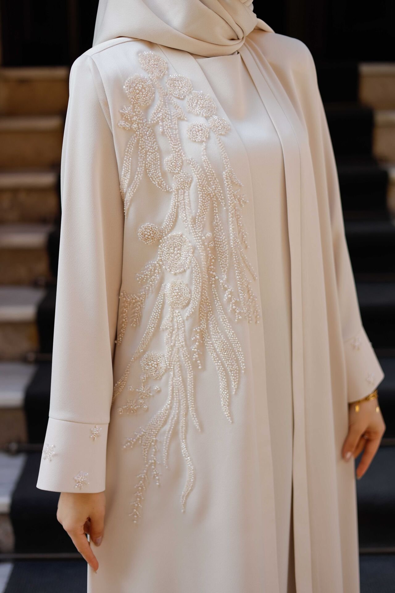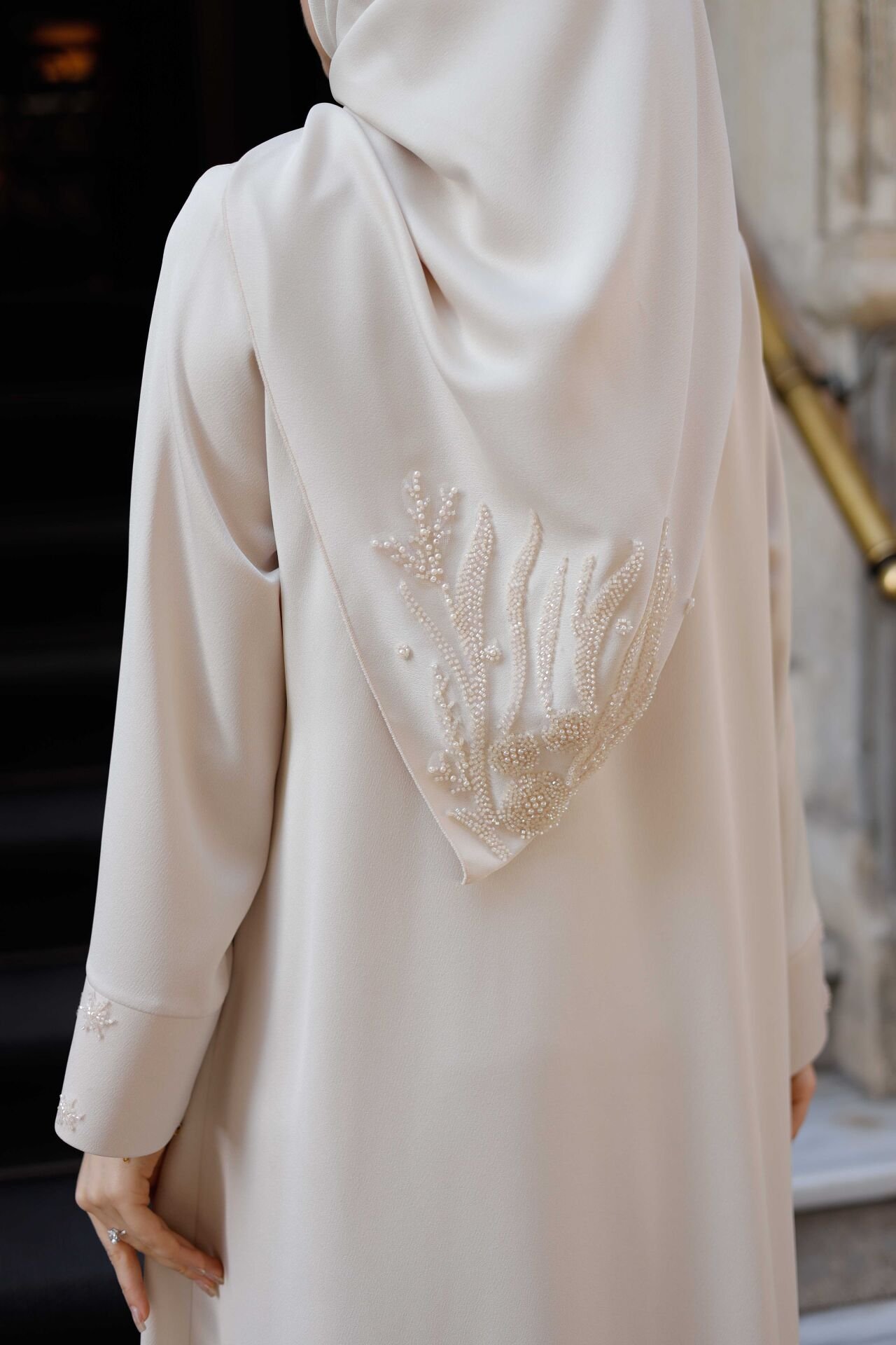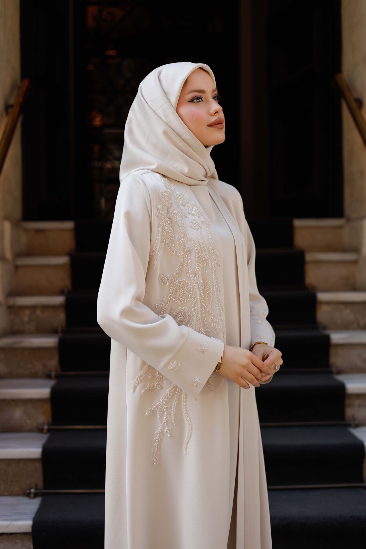 Sadeliğin zarafetle buluştuğu Öykü Abaya, özel kesimi ve dökümlü Abraham macro kumaşıyla stilinize zarif bir dokunuş katıyor. Krem tonuyla zamansız bir şıklık sunan bu tasarım, geniş beden aralığı sayesinde her vücut tipine hitap eder. Günlük kullanımdan özel davetlere kadar birçok ortamda şıklığınızı ön plana çıkarır.