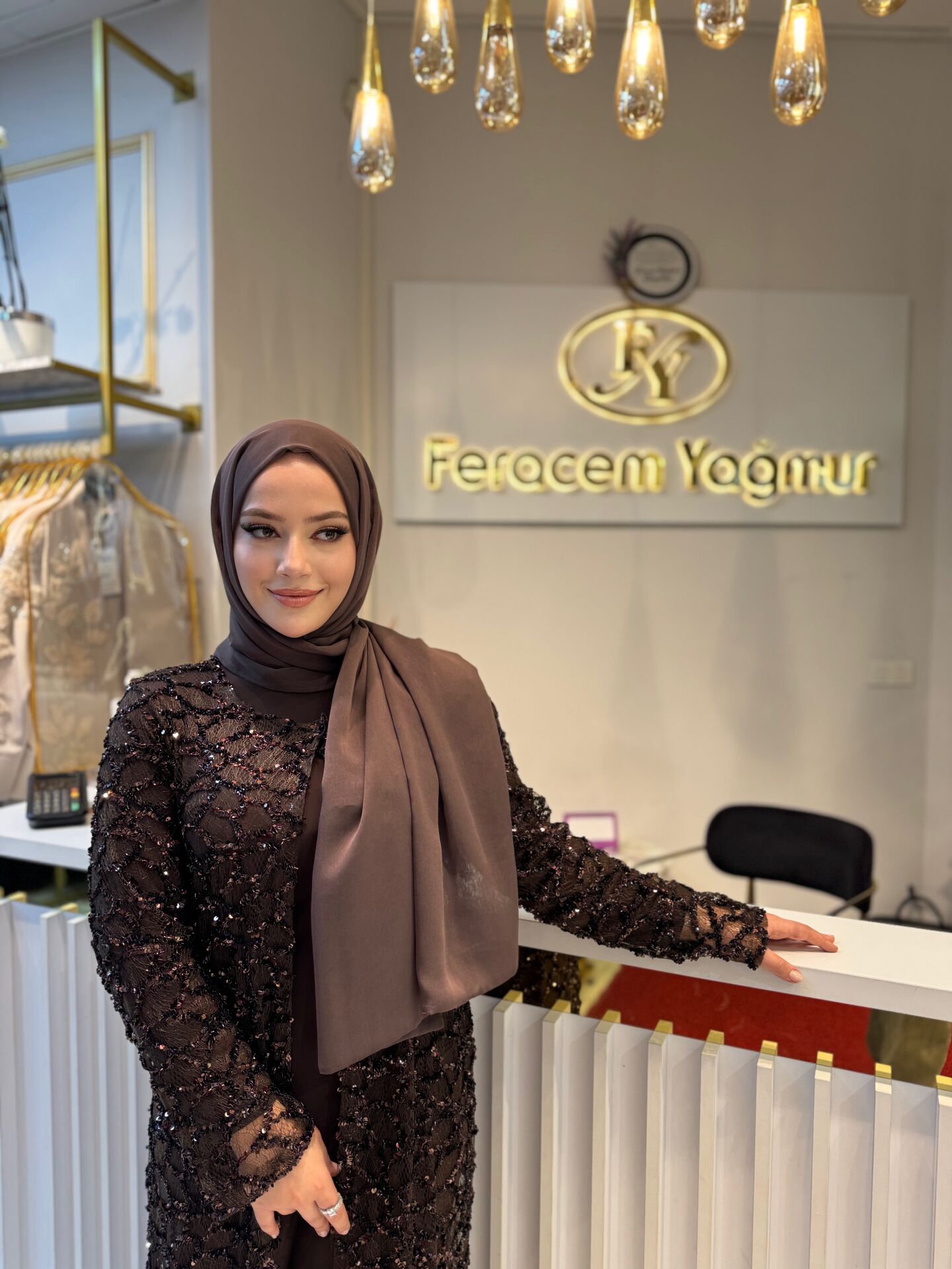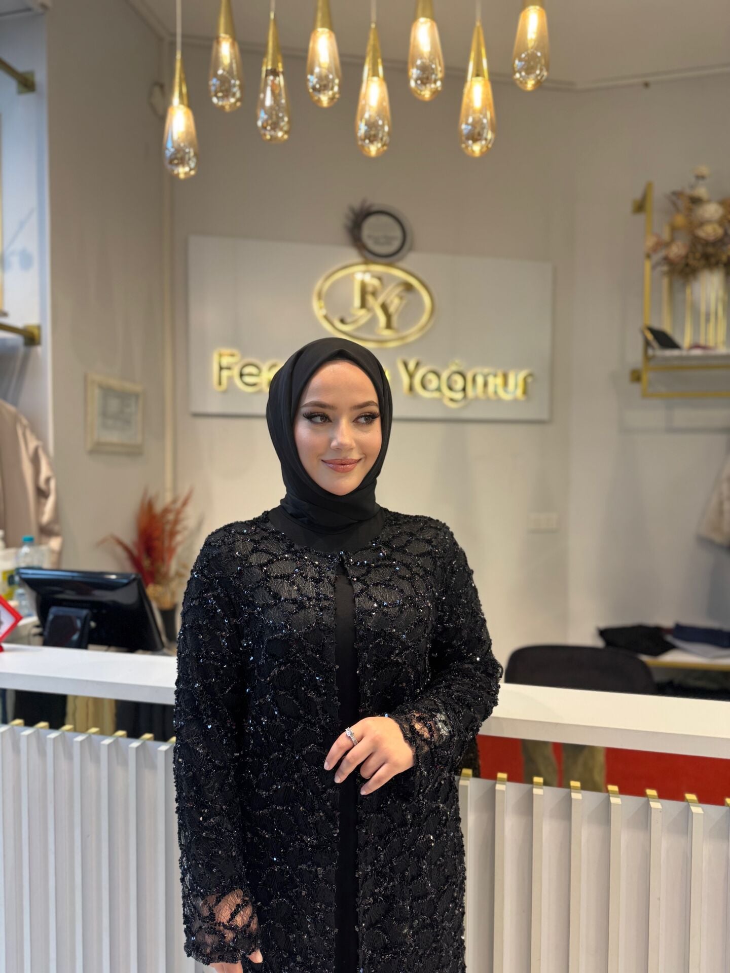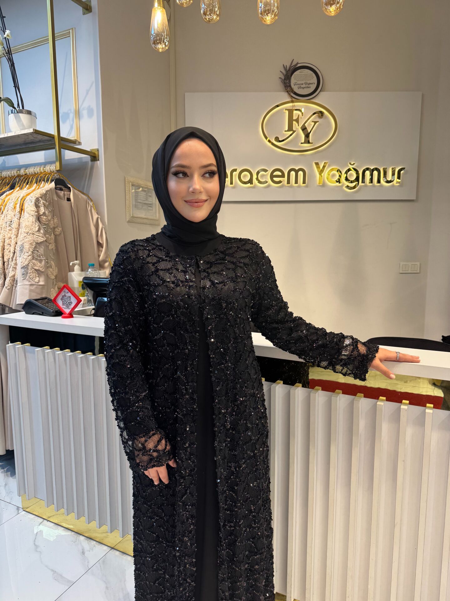 Feracem Yağmur’un en özel tasarımlarından biri olan Petek Pul Payet Abaya, geleneksel abaya şıklığını modern ve iddialı bir dokuyla buluşturuyor. Tüm gövdeye yayılan petek formundaki pul işlemeleri, özel davetlerde tüm bakışları üzerinize çekecek bir asalet sunuyor.