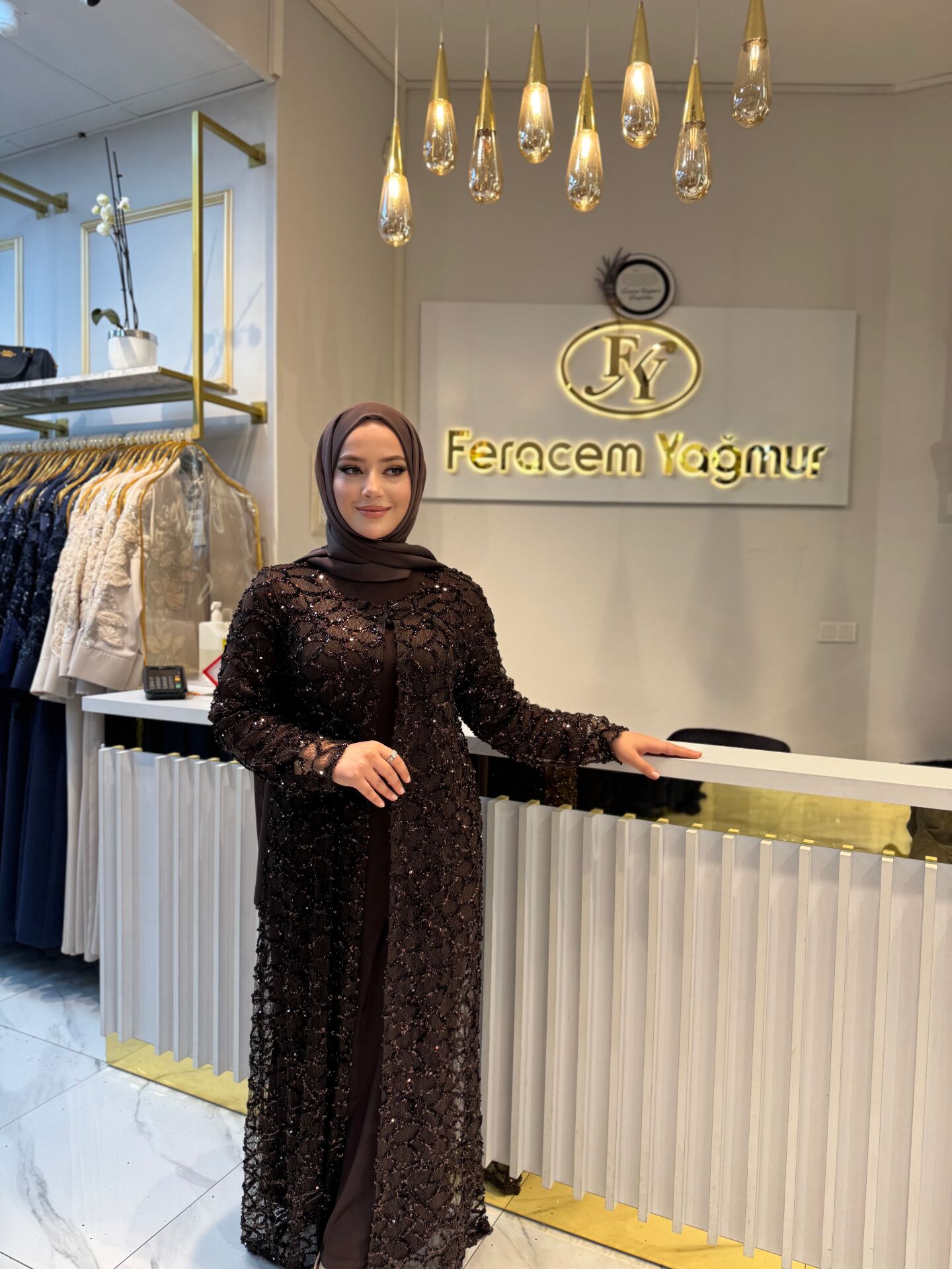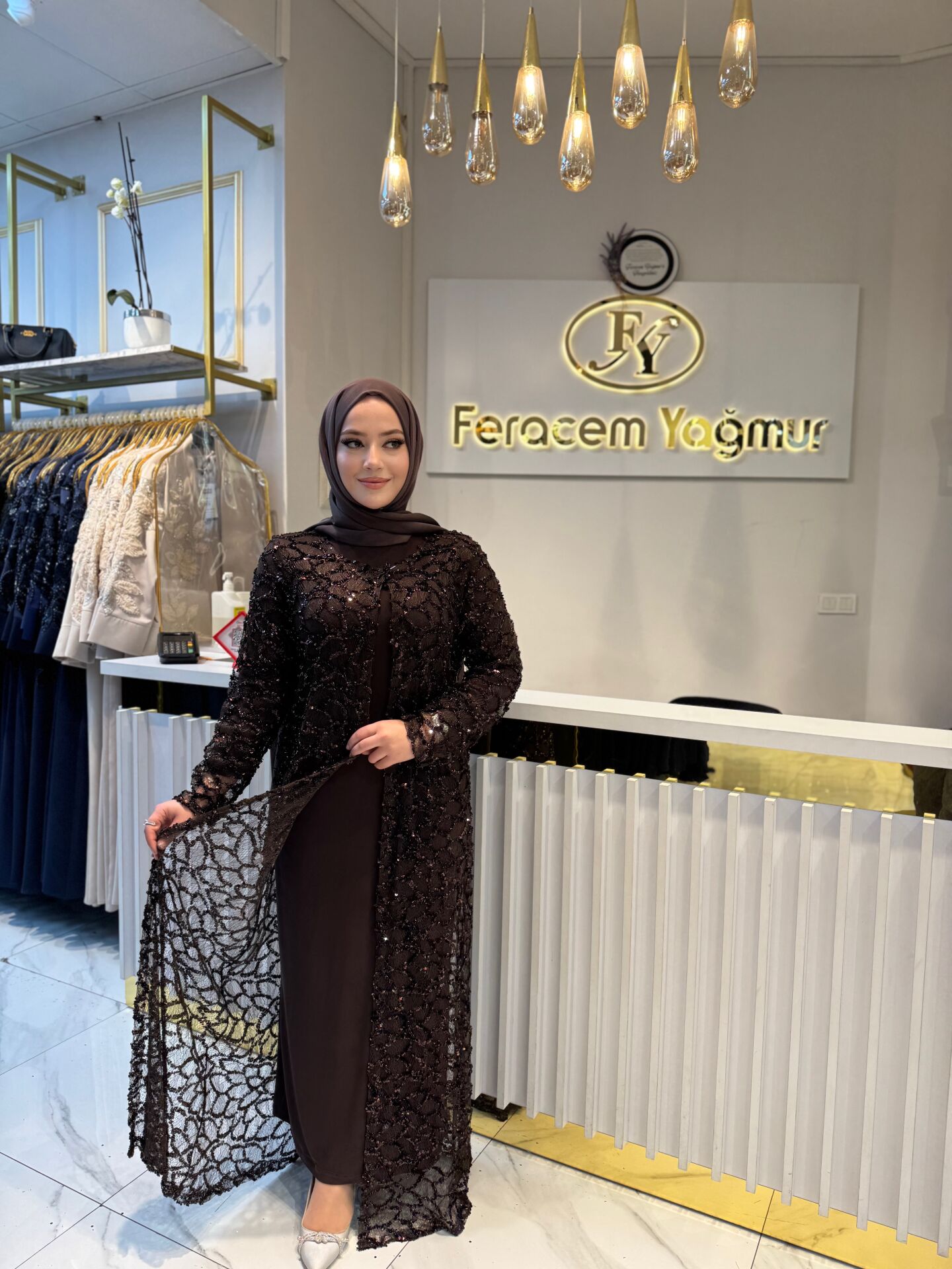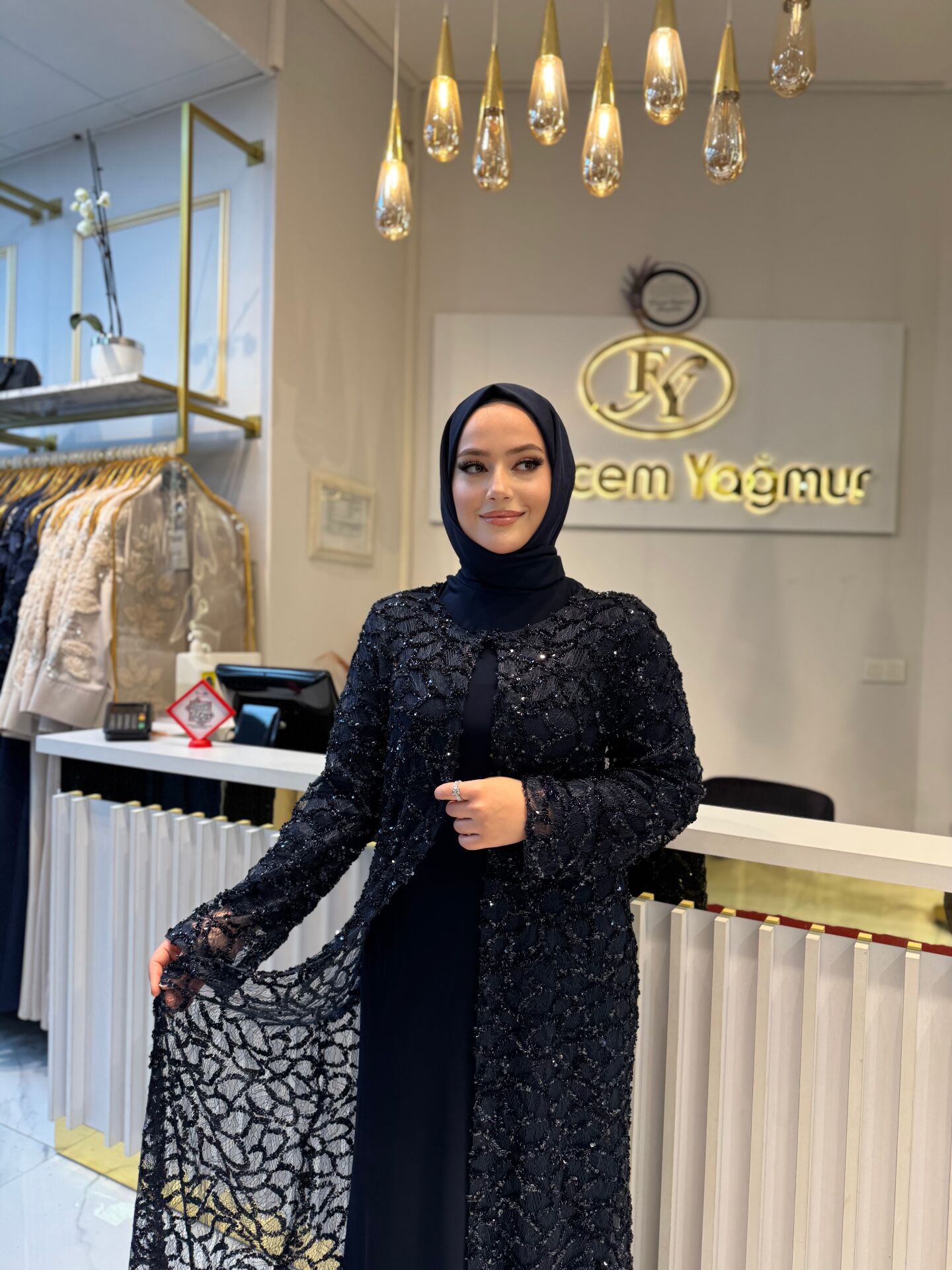 Feracem Yağmur’un en özel tasarımlarından biri olan Petek Pul Payet Abaya, geleneksel abaya şıklığını modern ve iddialı bir dokuyla buluşturuyor. Tüm gövdeye yayılan petek formundaki pul işlemeleri, özel davetlerde tüm bakışları üzerinize çekecek bir asalet sunuyor.