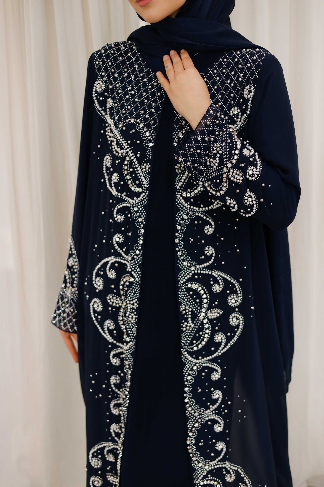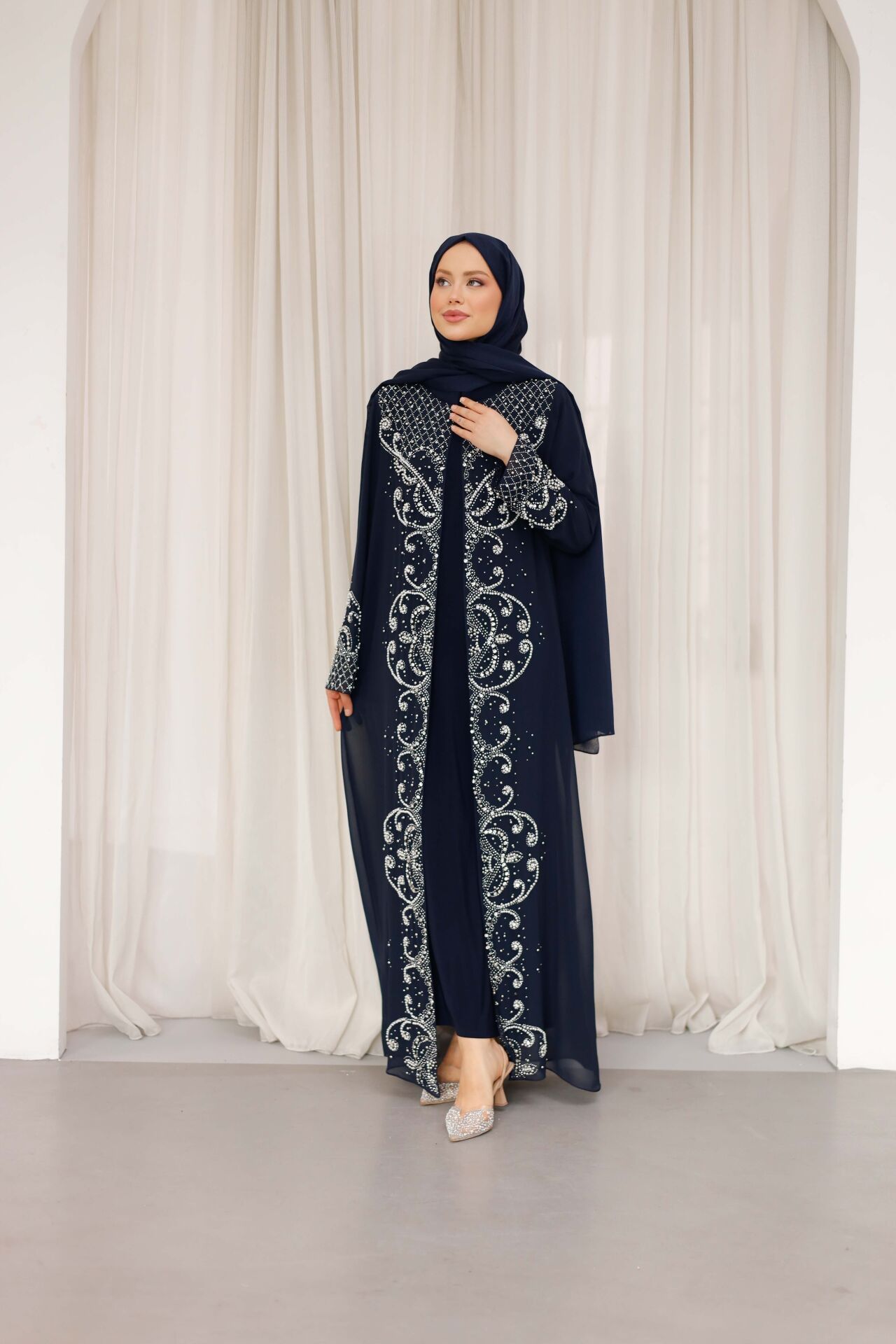 Şifon kumaşın hafif ve dökümlü yapısı sayesinde gün boyu konforlu bir kullanım sağlayan Selin Abaya, iç elbisesiyle birlikte kombinlenmiş özel bir tasarımdır. Tek parça şıklık sunan bu model; düğün, nişan, davet ve özel organizasyonlar için ideal bir tercihtir.