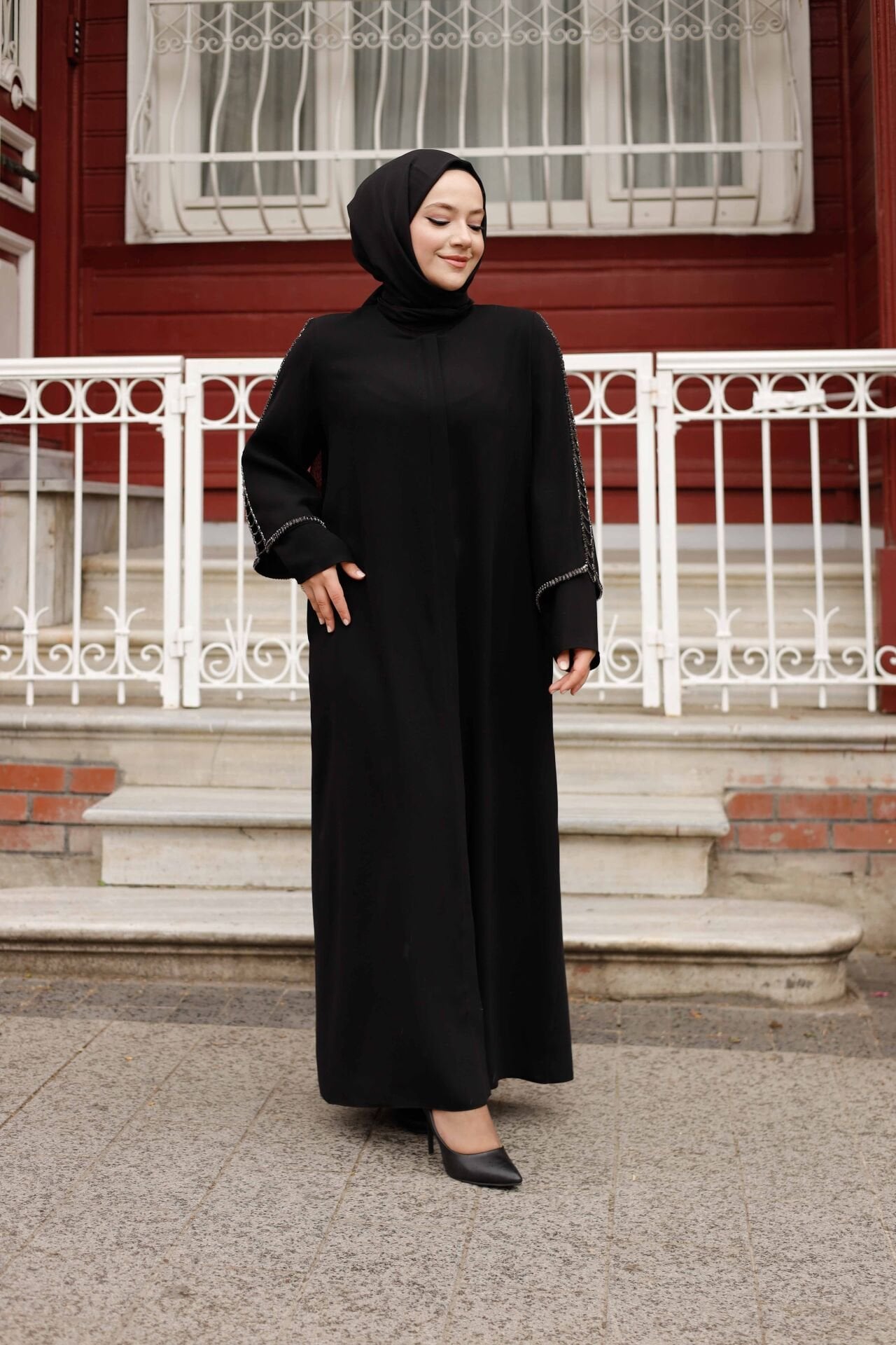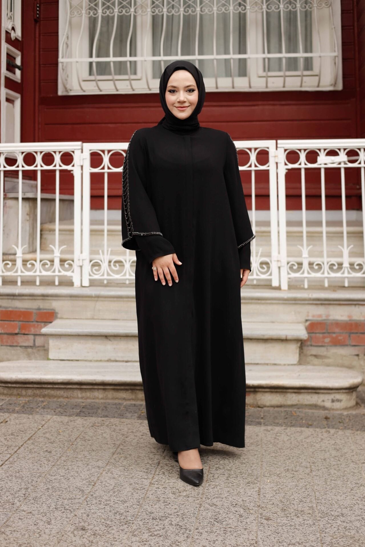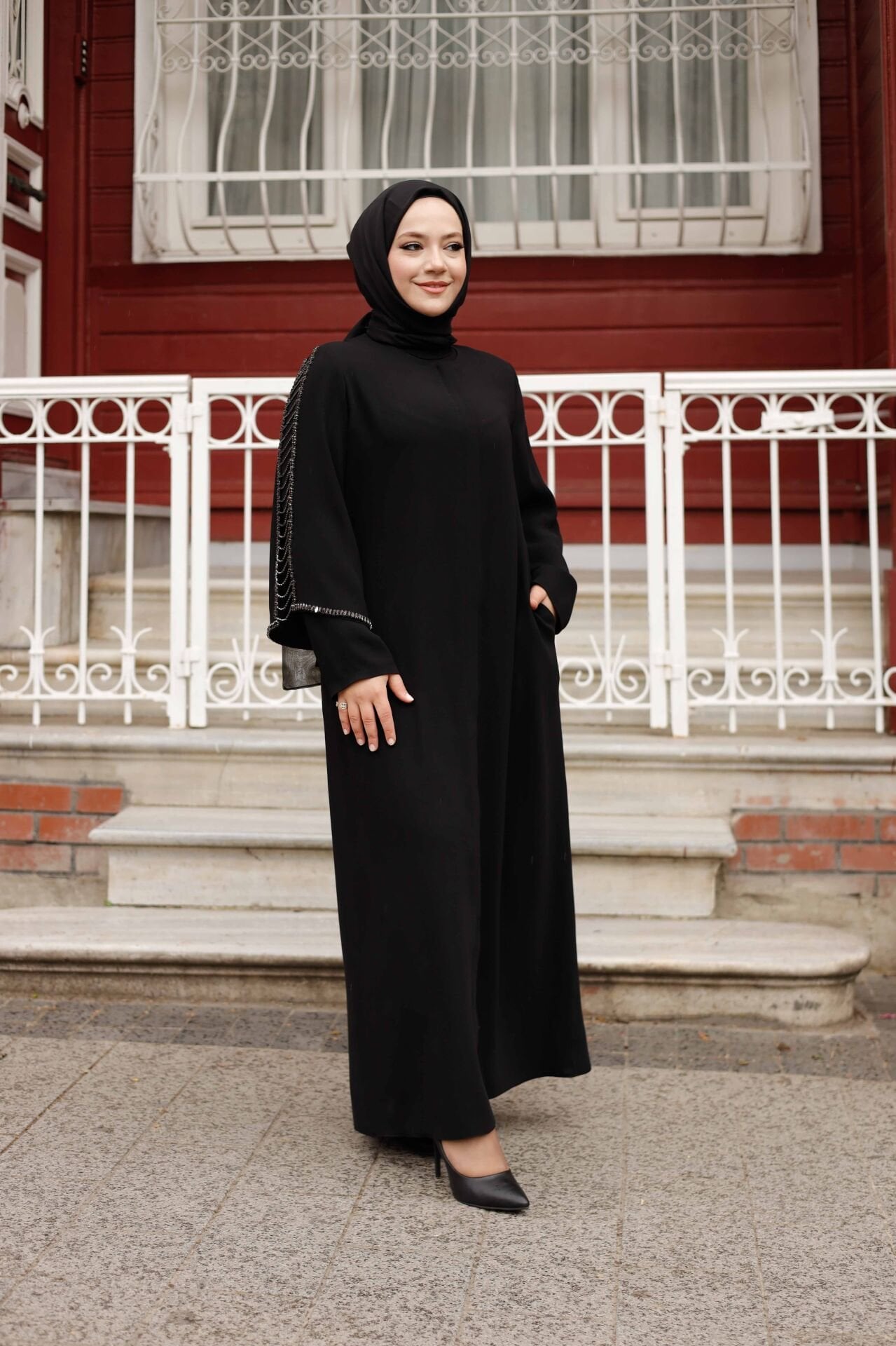 Sıralı Taş İşlemeli Dubai İpeği Ferace