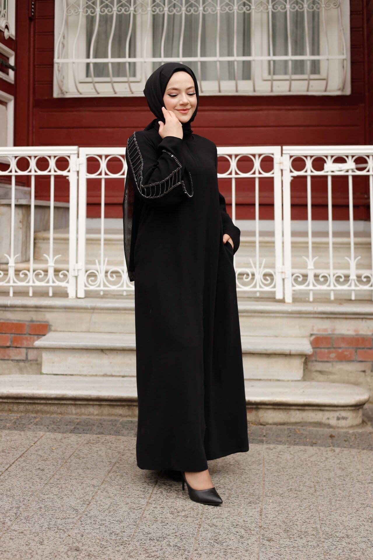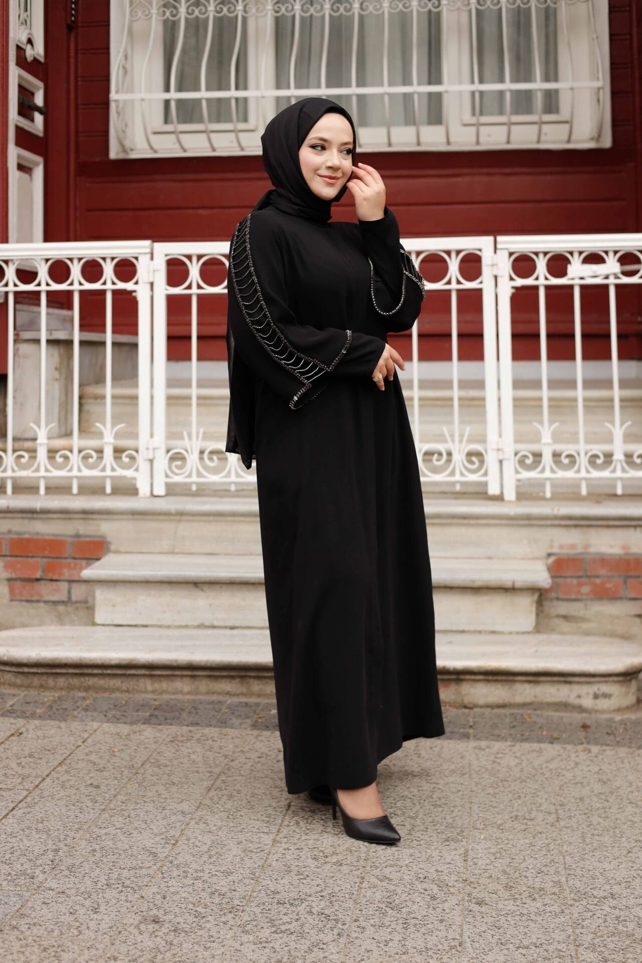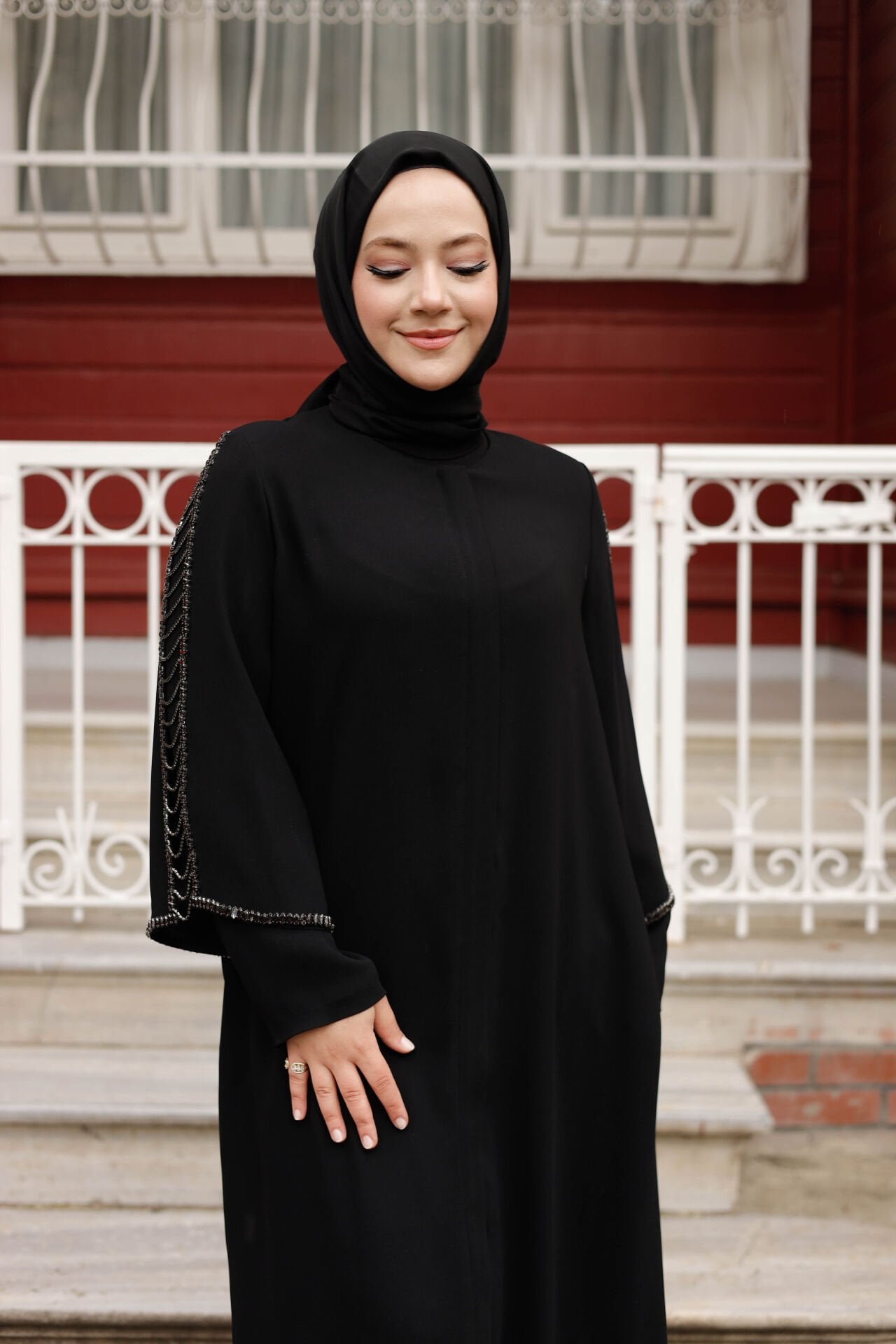 Sıralı Taş İşlemeli Dubai İpeği Ferace
