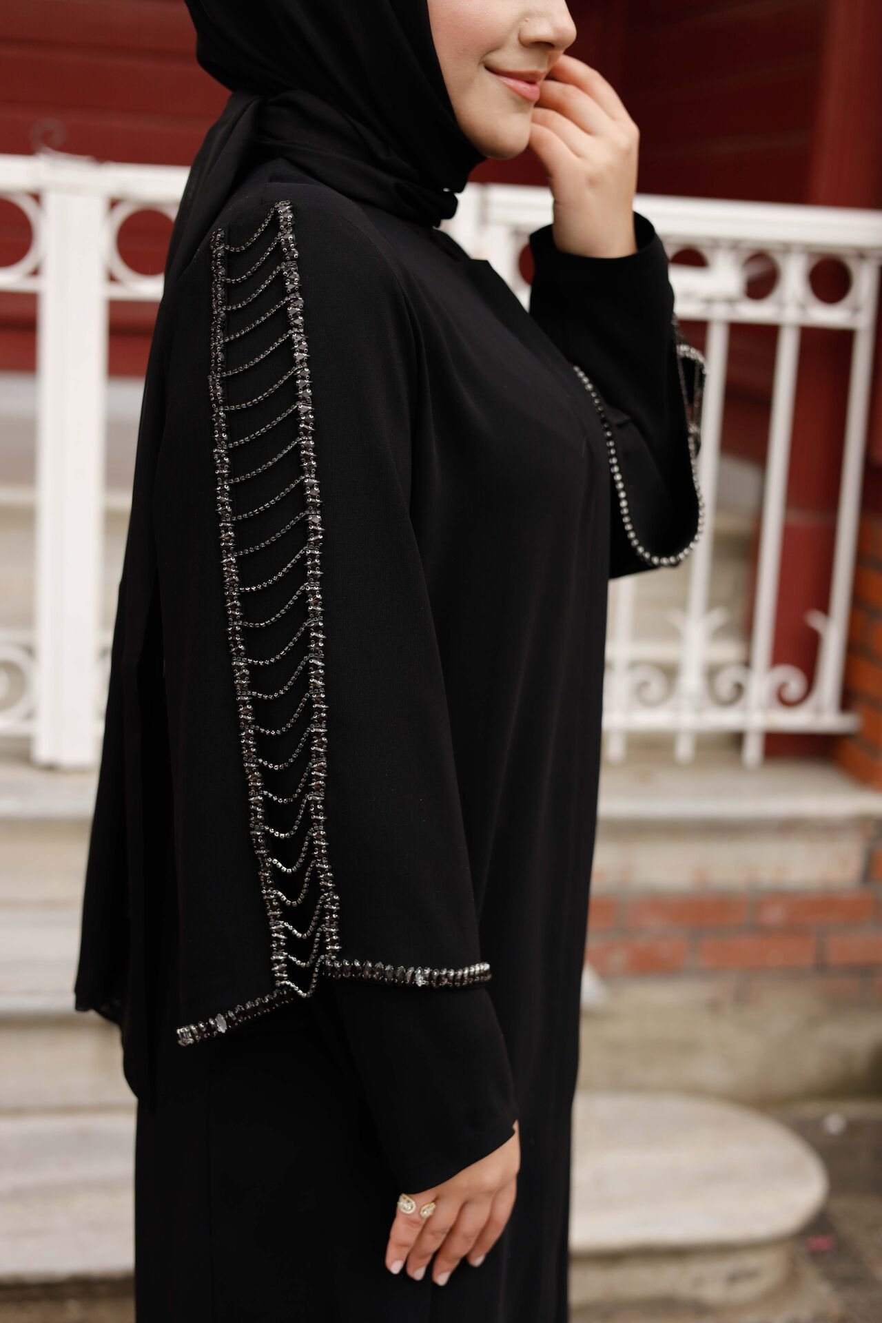 Feracem Yağmur koleksiyonunun en sevilen parçalarından biri olan Omuzdan Kol Ucuna Zincir Taşlı Ferace, asaleti detaylarda arayanlar için tasarlandı. Dubai İpeği kumaşının eşsiz dökümü ve kollarındaki kristal taş işçiliği ile hem davetlerde hem de şık günlük kombinlerinizde fark yaratın.