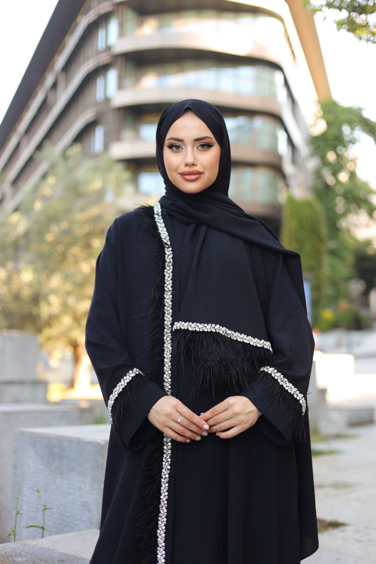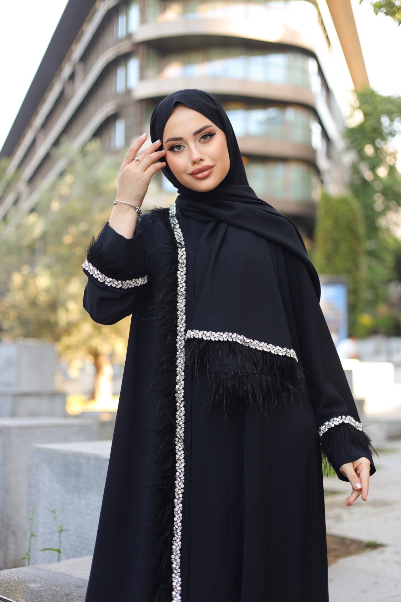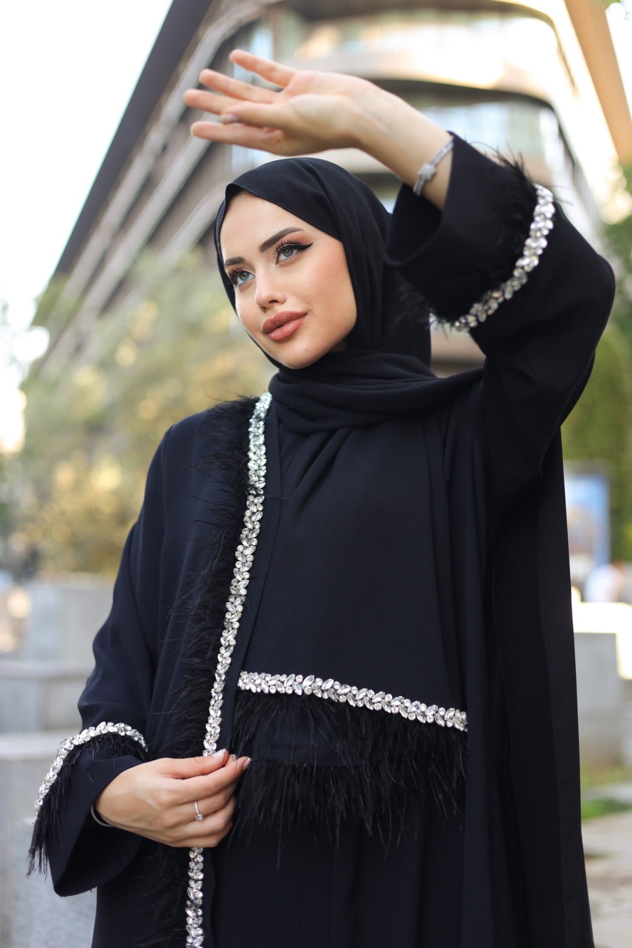 Bu tasarım şerit abaya, zarif görünümüyle dikkat çekiyor. Yüksek kaliteli krep kumaştan yapılmış olan abayayı her mevsim rahatlıkla giyebilirsiniz. İnce detaylar ve modern tasarımıyla öne çıkan bu abaya, her türlü özel etkinlikte şıklığınızı tamamlayacak.
