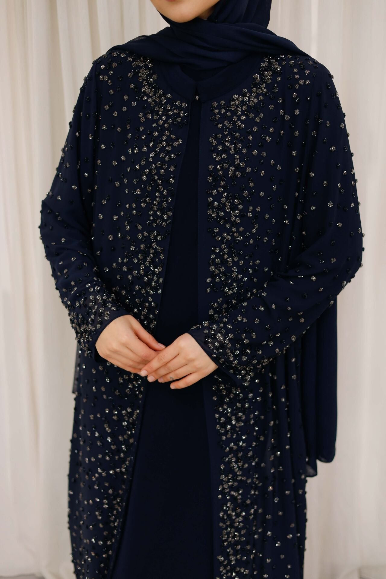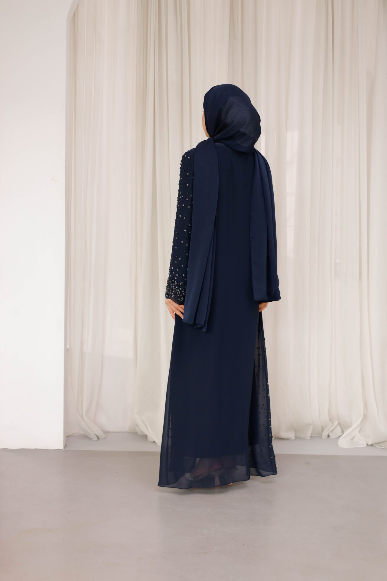 Siyah ve lacivert renk seçenekleriyle zamansız bir şıklık sunan bu model, geniş beden aralığı sayesinde farklı vücut tiplerine uyum sağlar. Minimal, zarif ve güçlü bir duruş arayanlar için tasarlanan Tuğba Şifon Abaya, Feracem Yağmur koleksiyonunun öne çıkan parçalarındandır.