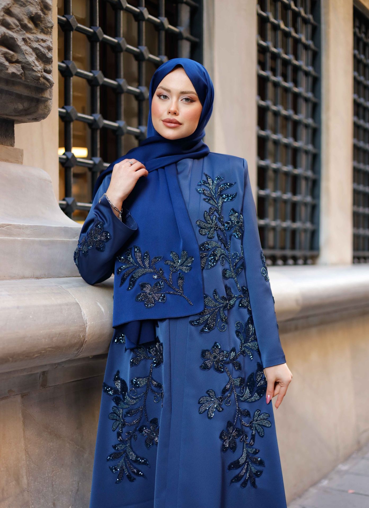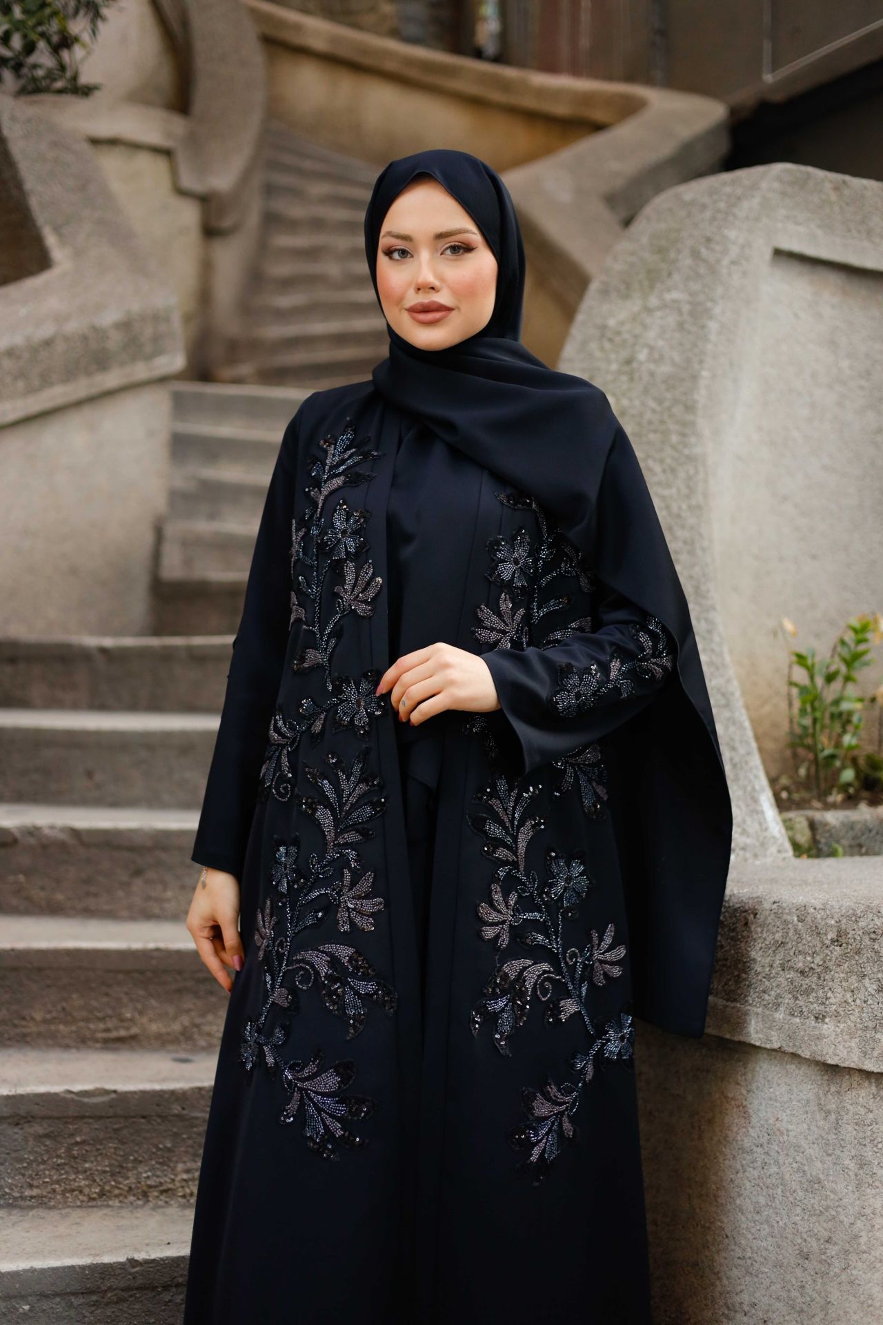 Şıklığı ve zarafeti bir arada sunan Yaprak Desenli Abaya, abraham kumaşının kaliteli dokusu ile konforlu bir kullanım sağlar. Hem günlük kullanımda hem de özel davetlerde şıklığınızı tamamlayacak bu abaya, 38 bedenden 60 bedene kadar geniş bir beden aralığına sahiptir. Siyah ve mavi renk seçenekleri ile her tarza uyum sağlarken, modern yaprak desenleriyle zarif ve sofistike bir görünüm elde edersiniz.