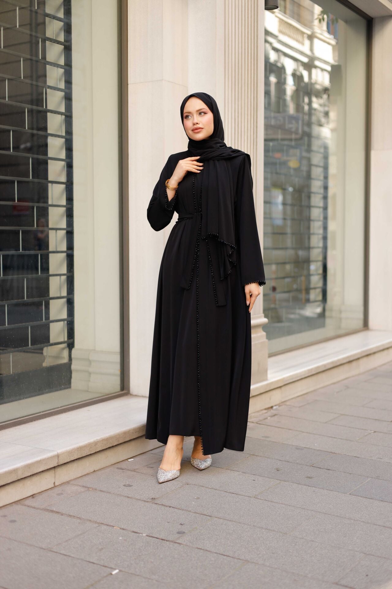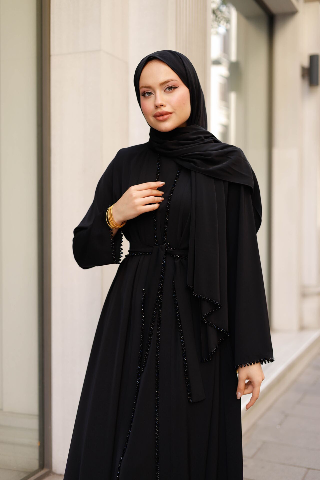 Göz alıcı zarafetiyle öne çıkan Zehra Abaya Takım, incelikle işlenmiş siyah boncuk detayları ve dökümlü yapısıyla stilinize asil bir dokunuş katıyor. Dubai ipeğinin lüks dokusu, hafifliği ve akıcılığı ile hem gündüz hem de davet şıklığı için mükemmel bir tercih.