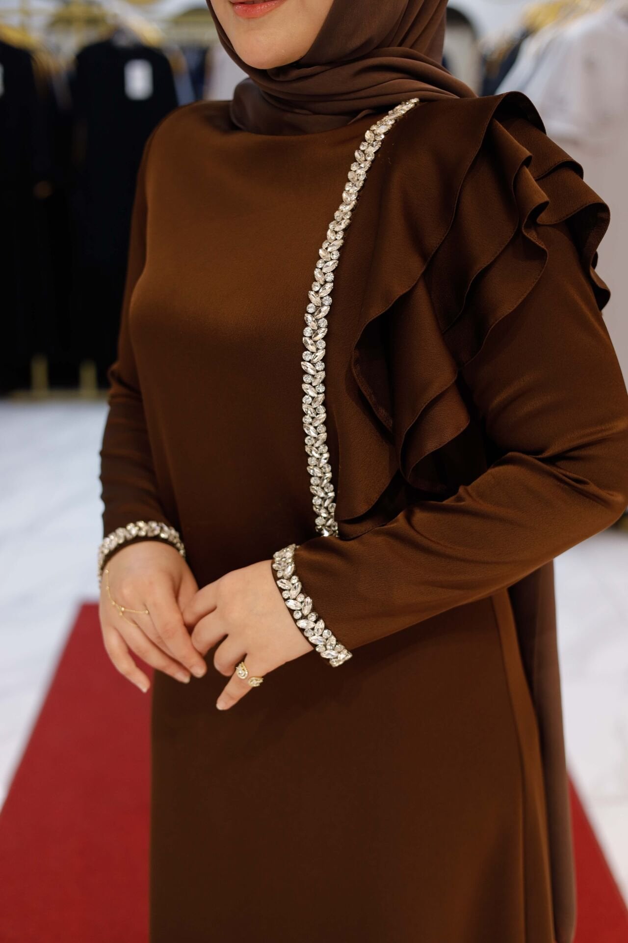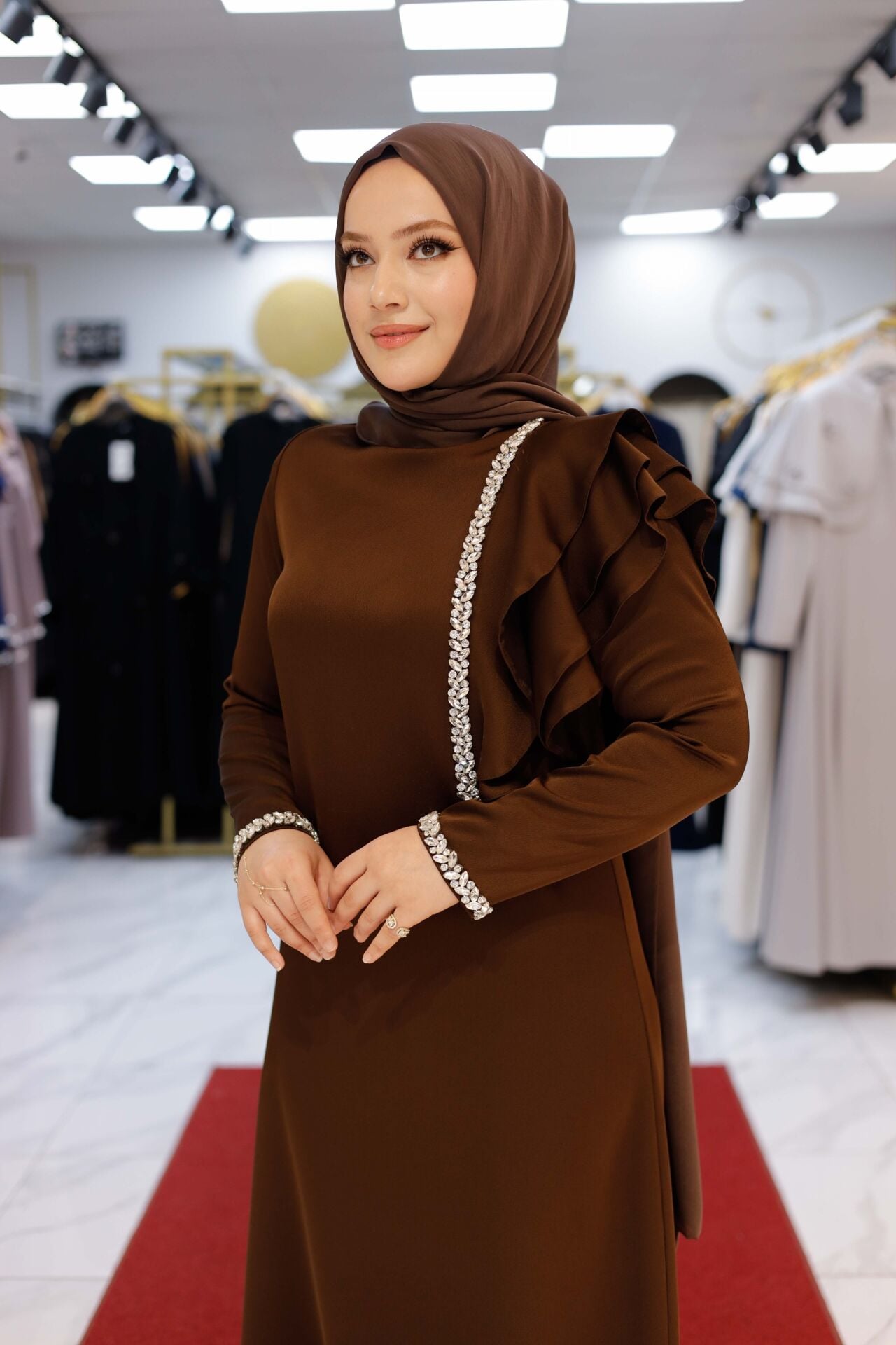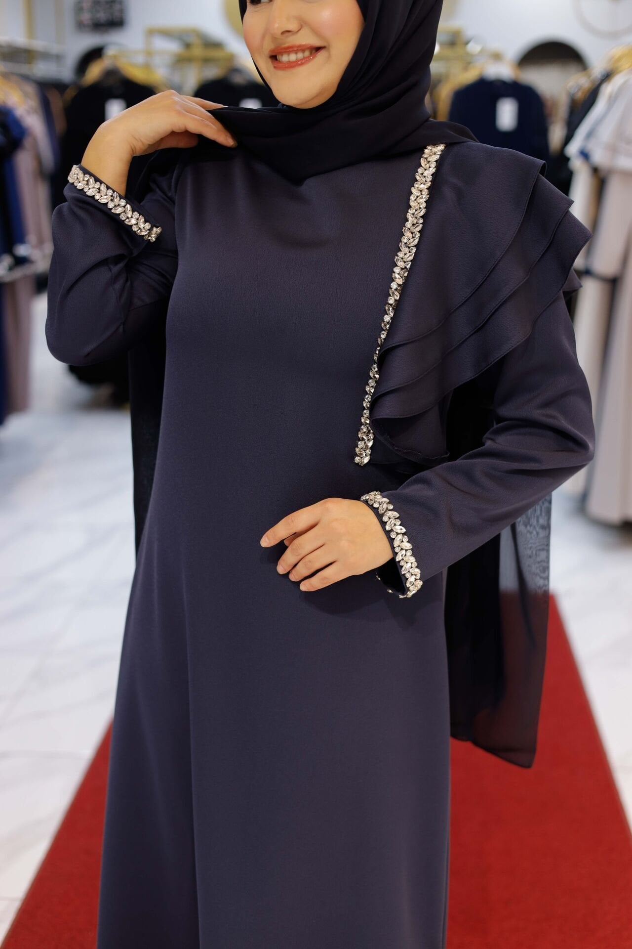 Zümra Tesettür Elbisenin en karakteristik özelliği, omuz hattından göğüs paneline doğru zarif bir kavisle inen katlı volan detaylarıdır. Bu hareketli yapı tasarıma derinlik kazandırırken, ön panelde ve kol manşetlerinde yer alan kristal taş işlemeleri elbiseye kendinden bir ışıltı katar. Zümra Tesettür Elbisede Ekstra takı kullanımına ihtiyaç bırakmayan bu detaylar, kumaşın mat ve kaliteli dokusuyla mükemmel bir uyum sergiler.
