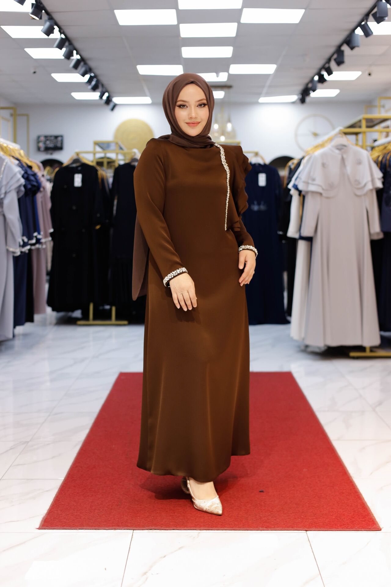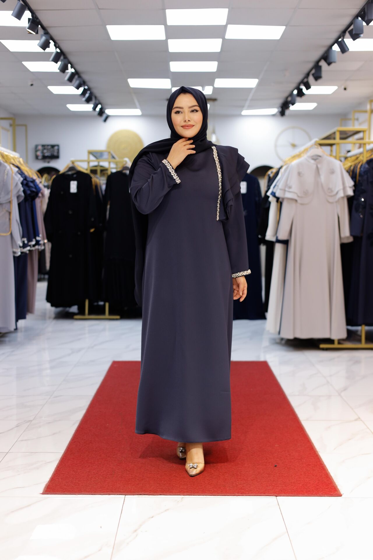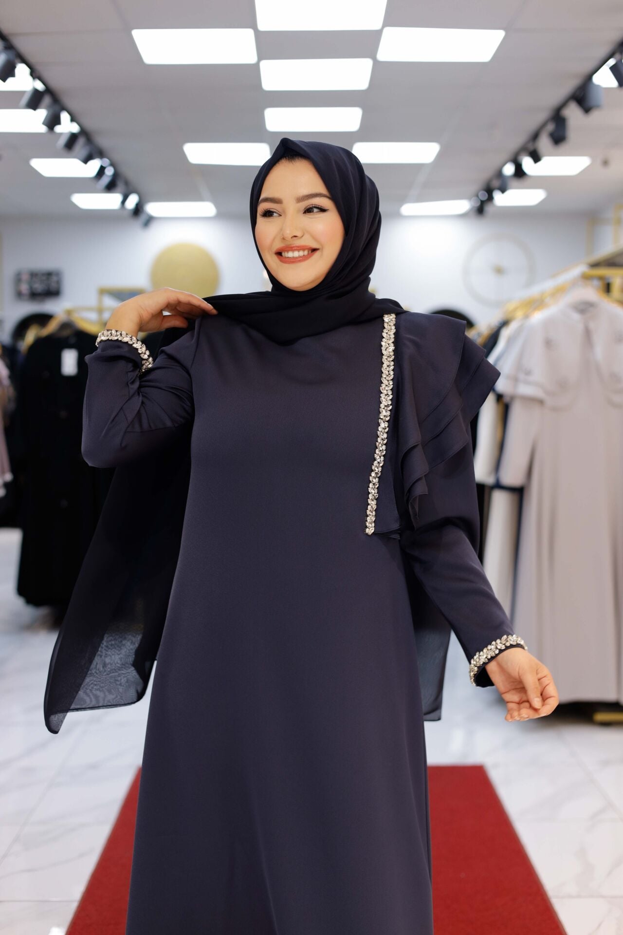 Zümra Tesettür Elbisenin en karakteristik özelliği, omuz hattından göğüs paneline doğru zarif bir kavisle inen katlı volan detaylarıdır. Bu hareketli yapı tasarıma derinlik kazandırırken, ön panelde ve kol manşetlerinde yer alan kristal taş işlemeleri elbiseye kendinden bir ışıltı katar. Zümra Tesettür Elbisede Ekstra takı kullanımına ihtiyaç bırakmayan bu detaylar, kumaşın mat ve kaliteli dokusuyla mükemmel bir uyum sergiler.